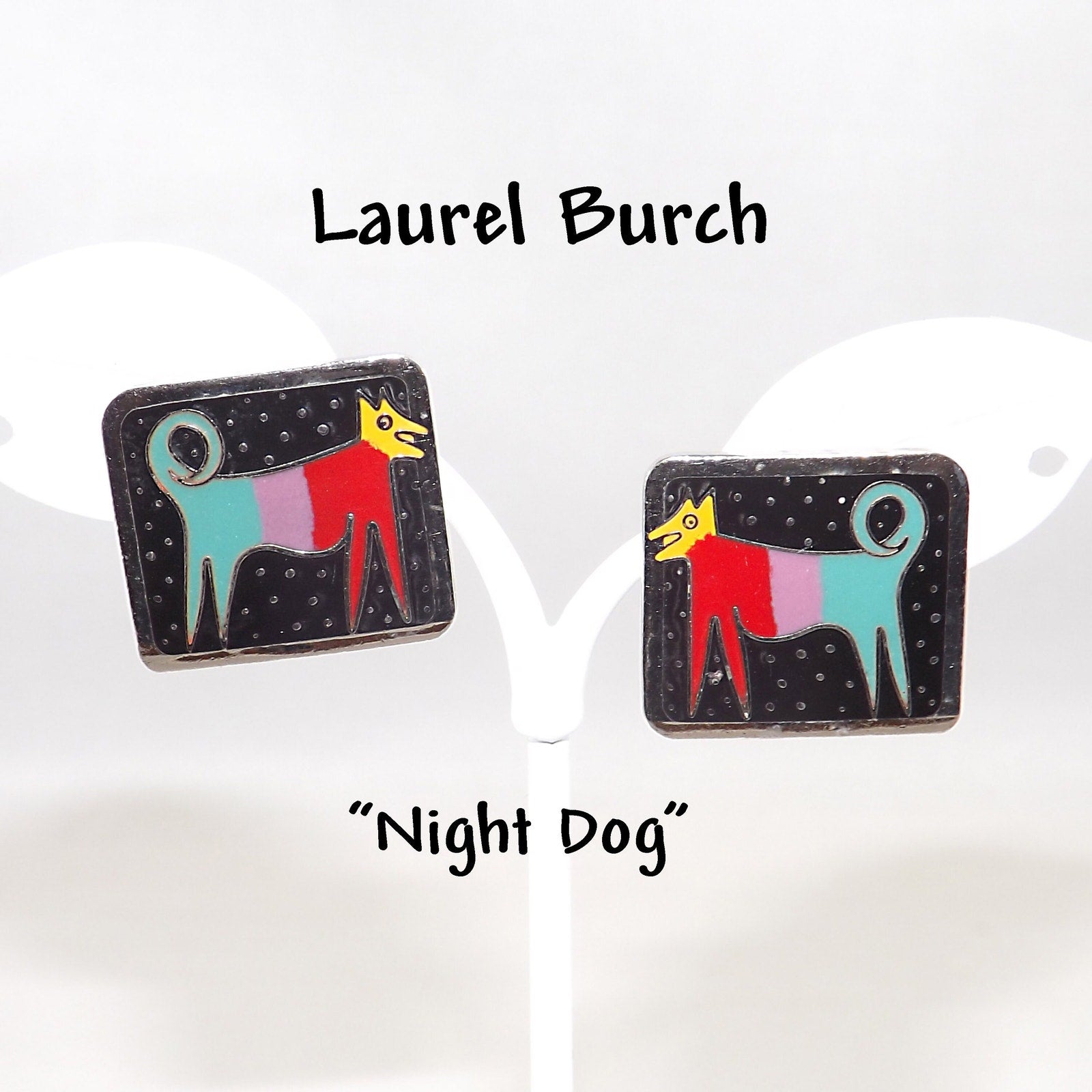 *Description: This is a beautiful pair of Laurel Burch post earrings entitled "Night Dog". The dog is set in a silver tone metal with the cloisonne technique using black enamel as a background with silver stars. The dog has a yellow head with a red, lavender, and then teal body. This is a perfect set of earrings for the animal or dog lover.