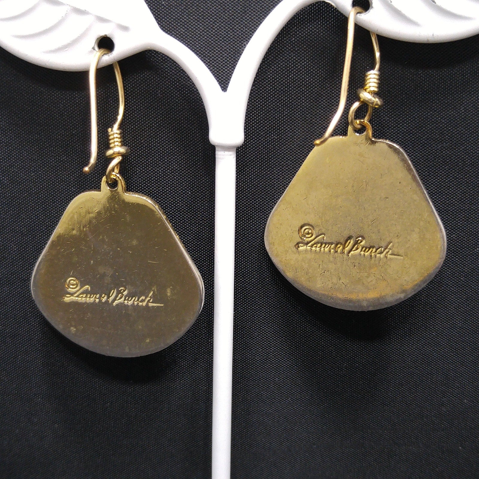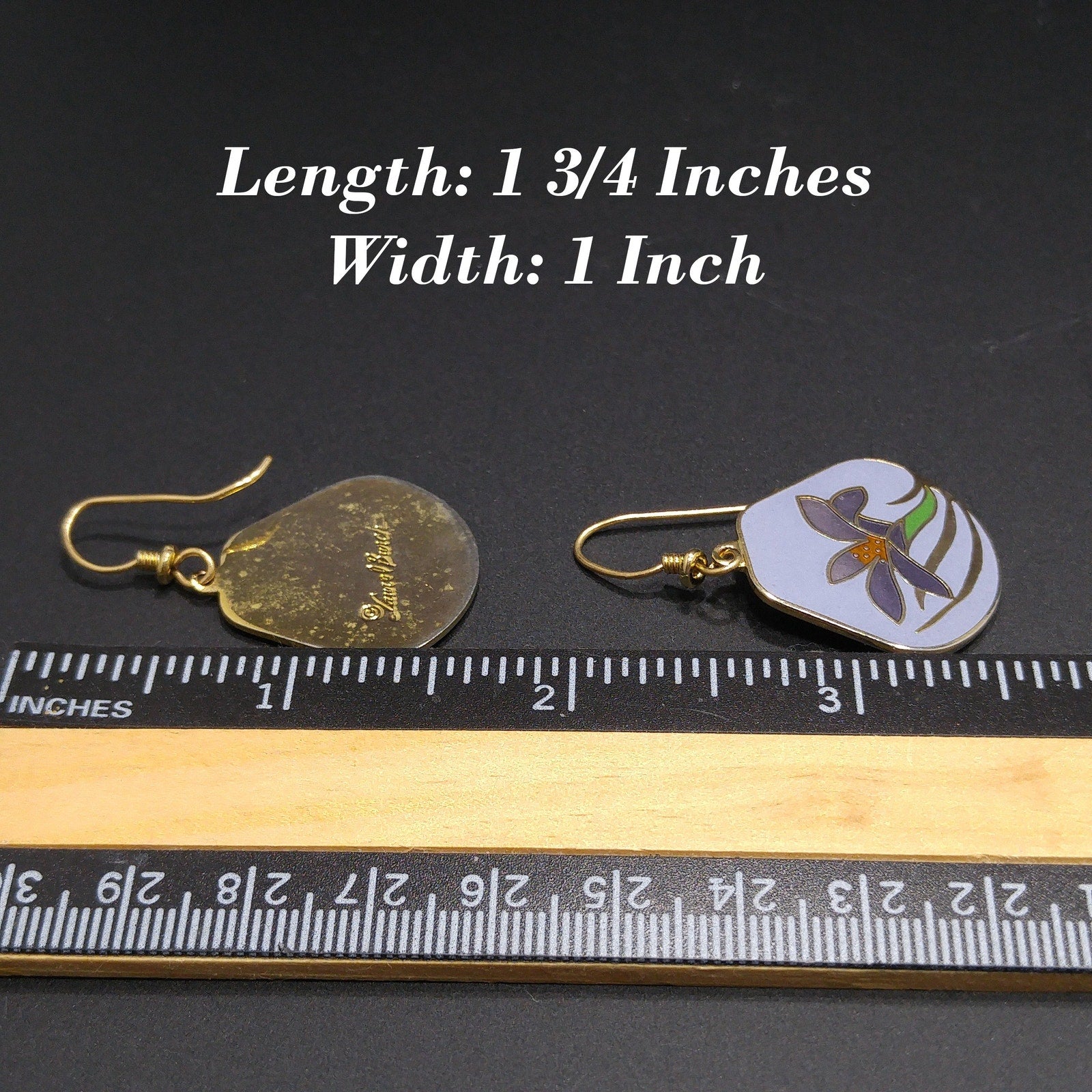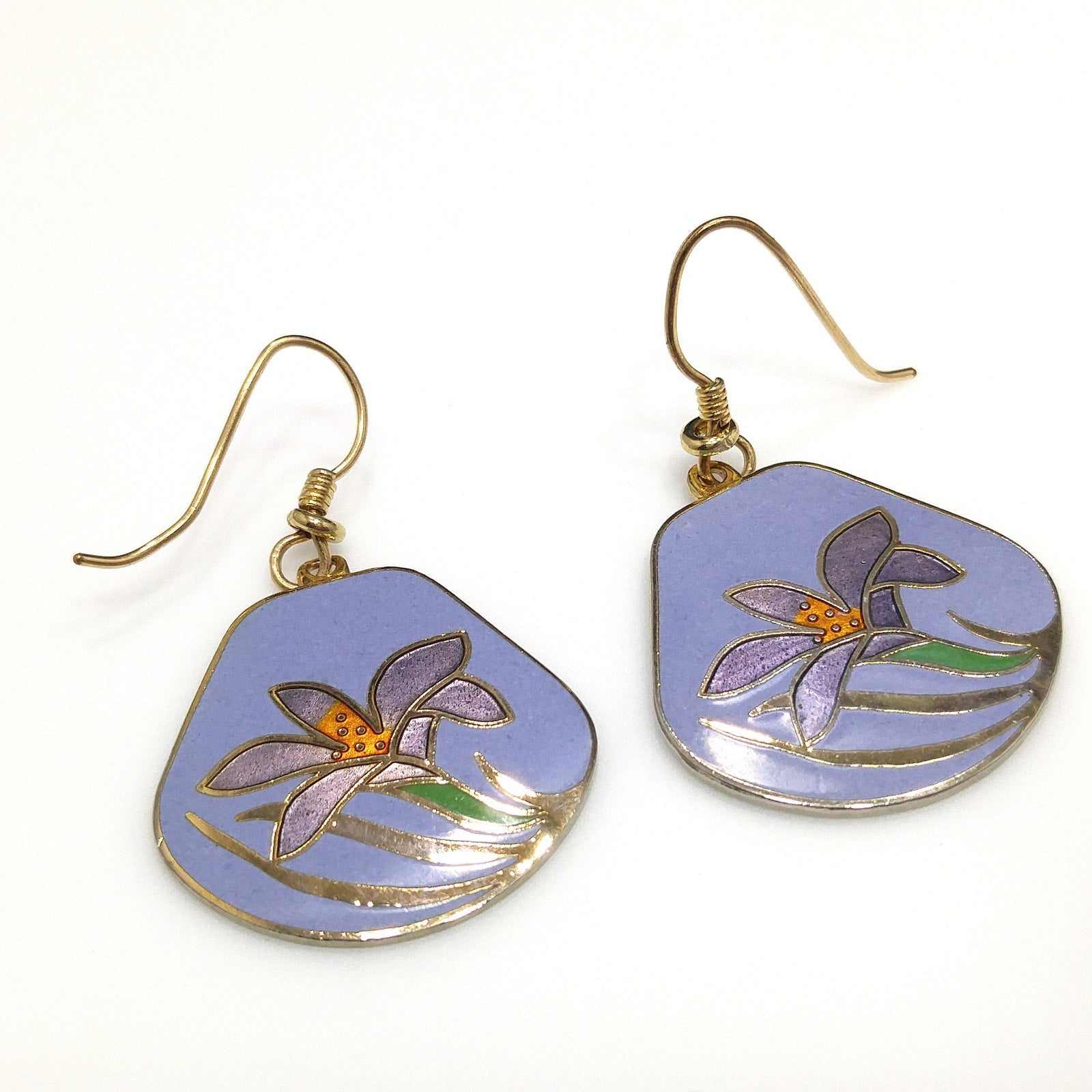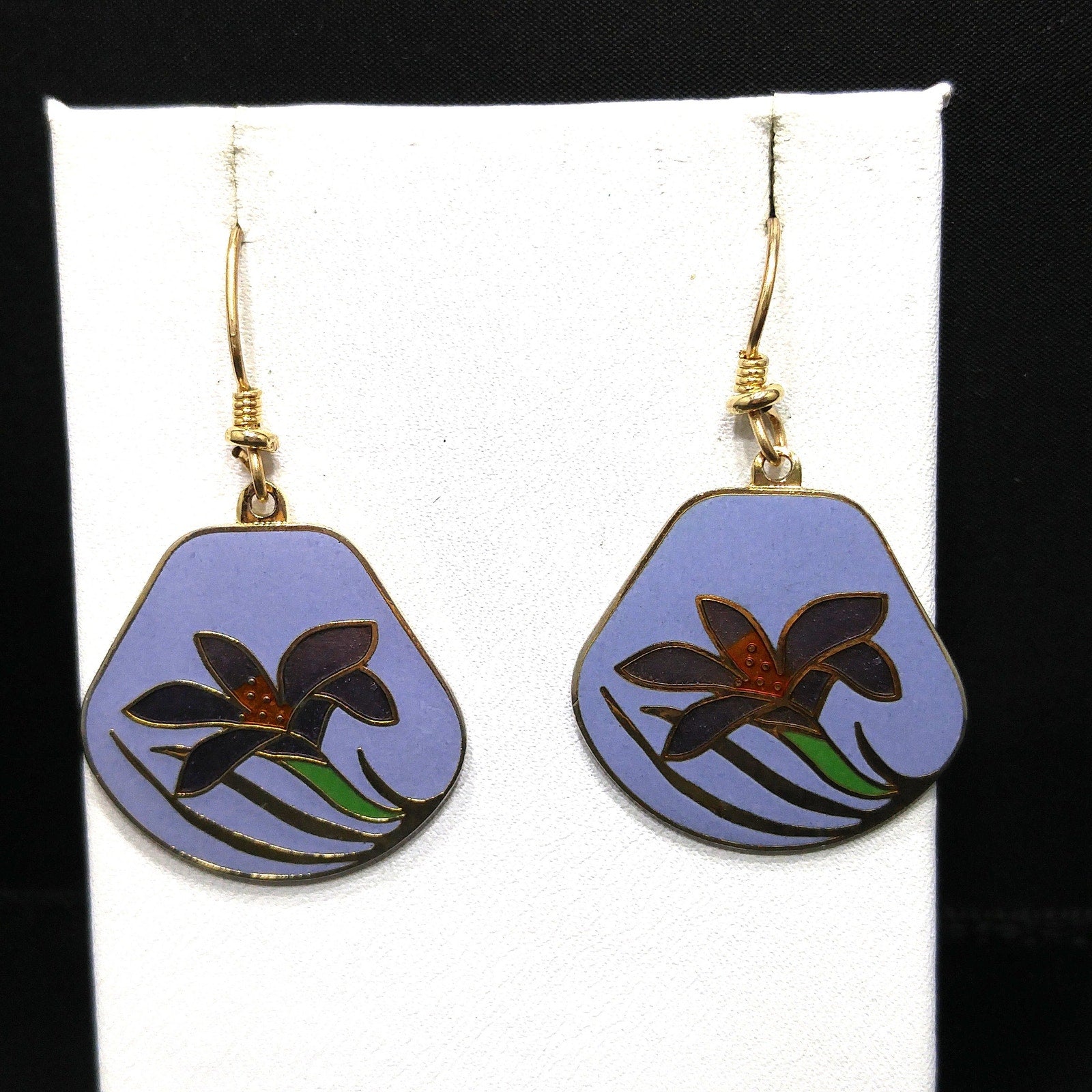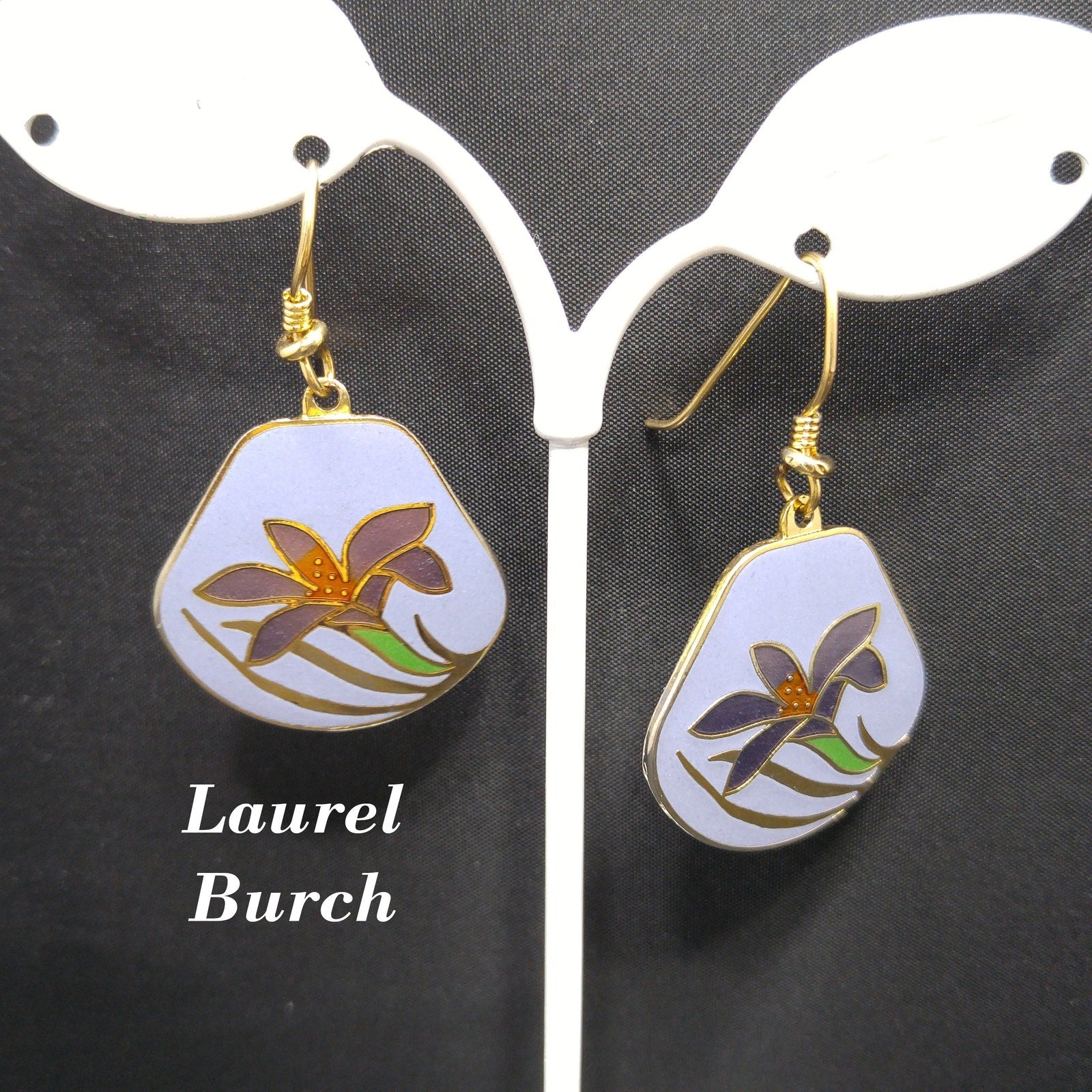 *Description: This is a beautiful pair of Laurel Burch purple lily enamel cloisonne earrings from the early 1980s. The purple lily has a red center and green stem on an enamel lavender background. Both earrings are stamped Laurel Burch on the backs. These earrings are from the early 1980s and do not have the design name on the back, just the designer's name; Laurel Burch. They are gold plated and the plating is worn around the edges on the backs. The ear wires are gold filled and may be slightly bent. They are a great pair of Laurel Burch lily earrings and would be a great addition to your vintage jewelry collection or make a great vintage gift!