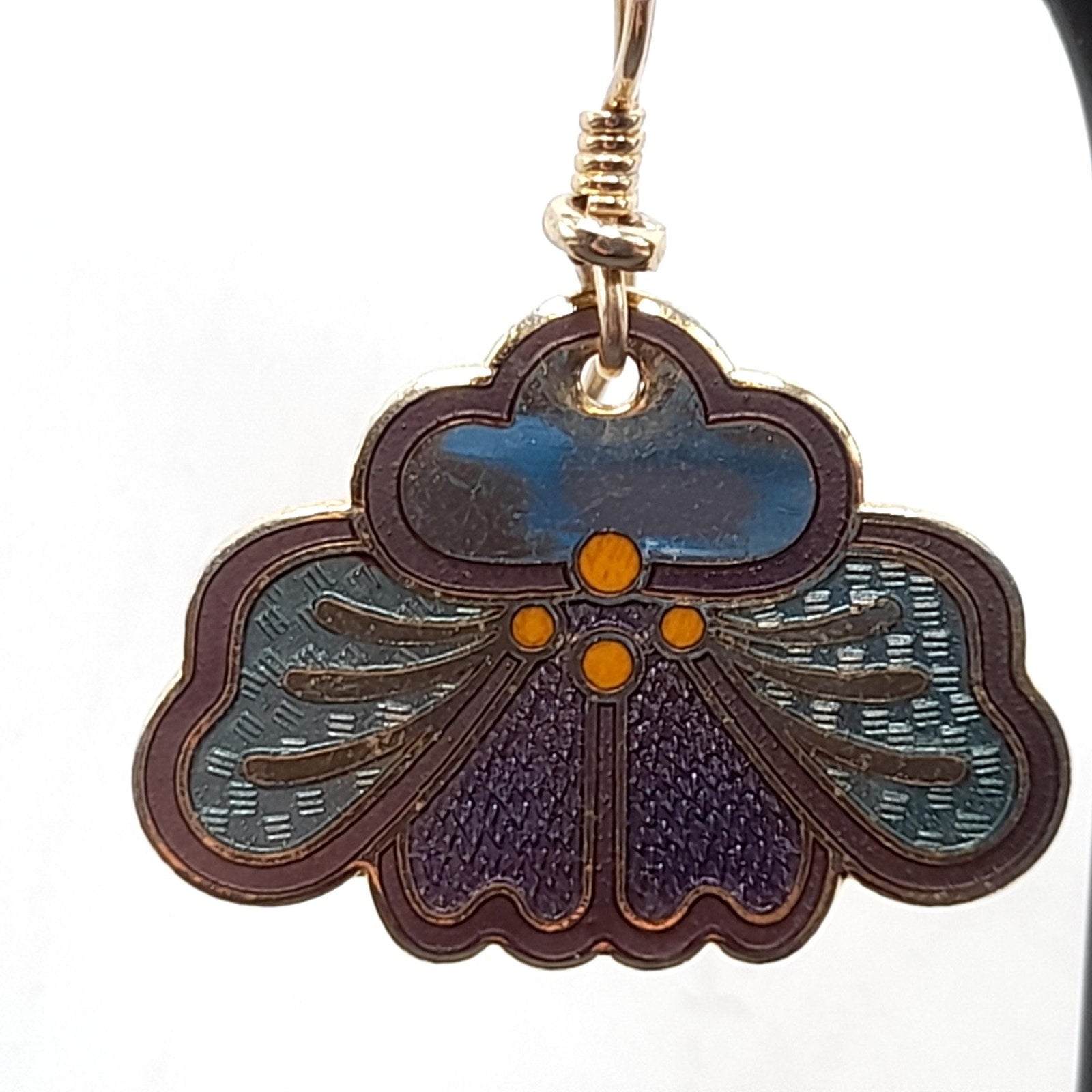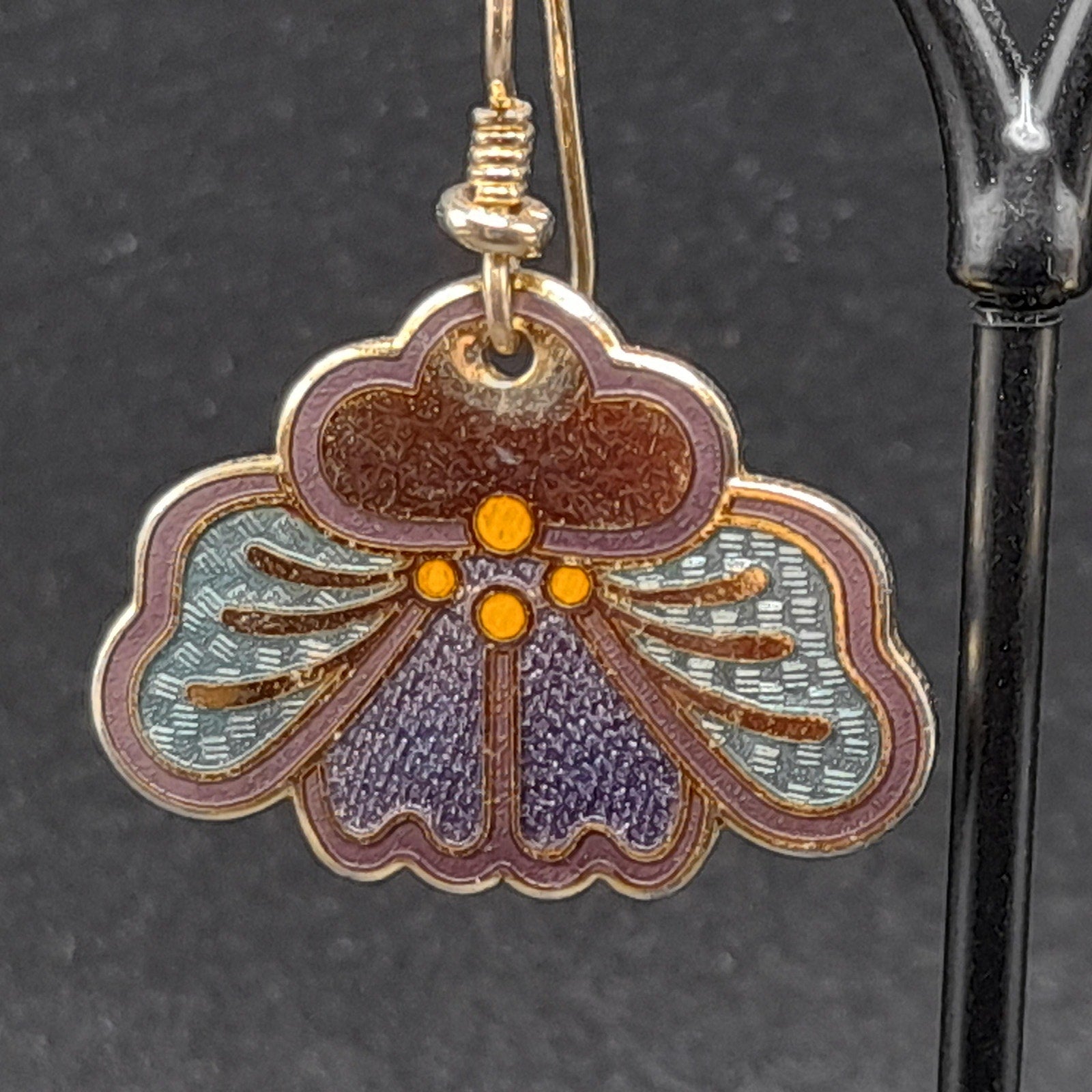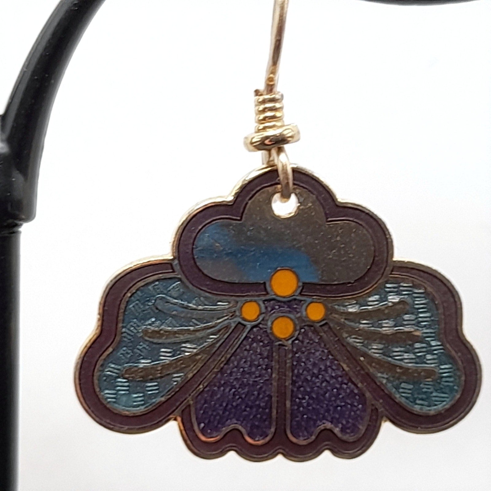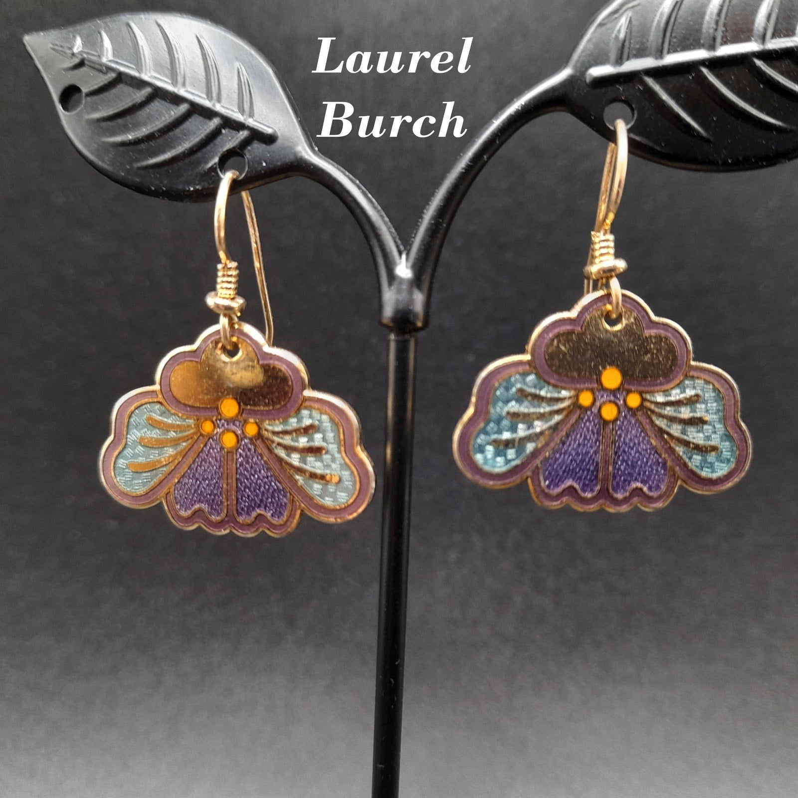*Description: This is a beautiful Laurel Burch cloisonne metallic enamel pair of dangle earrings in the shape of an orchids on a very reflective gold plated backing from the 1980s. The enamel is metallic with light blue and purple and touches of orange on a gold highly reflective background. The ear wires are gold filled and slightly misshapen. See photos for details. This would be a great addition to your vintage jewelry collection or make a great vintage gift!