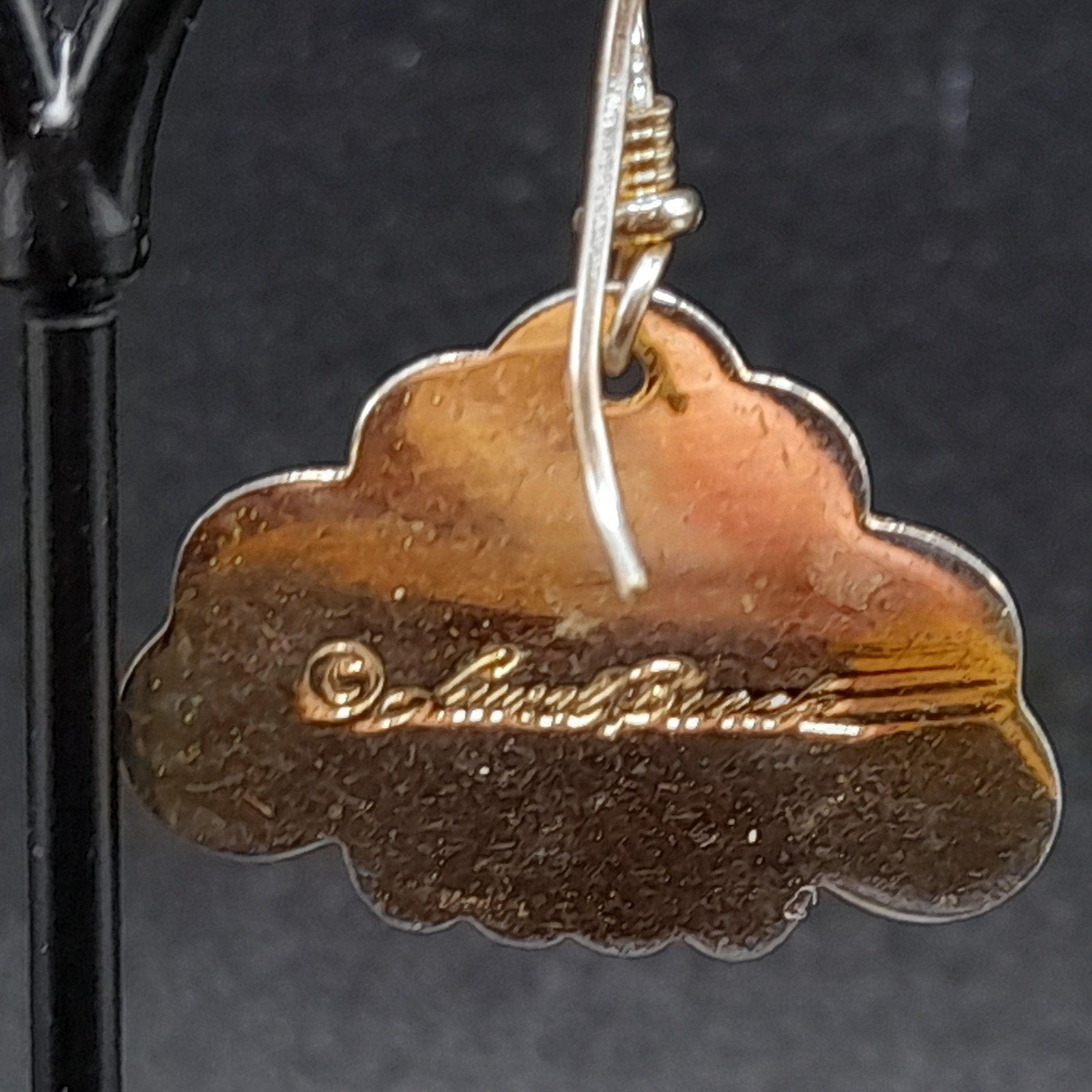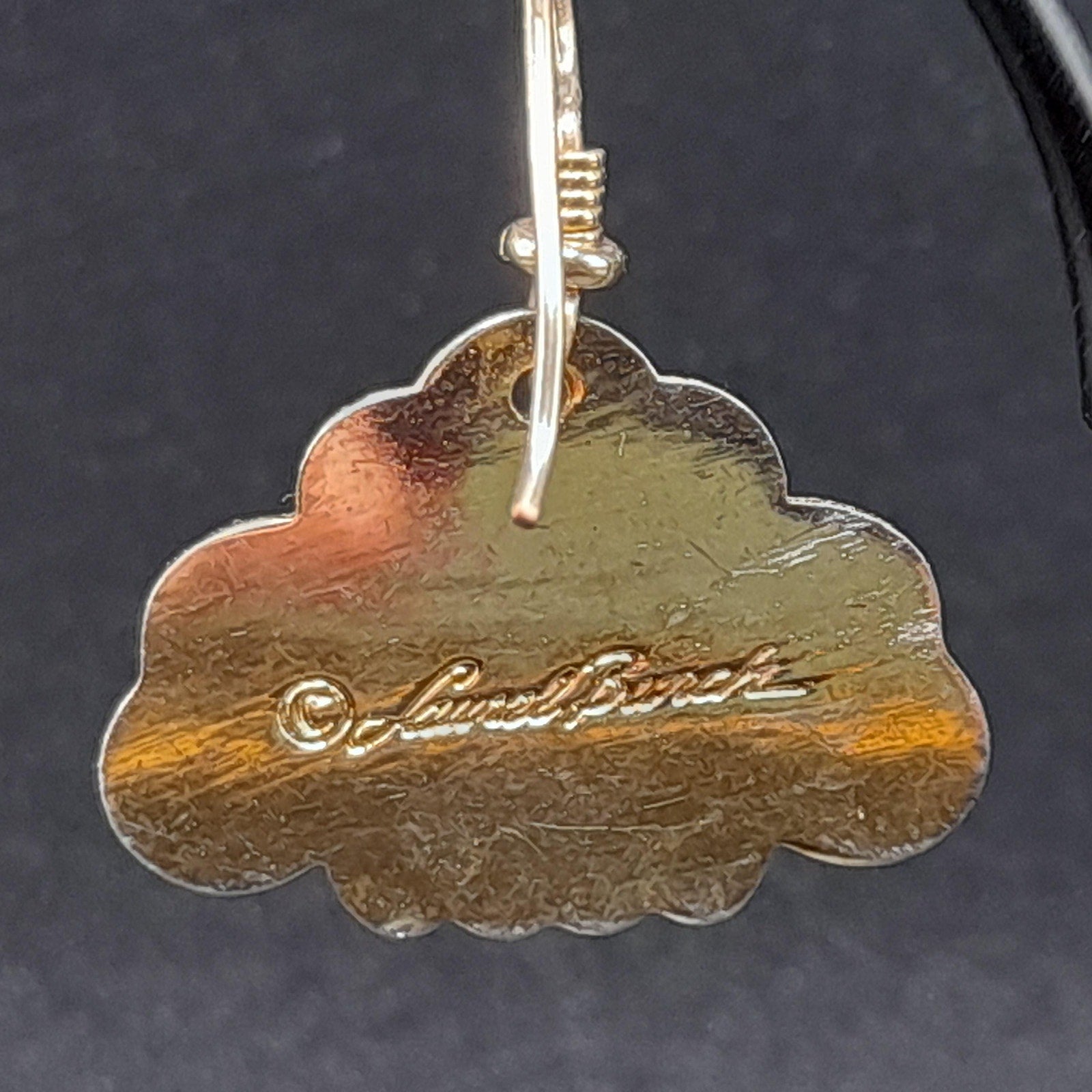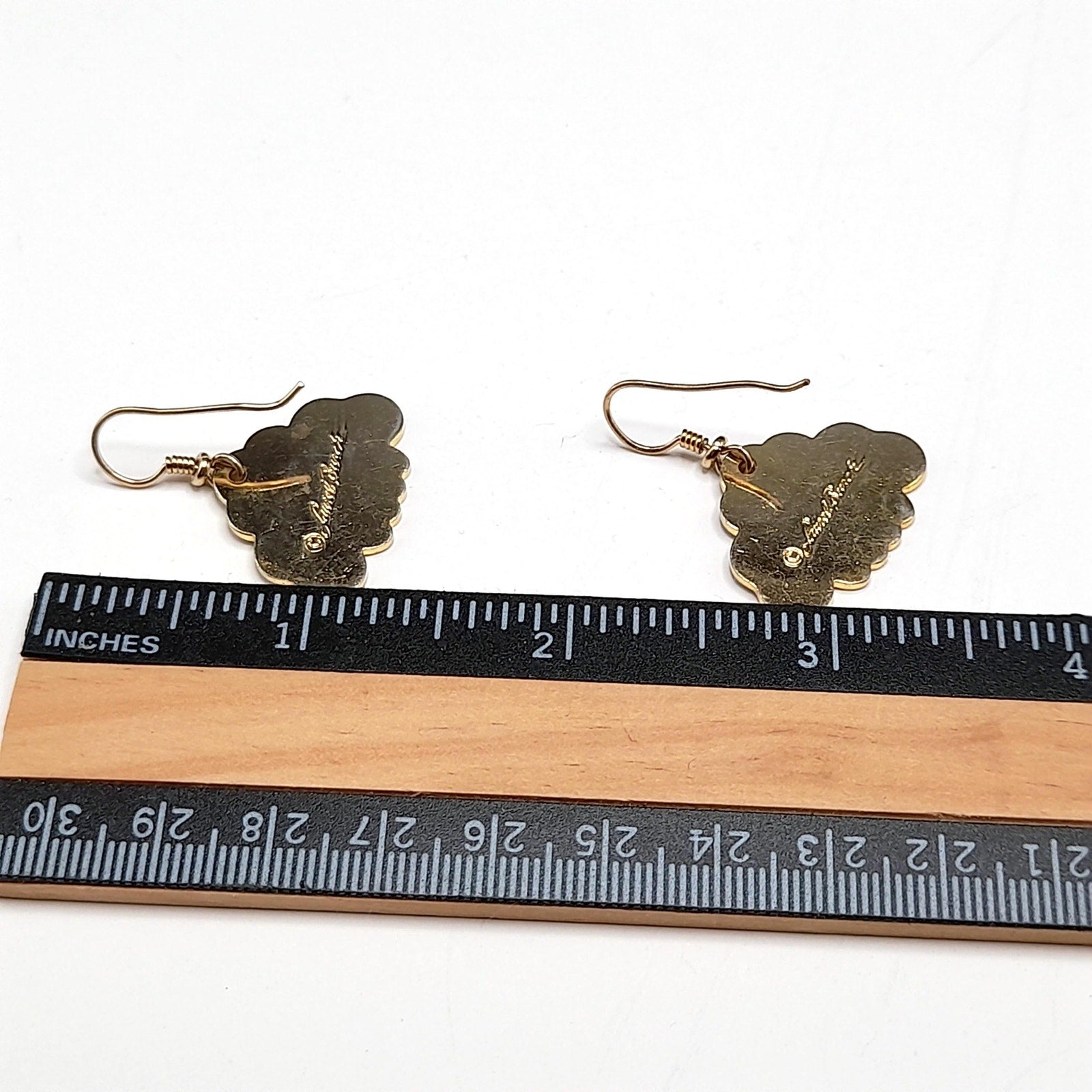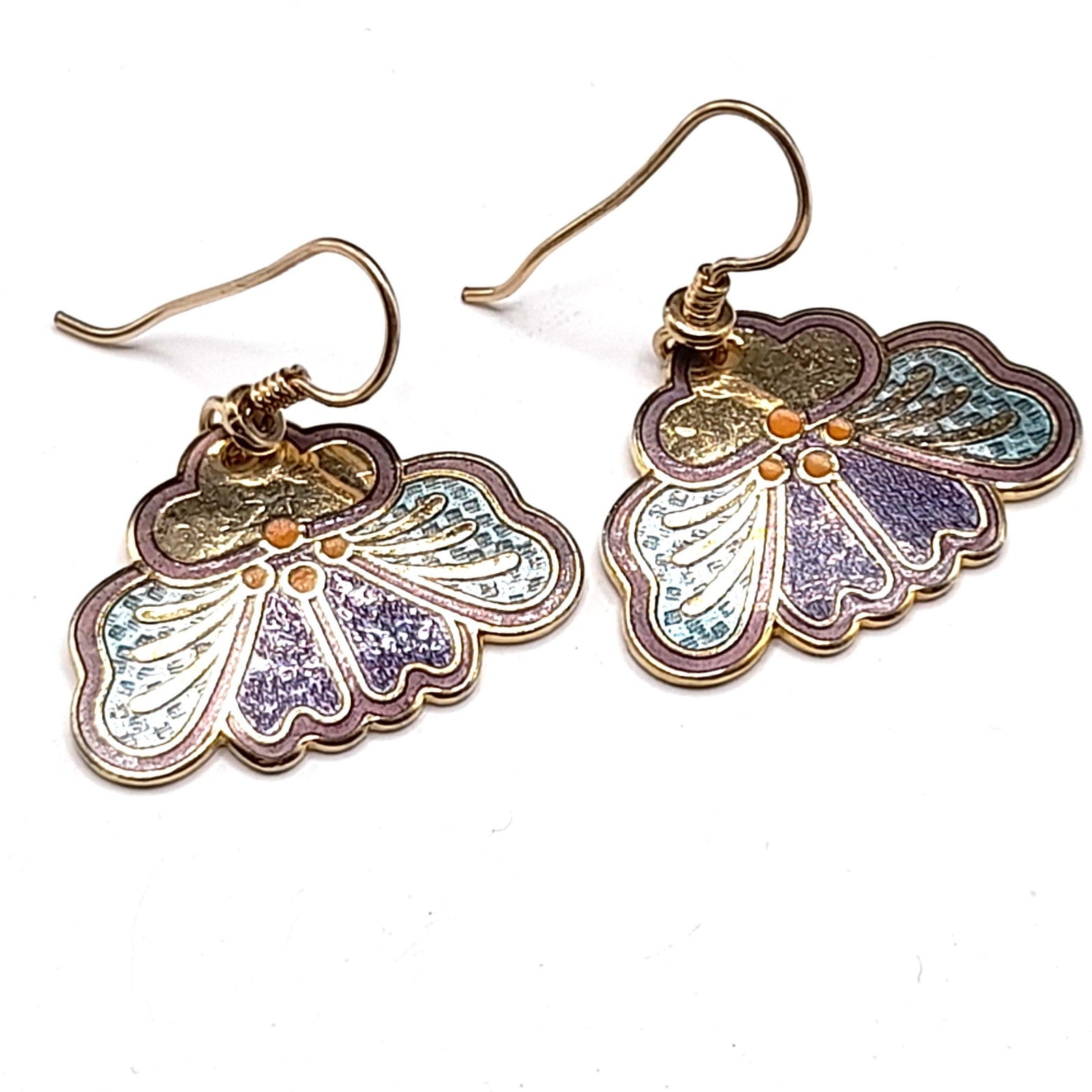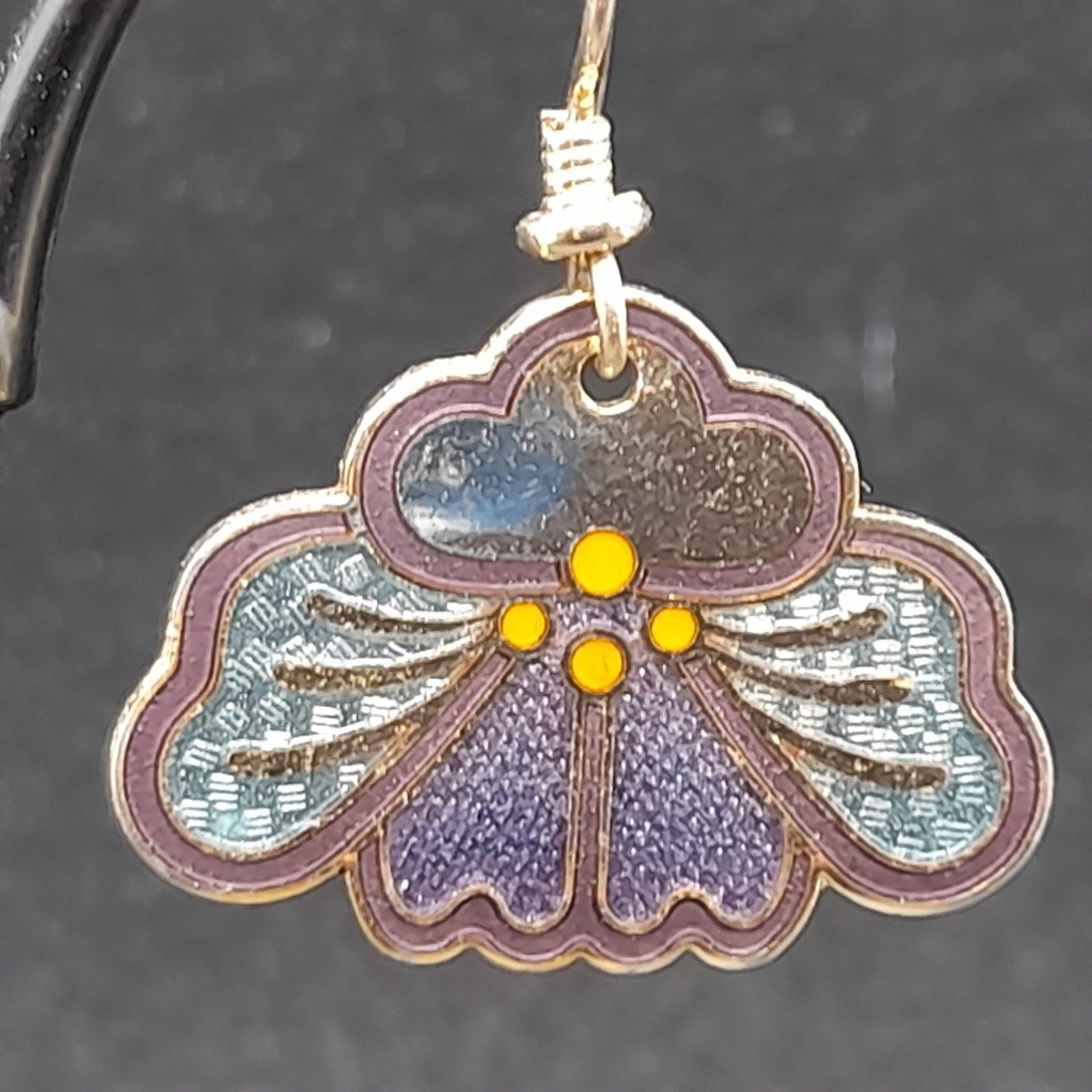 *Description: This is a beautiful Laurel Burch cloisonne metallic enamel pair of dangle earrings in the shape of an orchids on a very reflective gold plated backing from the 1980s. The enamel is metallic with light blue and purple and touches of orange on a gold highly reflective background. The ear wires are gold filled and slightly misshapen. See photos for details. This would be a great addition to your vintage jewelry collection or make a great vintage gift!