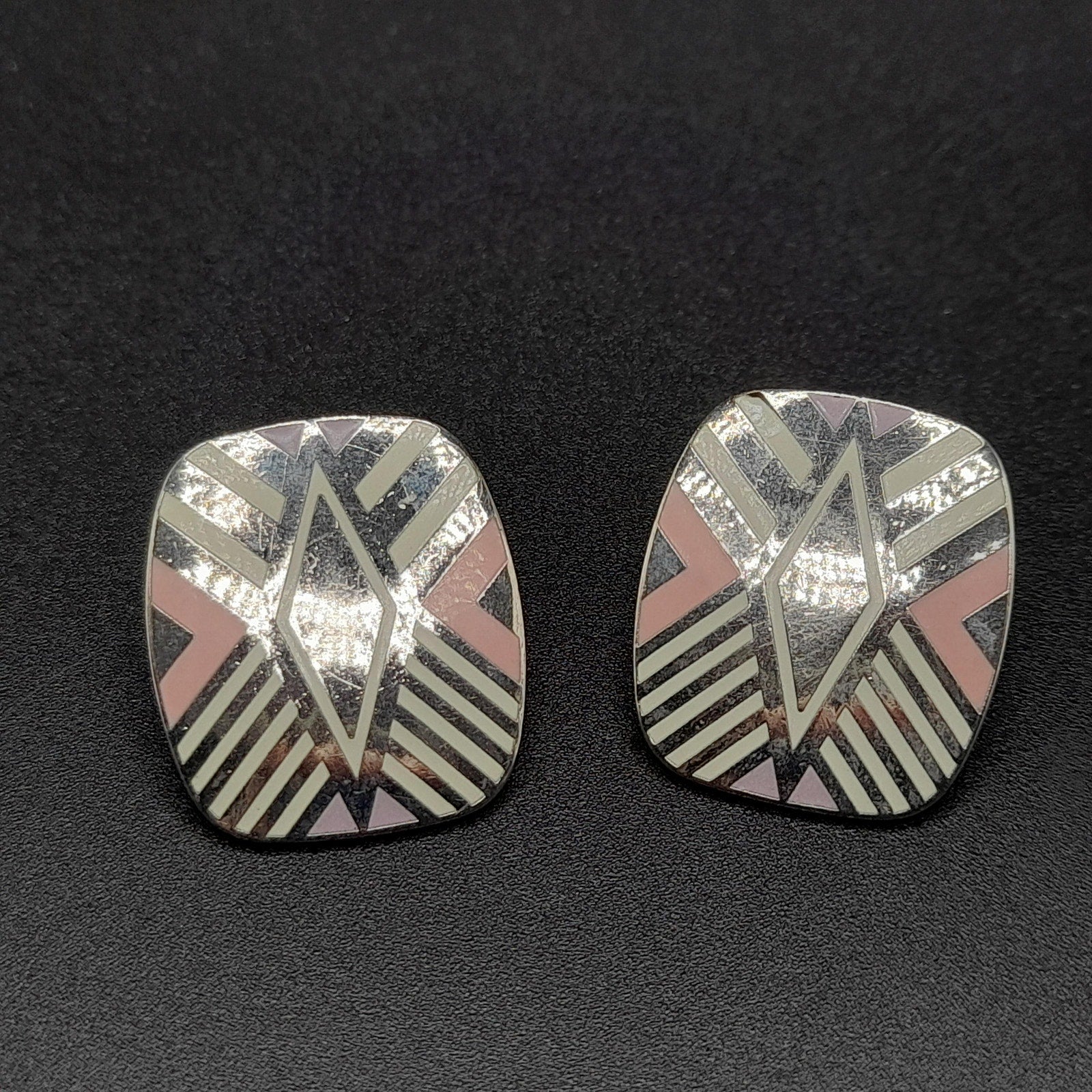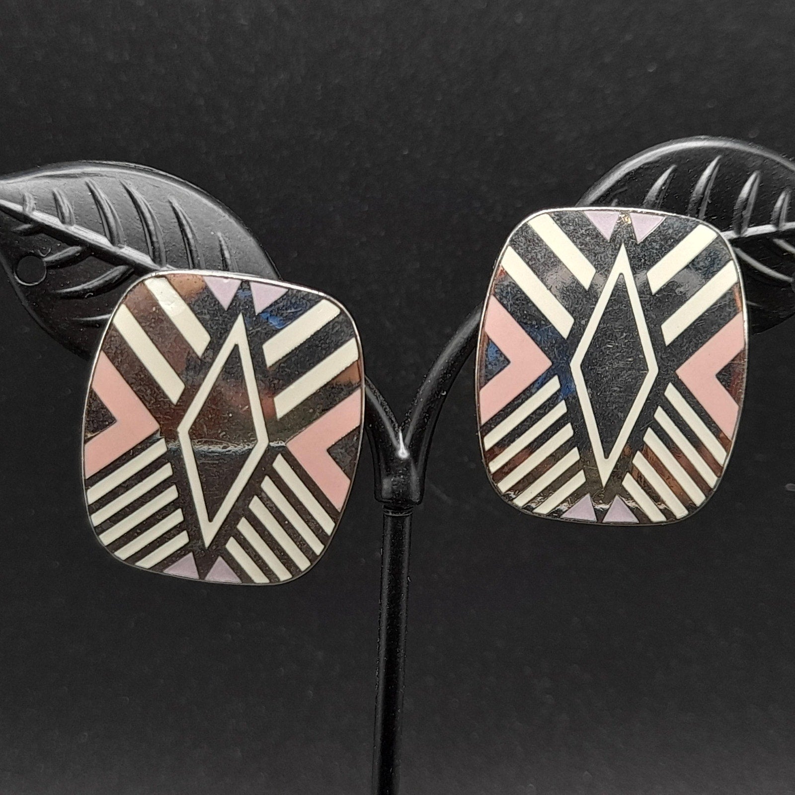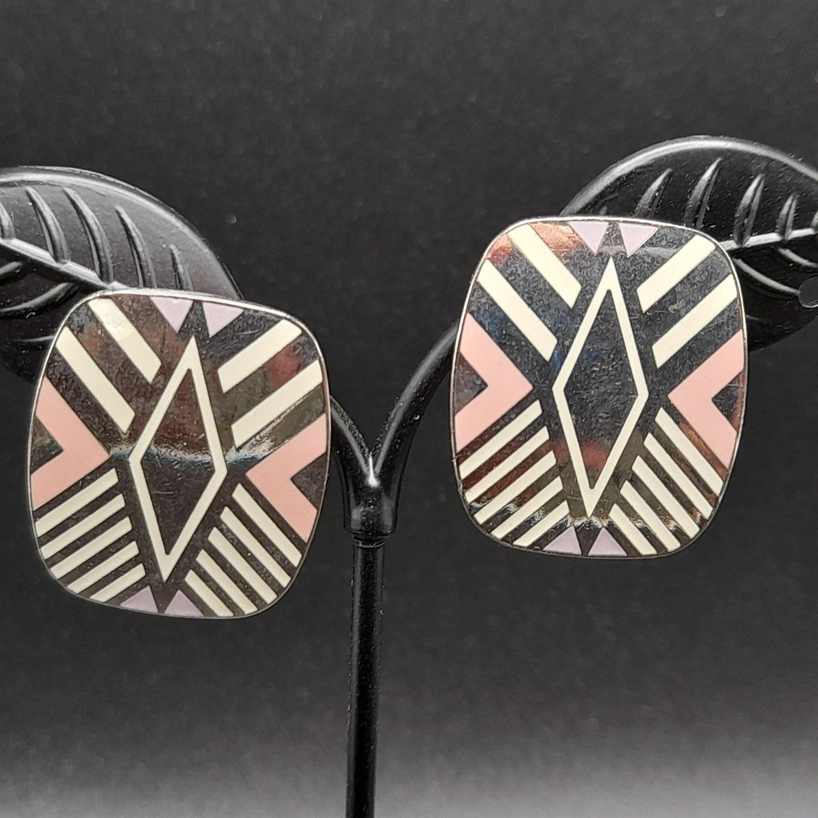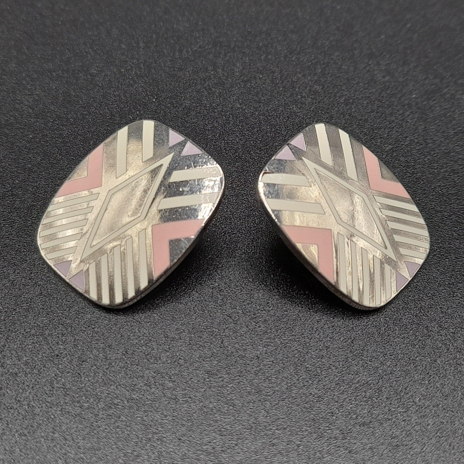 *Description: This is a great design by Laurel Burch from the 1980s entitled "Quintessence". It is on a very reflective silver tone pair of earrings, which tested at 10K gold surface metal and is rhodium plated, and cloisonné enamel in pink, lavender, and white. The posts are also gold filled. Both earrings are stamped with the designer and design name. This would be a great addition to your vintage jewelry collection or make a great vintage gift!