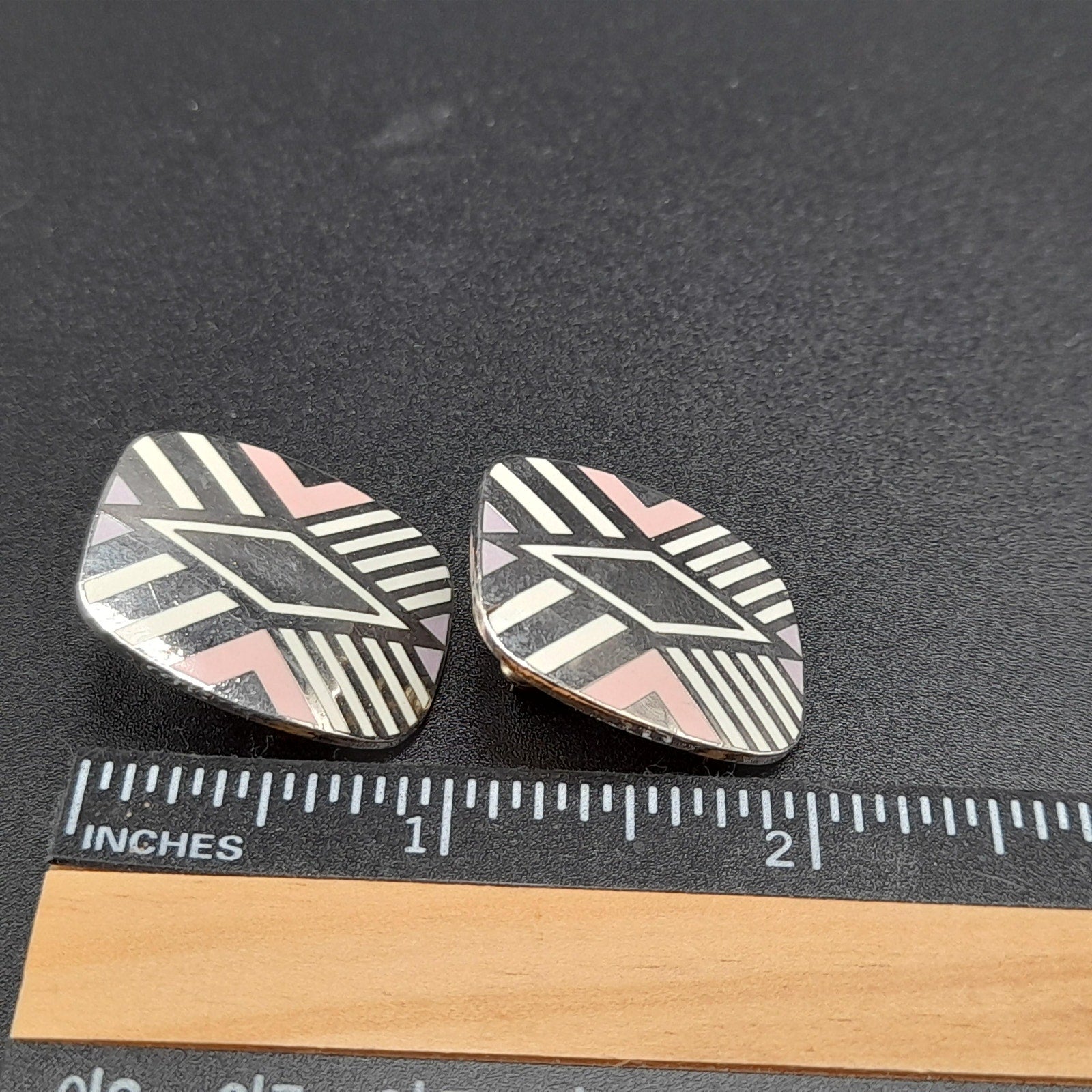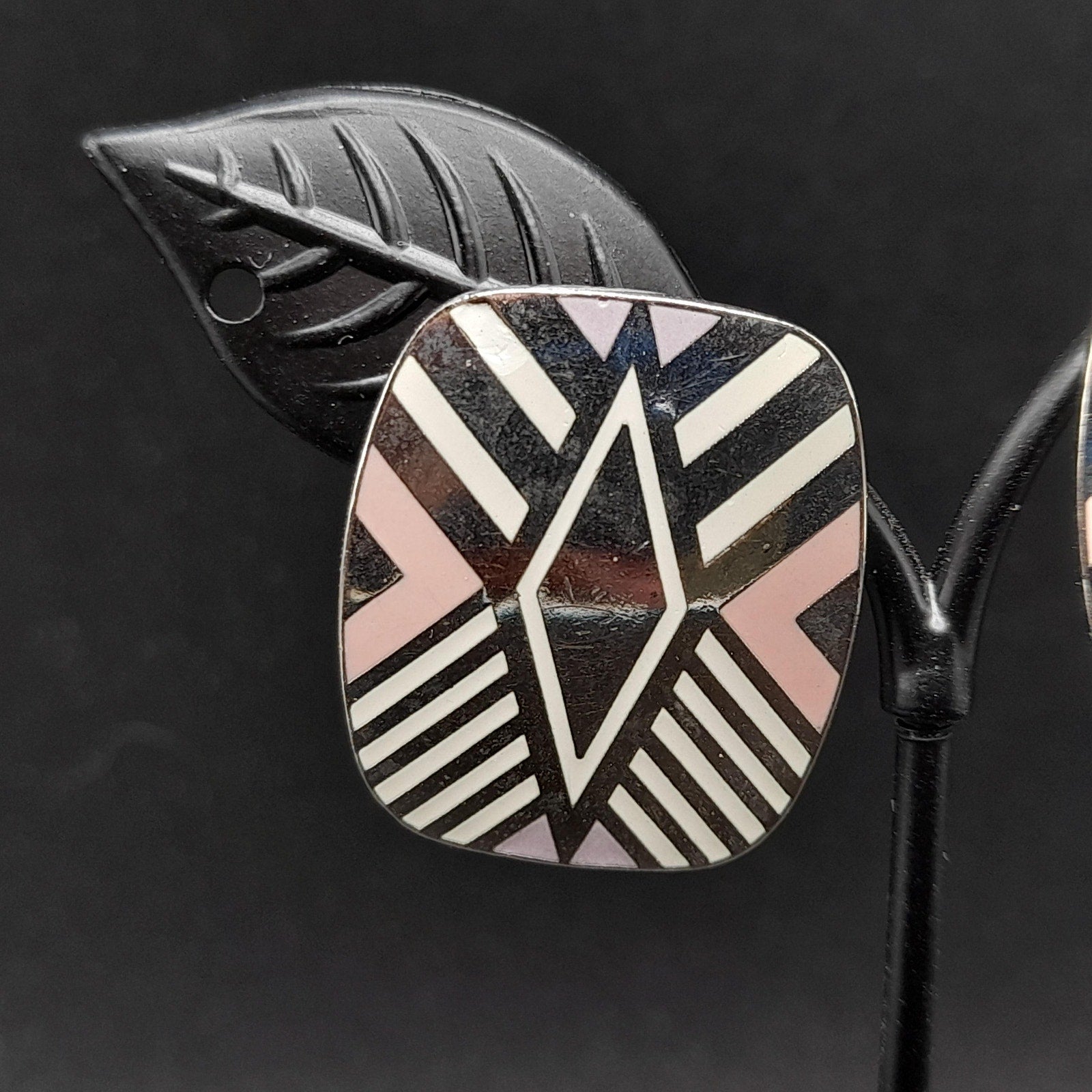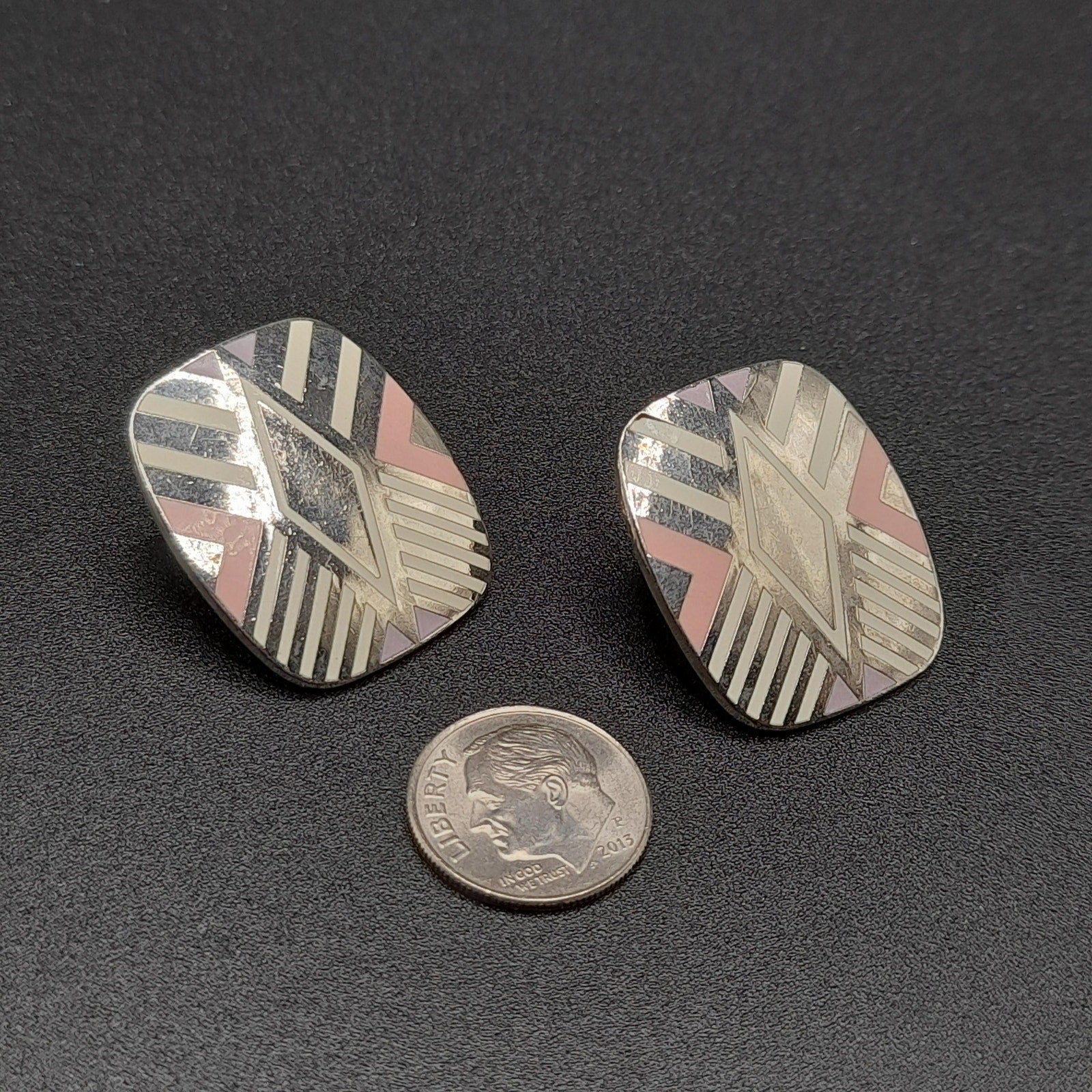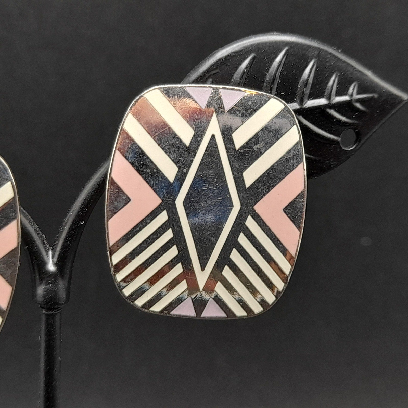 *Description: This is a great design by Laurel Burch from the 1980s entitled "Quintessence". It is on a very reflective silver tone pair of earrings, which tested at 10K gold surface metal and is rhodium plated, and cloisonné enamel in pink, lavender, and white. The posts are also gold filled. Both earrings are stamped with the designer and design name. This would be a great addition to your vintage jewelry collection or make a great vintage gift!