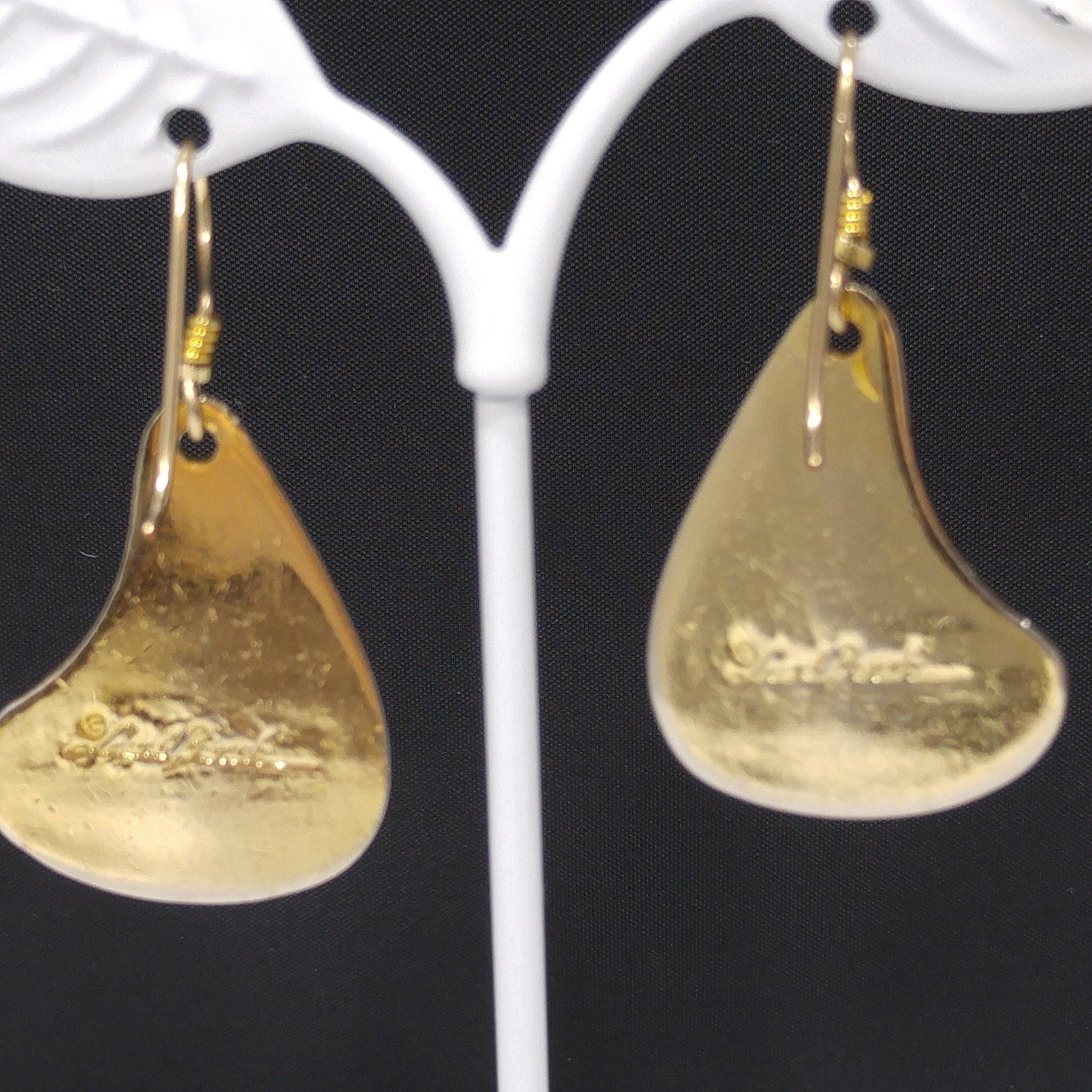 *Description: This is a great pair of Laurel Burch slightly eggplant shaped drop earrings with a geometric design on the top with gold plating and two shades of red enamel; one metallic and the other bright red, from the 1980s. The earrings have gold filled ear wires which are the originals. Each earring is stamped Laurel Burch on the back. This would be a great addition to your vintage jewelry collection or make a great vintage gift!