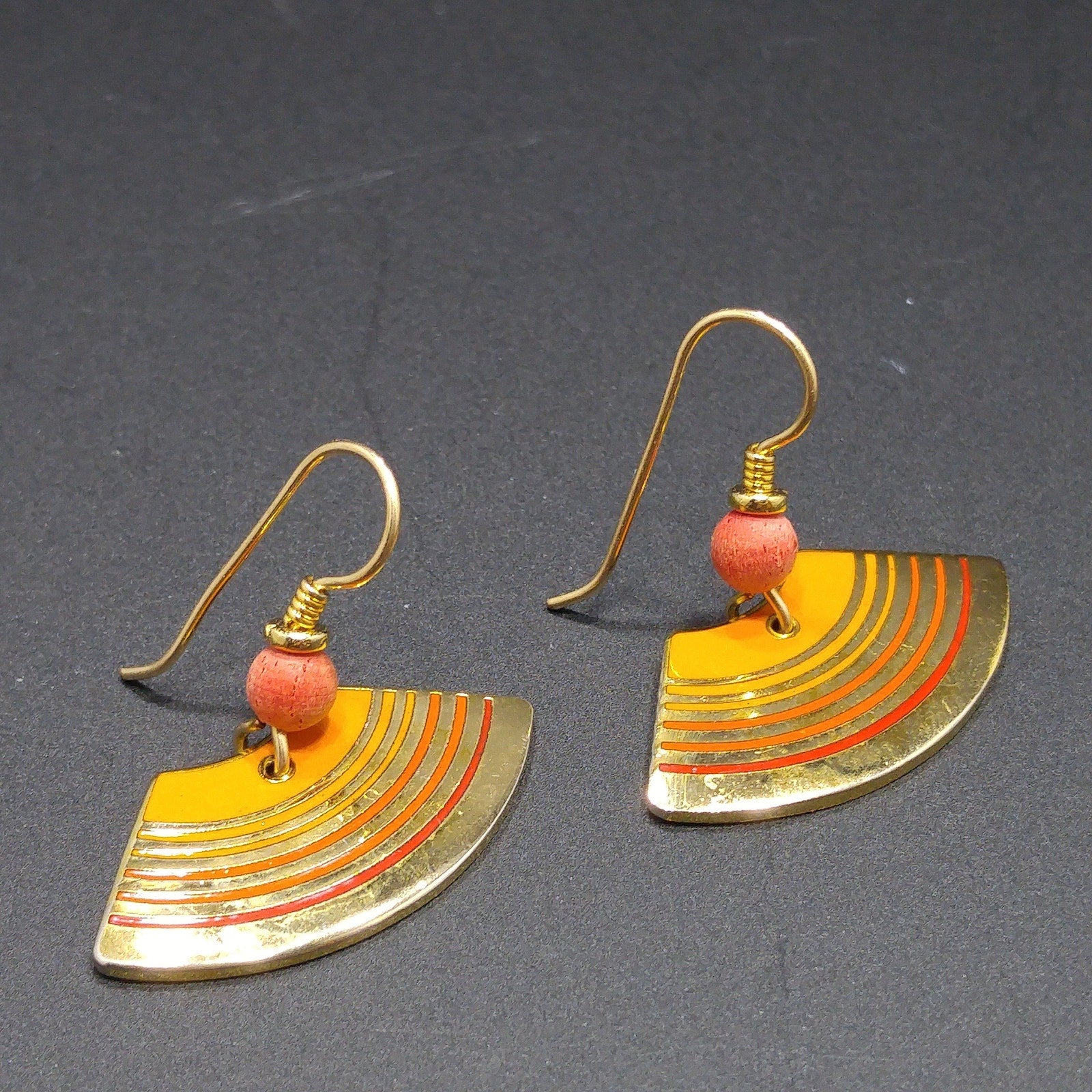 *Description: This is a beautiful pair of vintage Laurel Burch "Rhythm" earrings in shades of orange enamel on a gold plated cloisonne background and backing from the 1980s. The gold filled ear wires have an orange wooden bead each. Each earring is stamped Laurel Burch and Rhythm on the back. This pair of earrings would be a great addition to your vintage jewelry collection or make a great vintage gift!