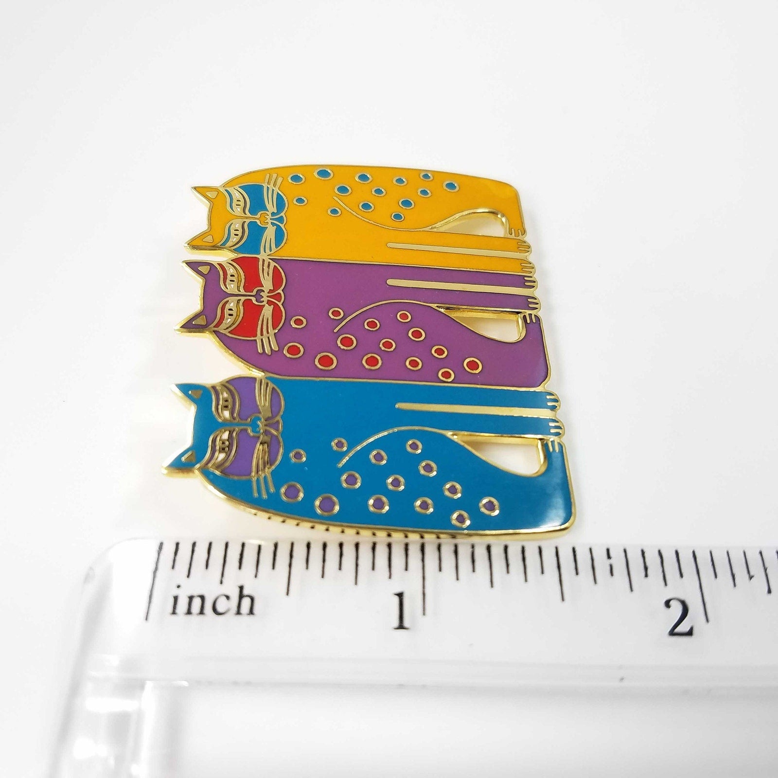 This vintage Laurel Burch Siamese Cats brooch pin captures the playful, artistic style that made Laurel Burch an icon of 1980s jewelry design. Featuring bold cloisonné enamel detailing with vibrant colors, the brooch is beautifully accented with a gold-plated finish for extra shine.