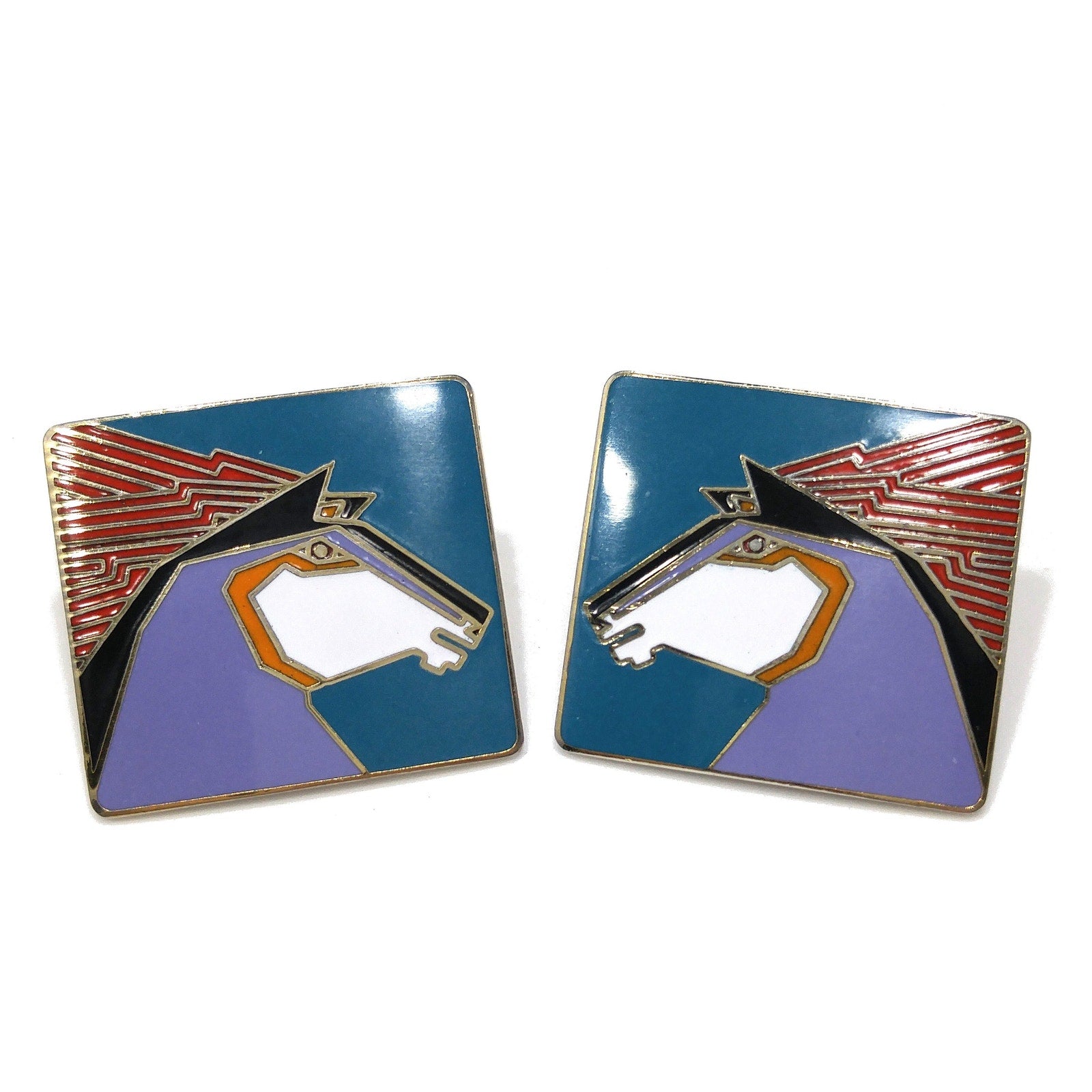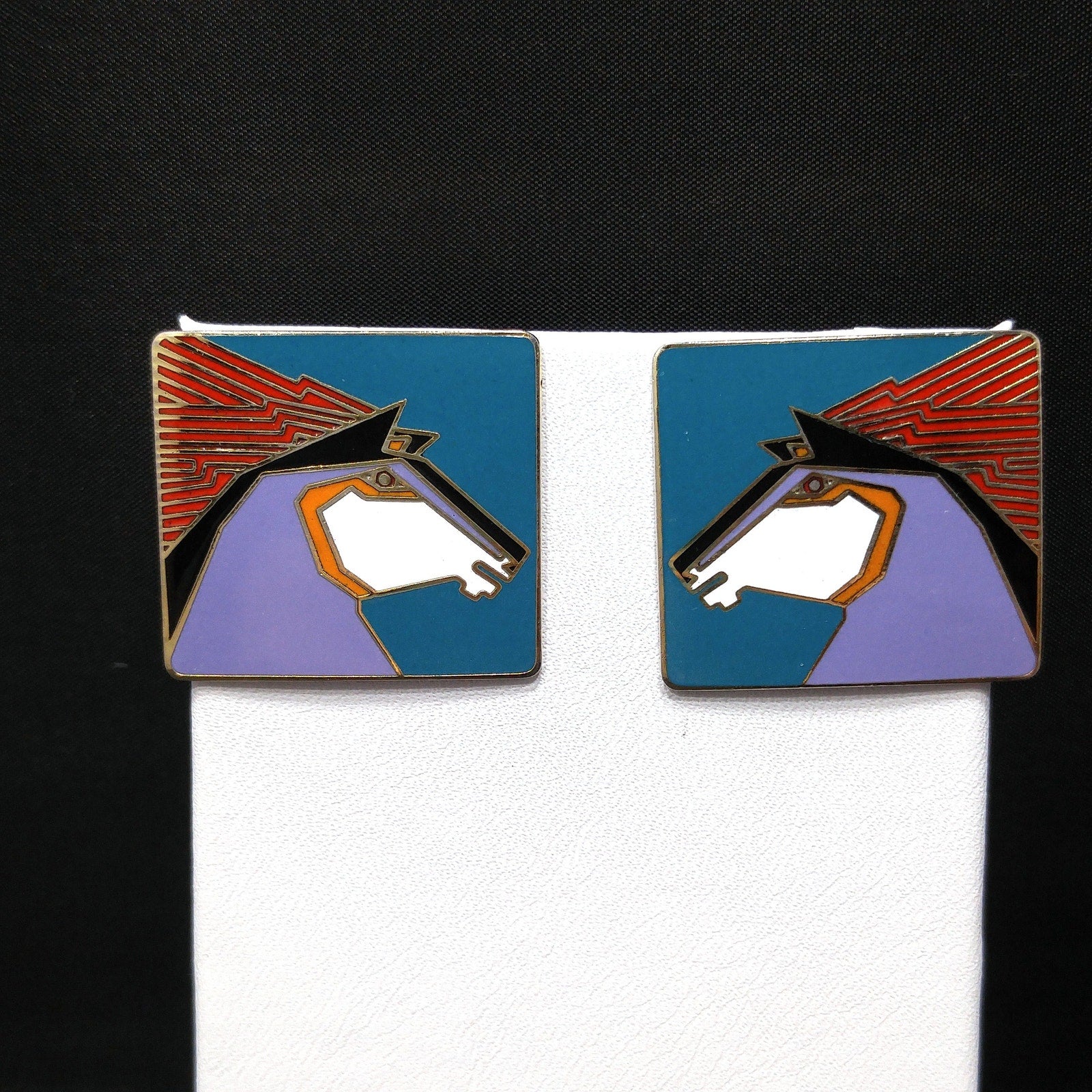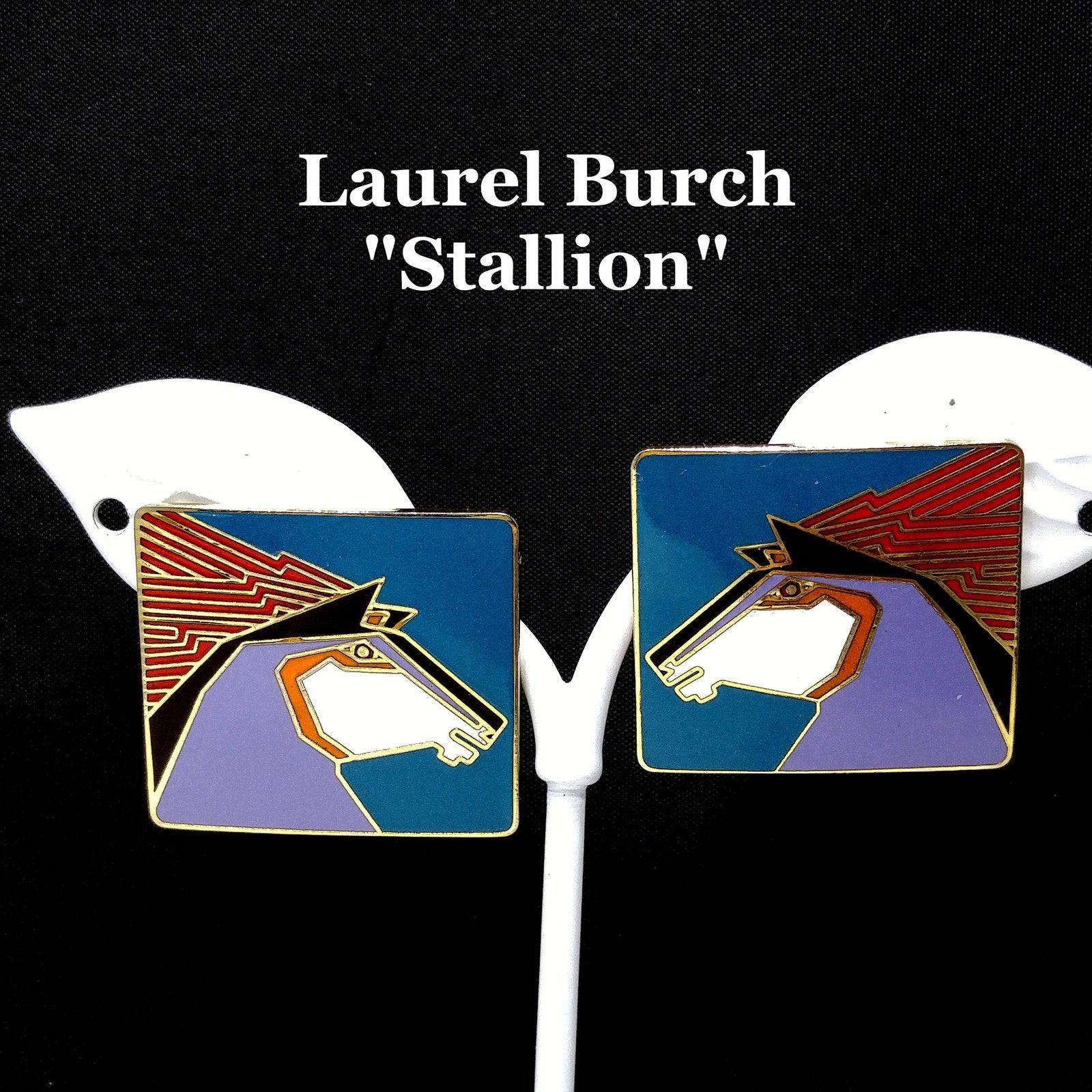 *Description: This is a beautiful pair of Laurel Burch "Stallion" horse cloisonné earrings from the 1980s. The earrings are gold plated and have enamel in teal blue, lavender, red, black, white, and orange. The front of each earring looks great. The back of each earring shows plating and surface wear. This color combination is more rare than some of the other varieties in this design. Perfect pair of earrings for someone who loves horses or all animals. This would be a great addition to your vintage jewelry collection or make a great vintage gift!