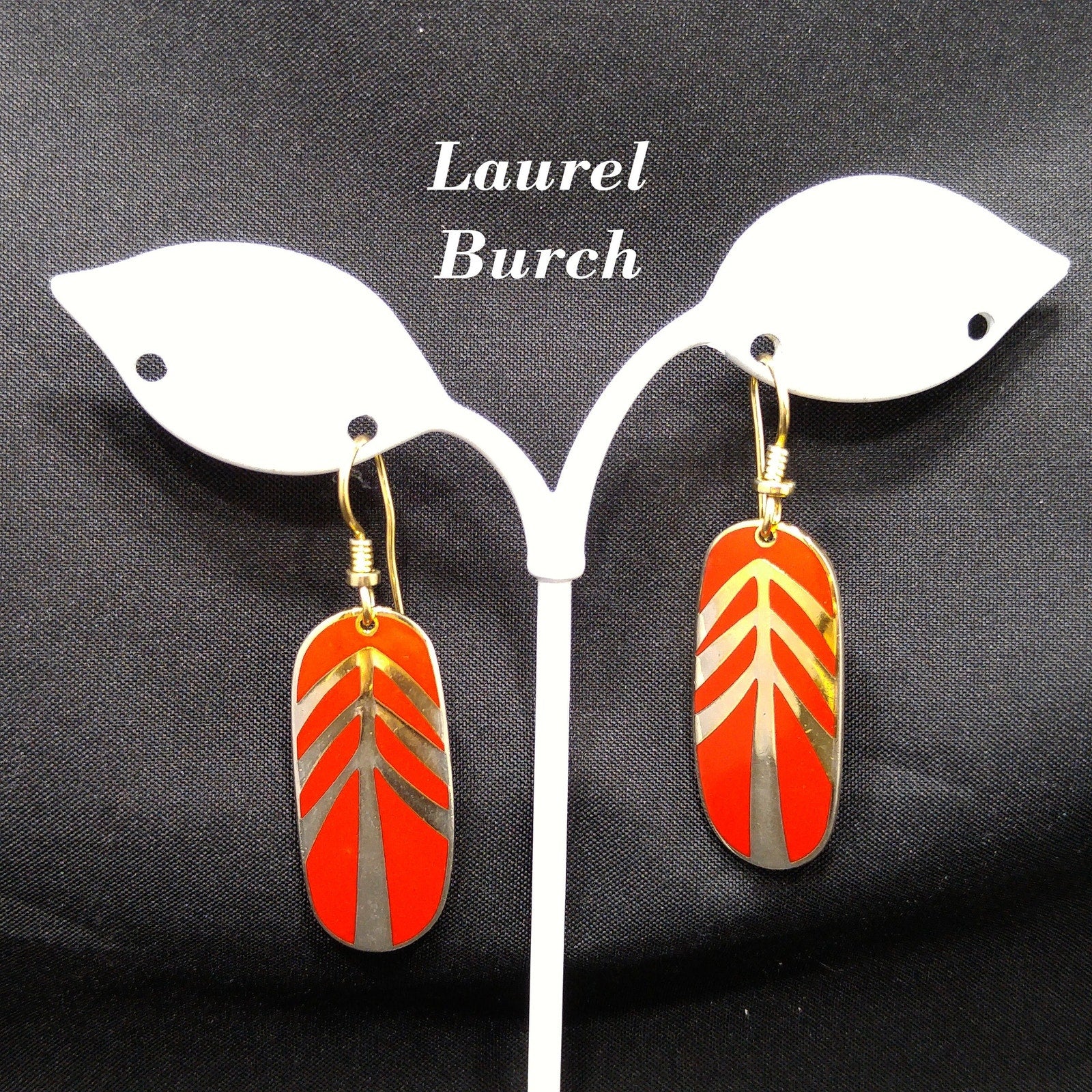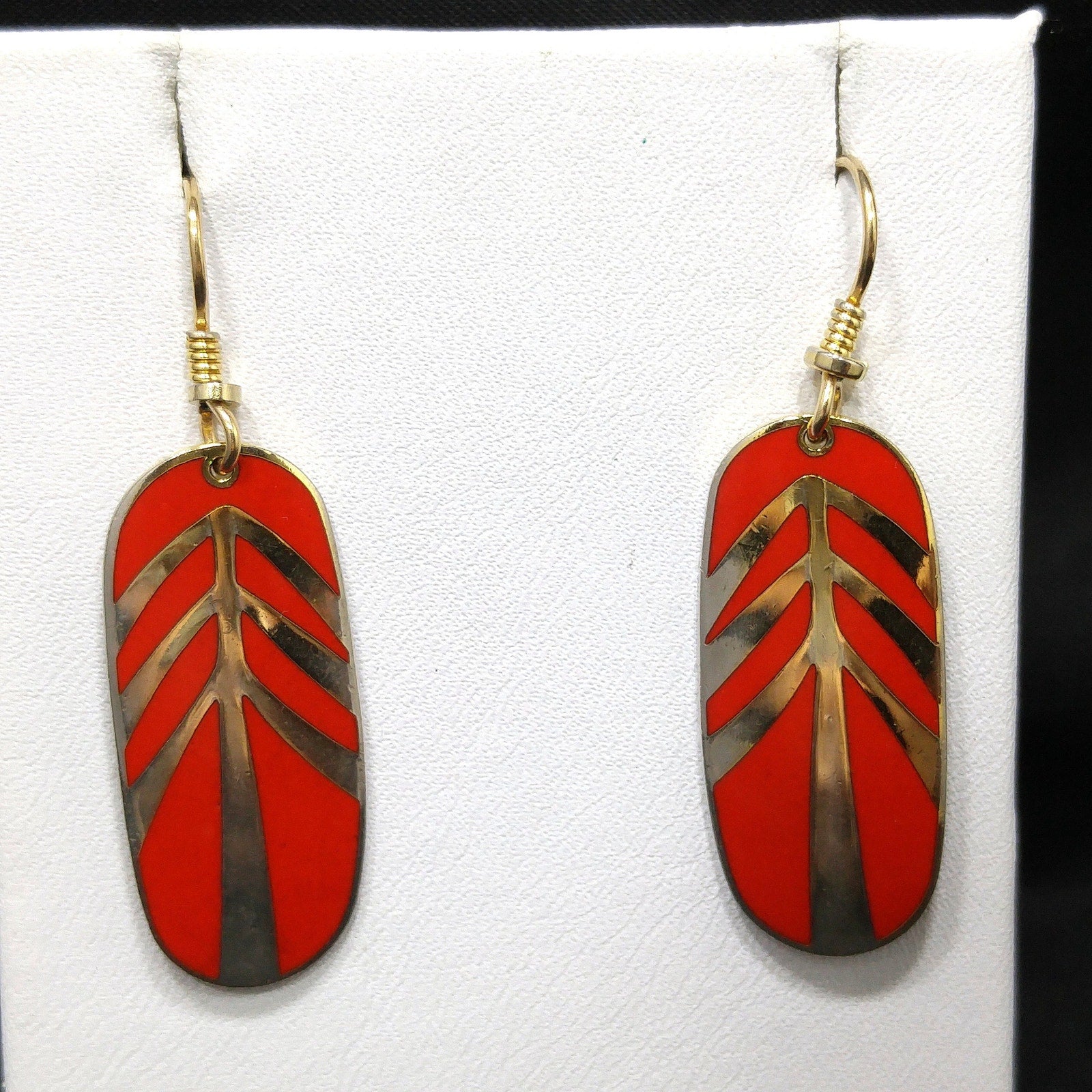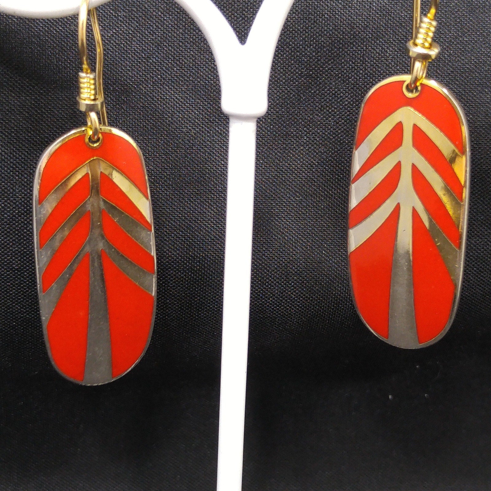 *Description: This is a beautiful pair of bright red enamel and gold cloisonné plated Laurel Burch drop earrings. The design is called Tahoe Arrow and resembles a feather, leaf, or fir tree, depending on your perspective. The ear wires are gold filled. This design has two sizes and this is the smaller of the two. This is a great Laurel Burch 1980s design and would make a great addition to your vintage jewelry collection.