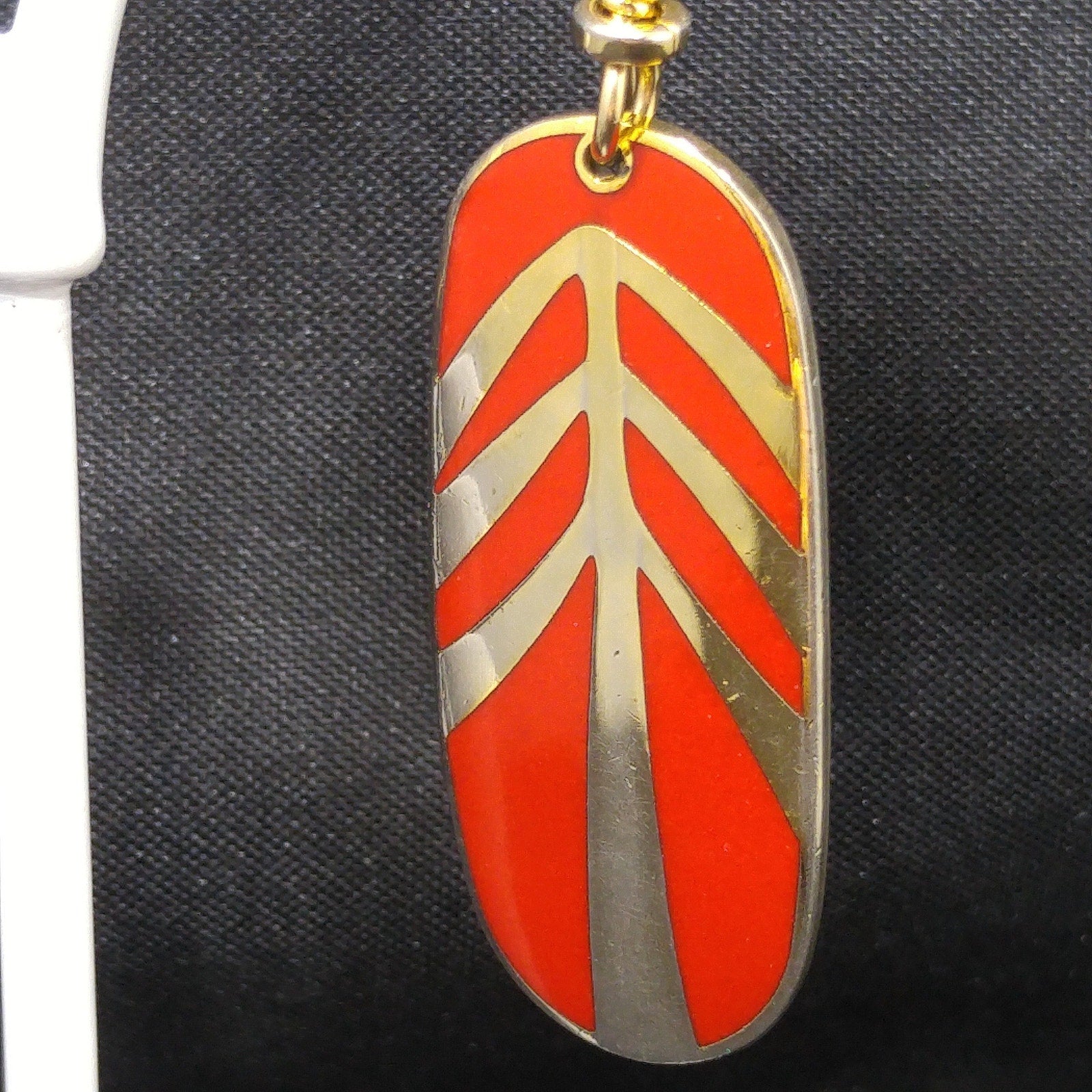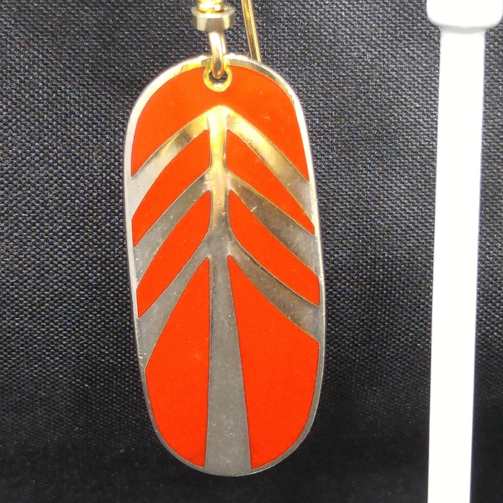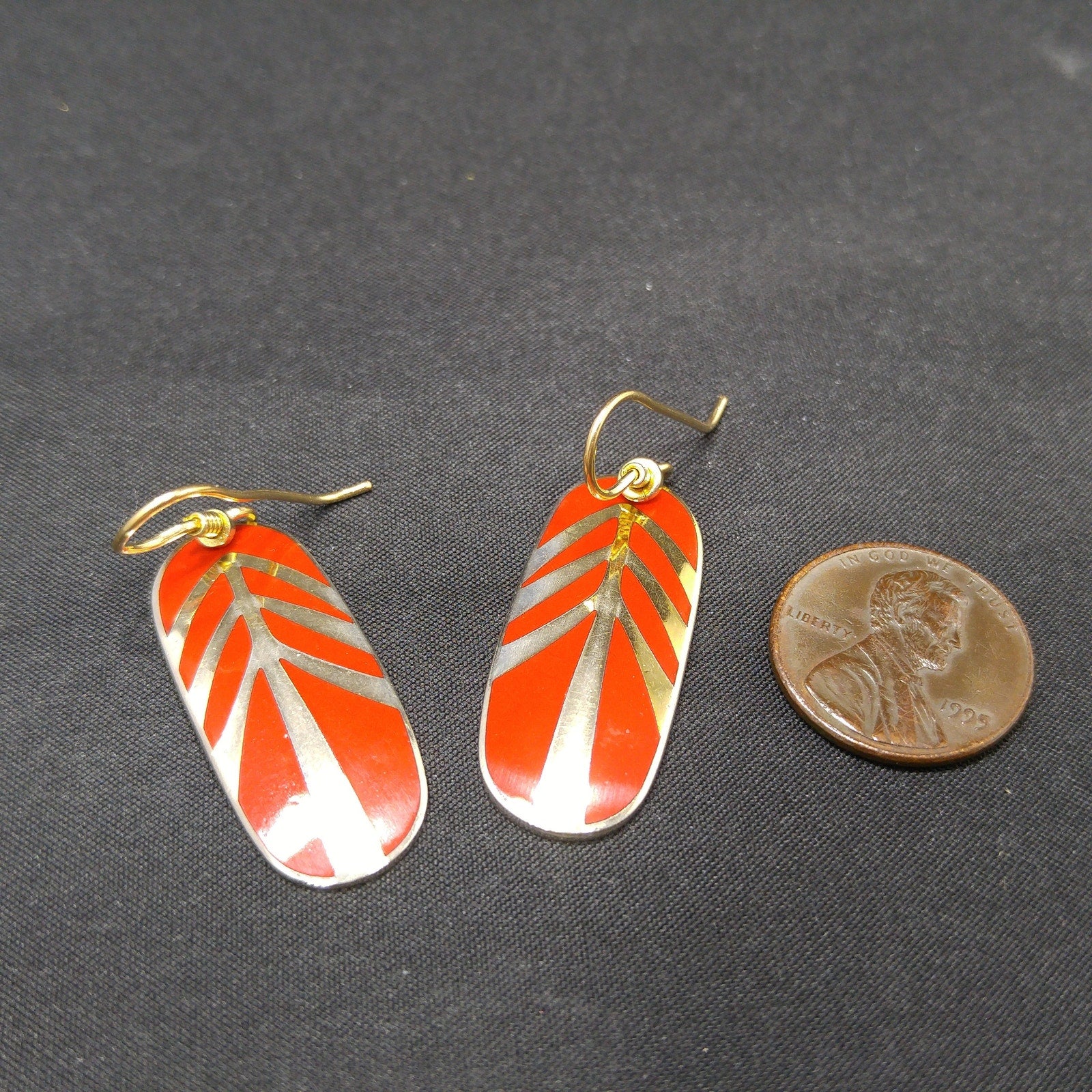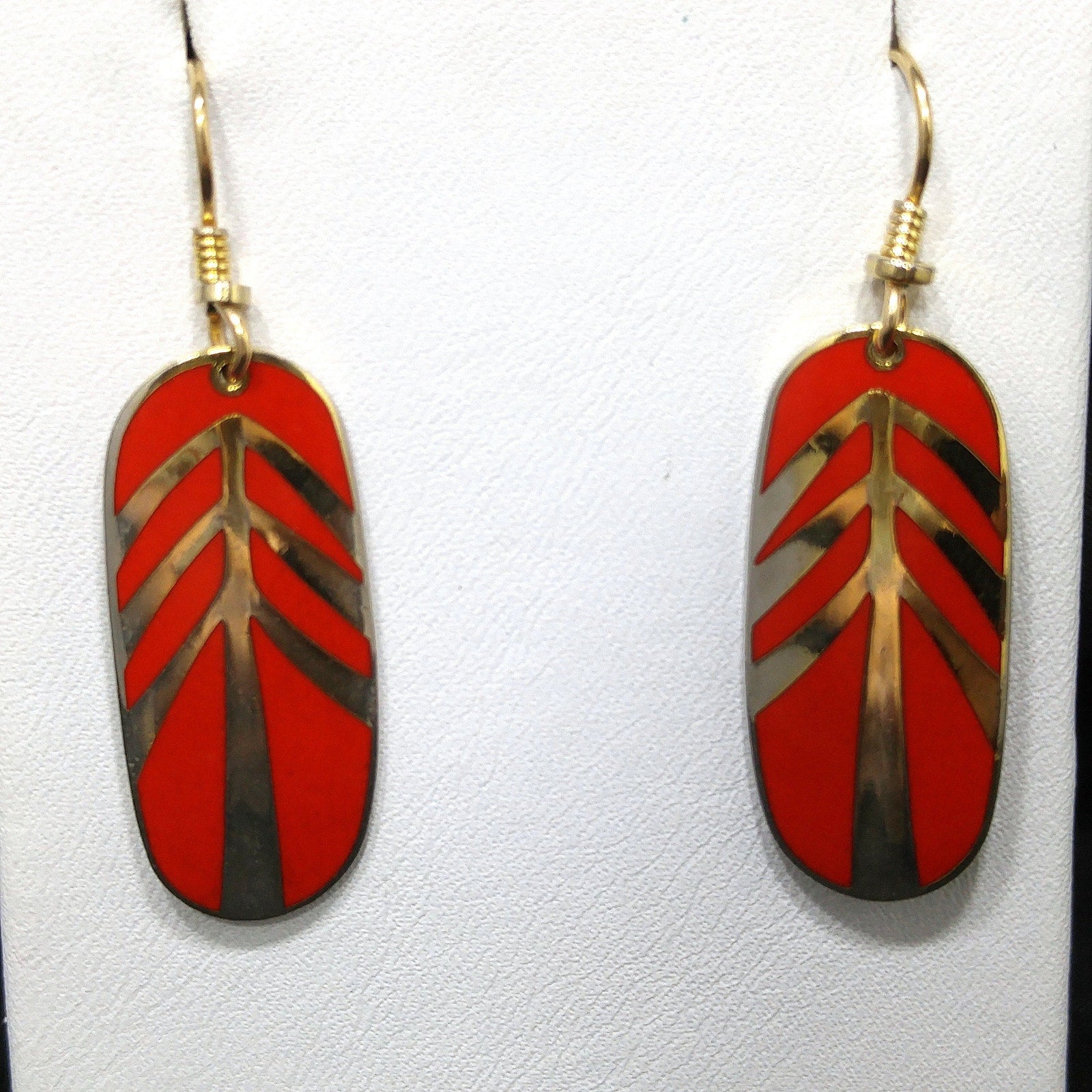 *Description: This is a beautiful pair of bright red enamel and gold cloisonné plated Laurel Burch drop earrings. The design is called Tahoe Arrow and resembles a feather, leaf, or fir tree, depending on your perspective. The ear wires are gold filled. This design has two sizes and this is the smaller of the two. This is a great Laurel Burch 1980s design and would make a great addition to your vintage jewelry collection.