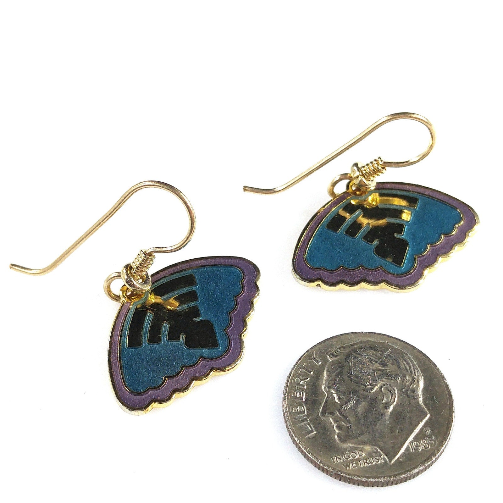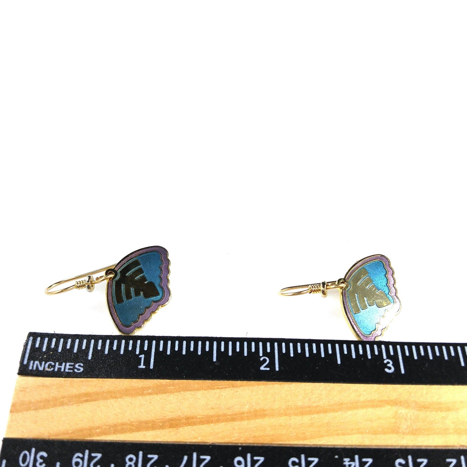 Vintage Laurel Burch Teal & Purple Enamel Drop Earrings, Gold Plated
