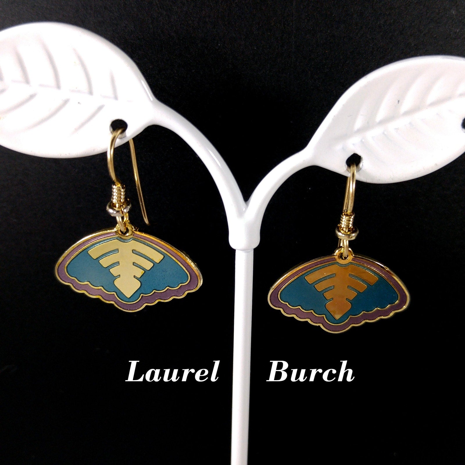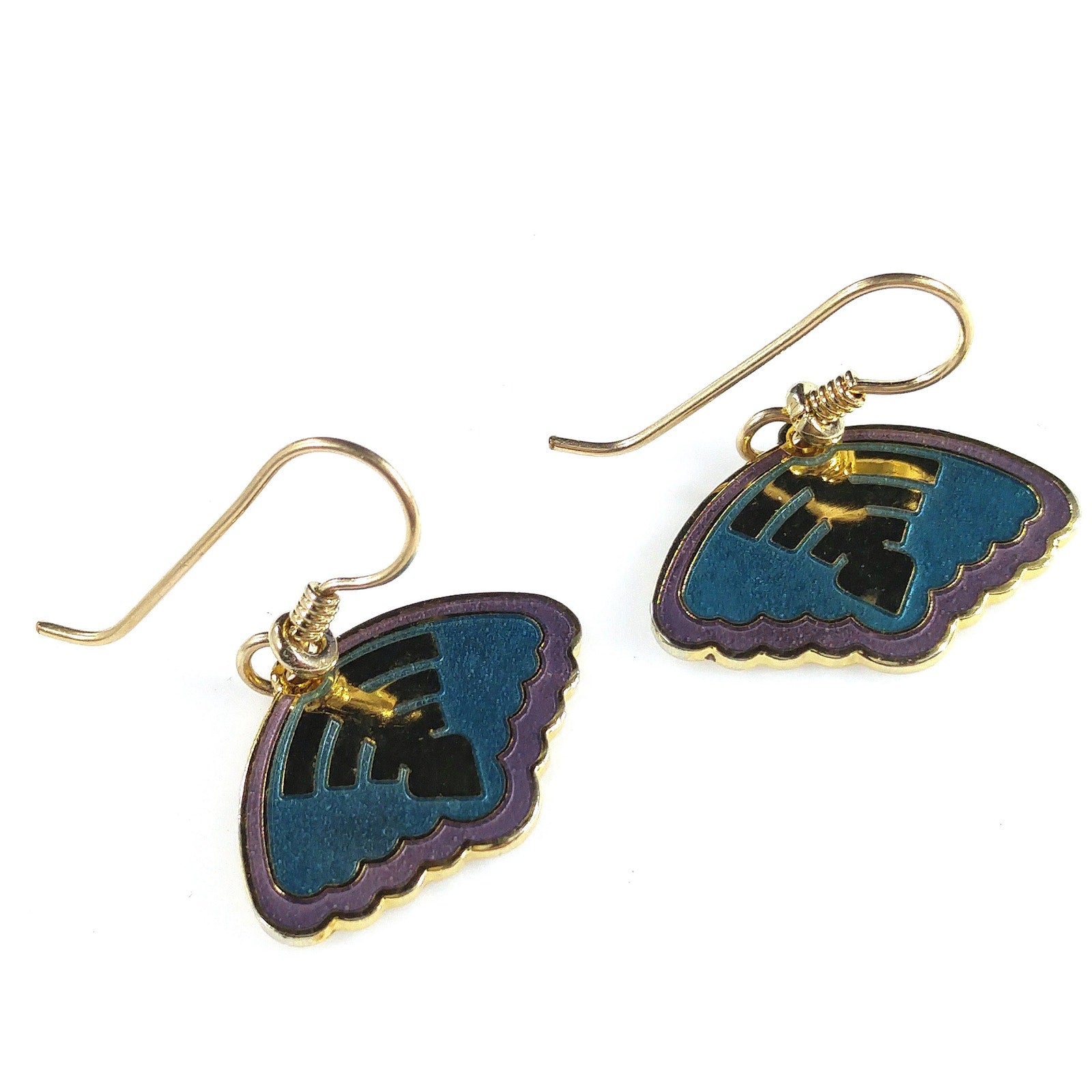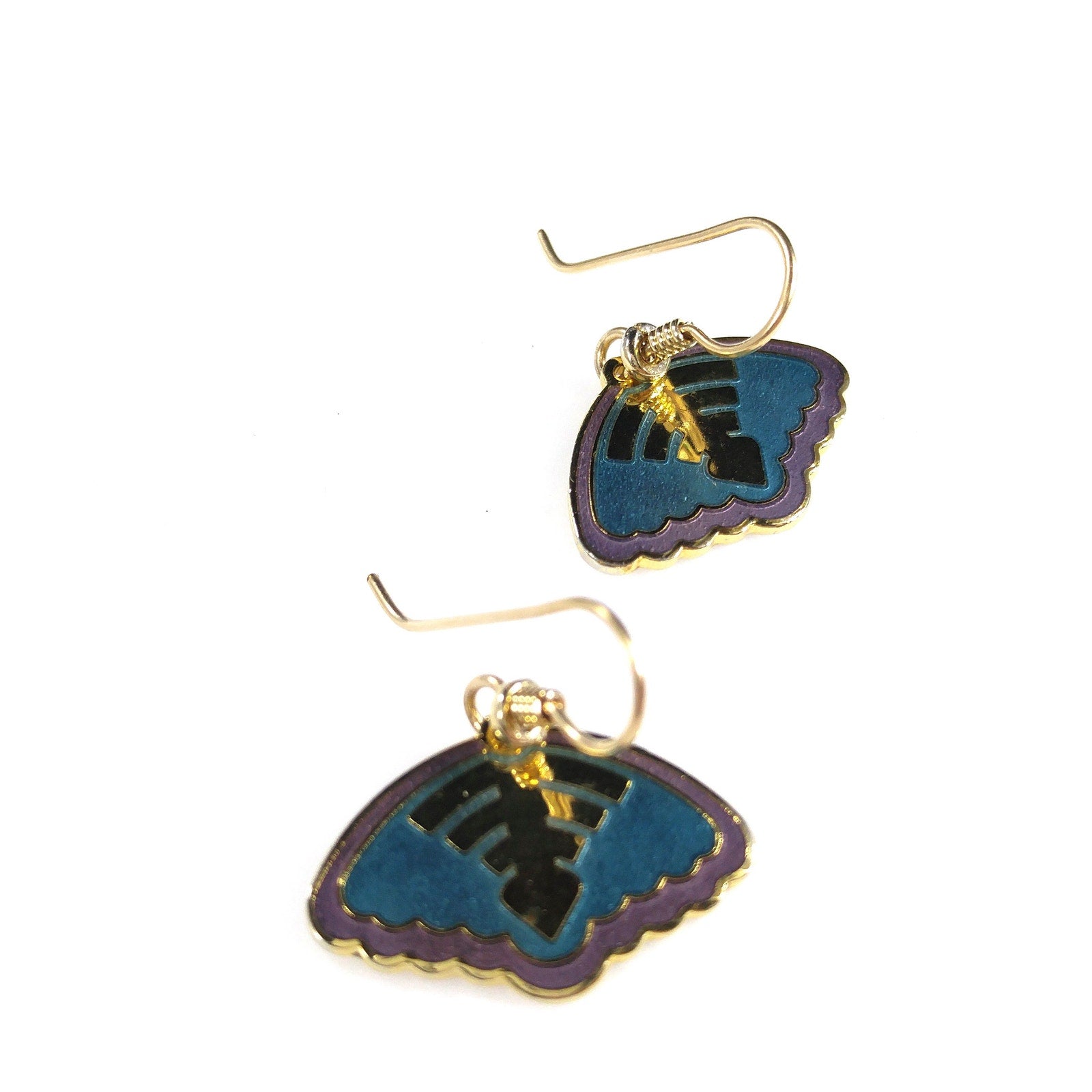 *Description: This is a great pair of vintage Laurel Burch earrings in cloisonne gold plate and enamel in teal and purple from the 1980s. The enamel has an almost metallic appearance and the teal and purple look beautiful together outlined in gold. The design looks like an abstract butterfly. This would be a great addition to your vintage jewelry collection or make a great vintage gift!