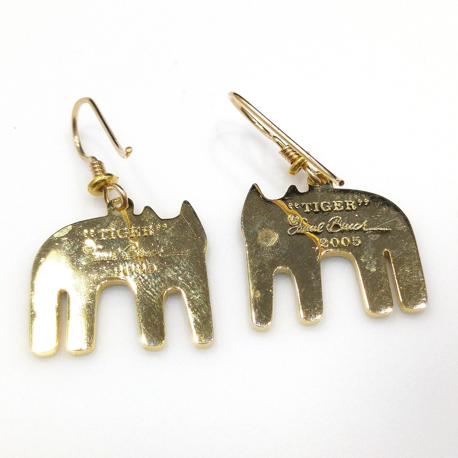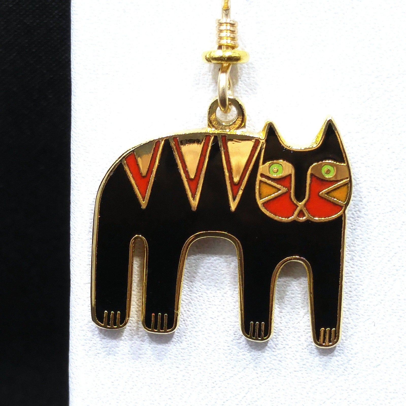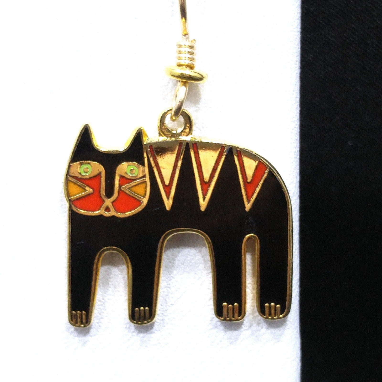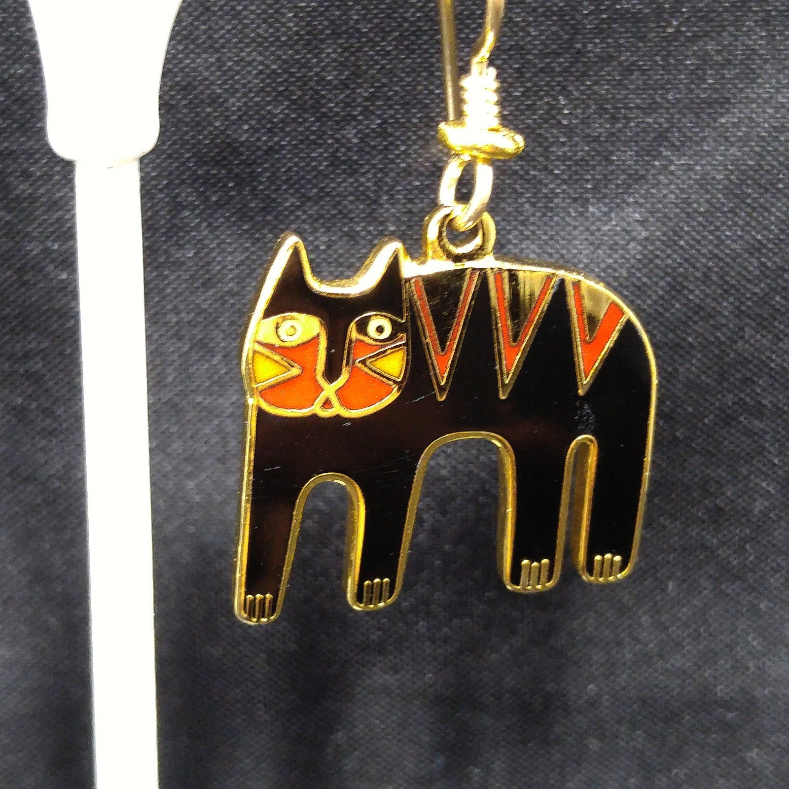 Vintage Laurel Burch "Tiger" Drop Earrings, Gold Plated, Black Red Enamel, 2005