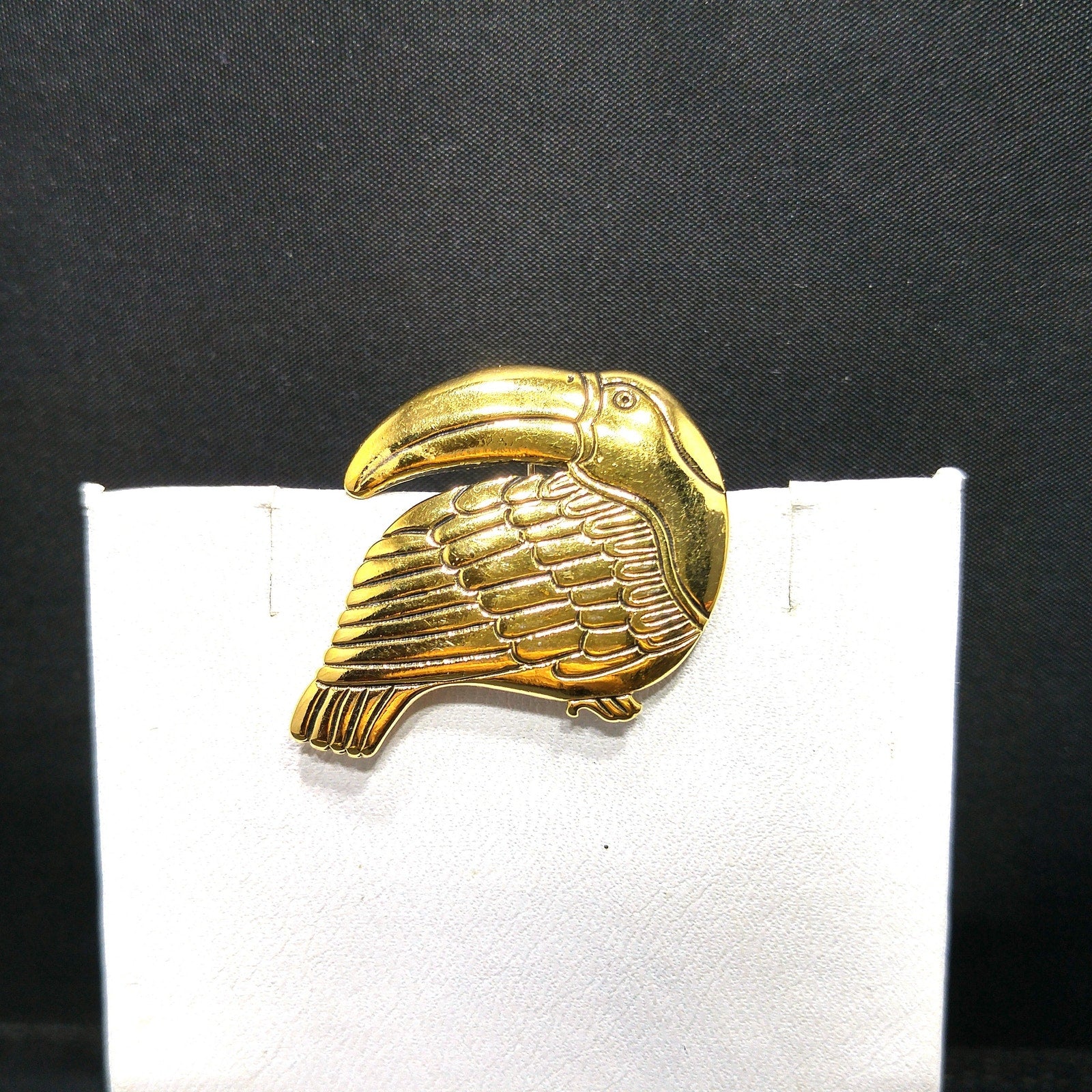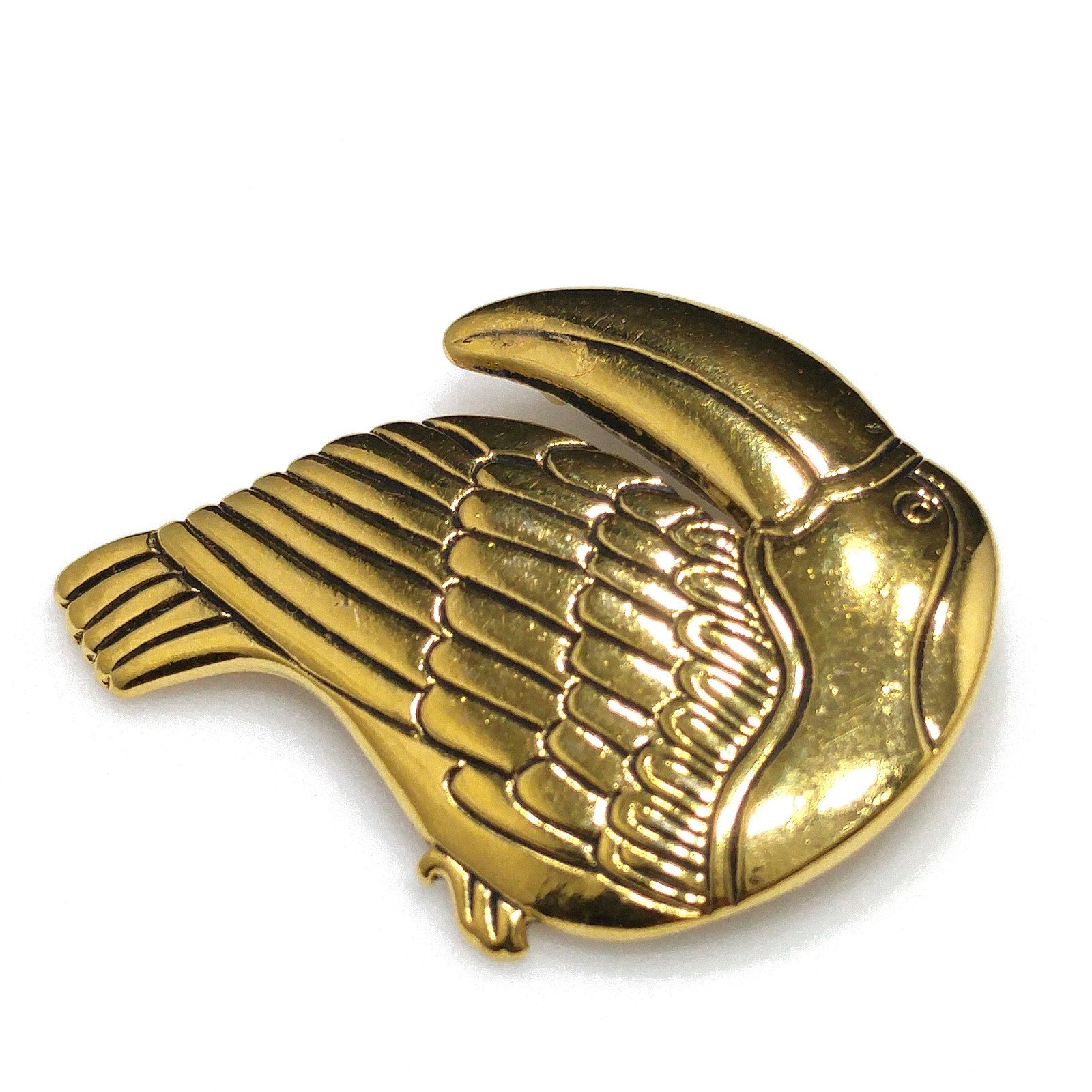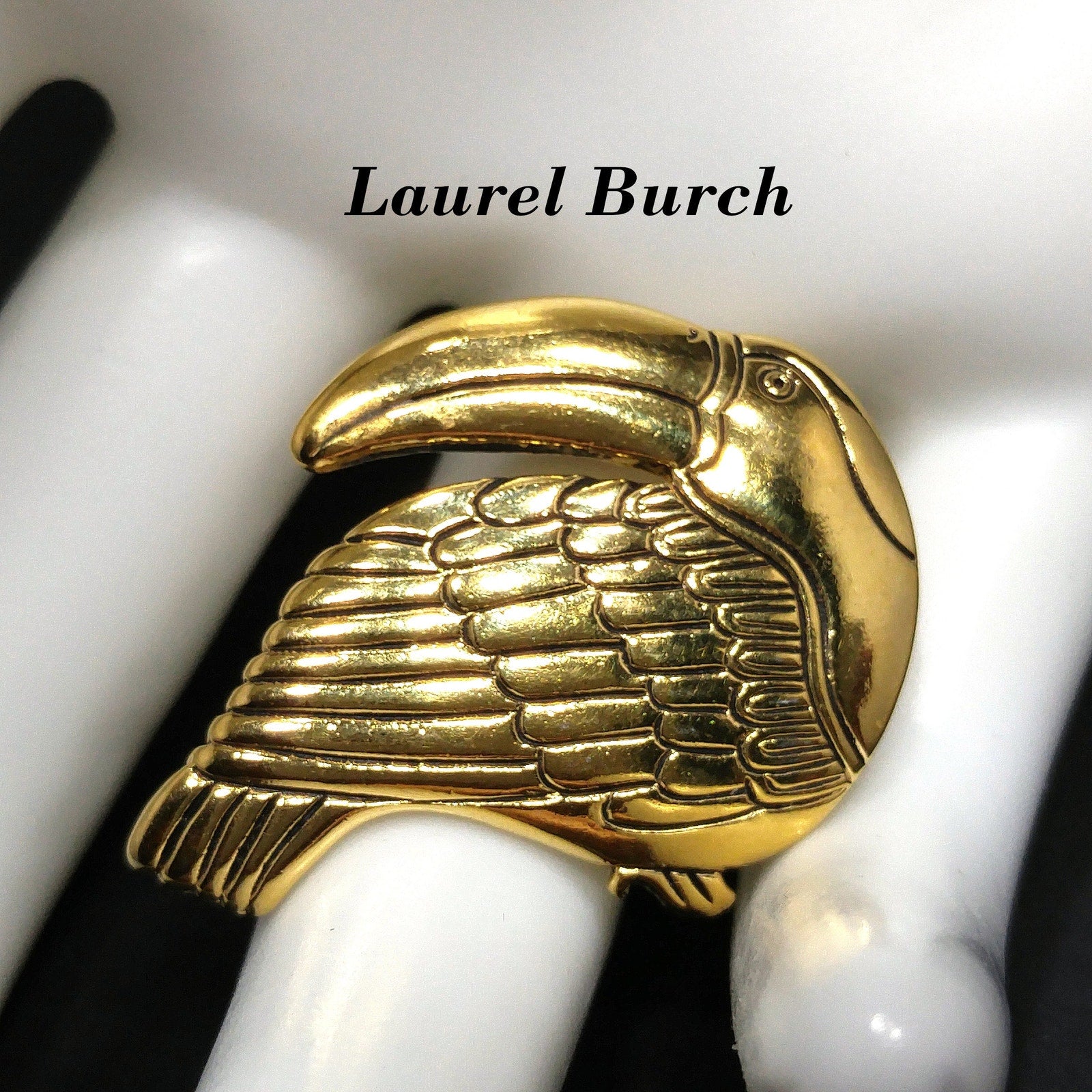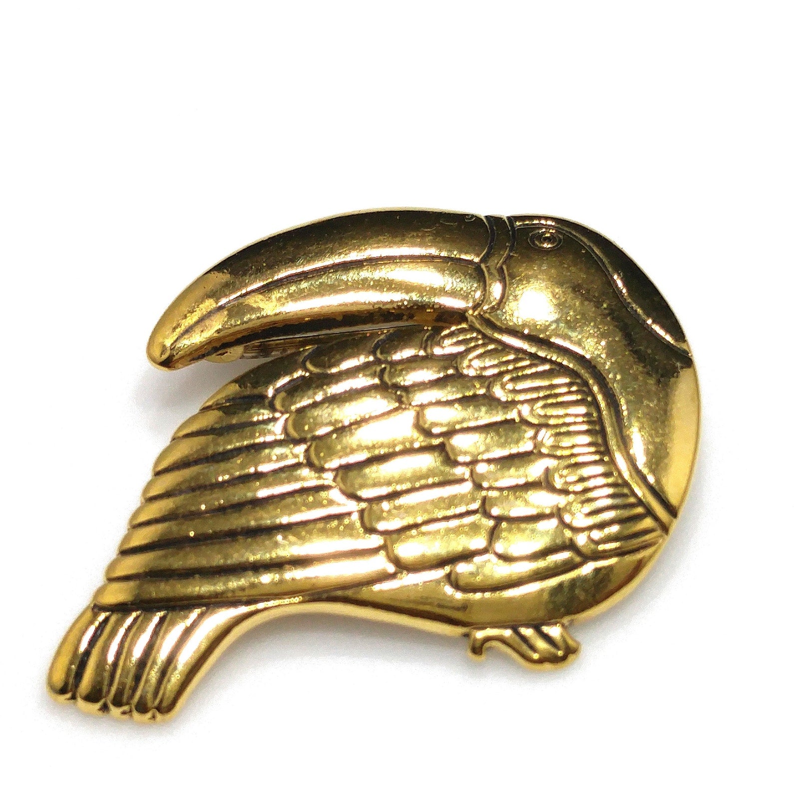 *Description: This is an beautiful Laurel Burch toucan brooch pin with black enamel within the creases of the design on the gold plated metal from the 1980s. This particular toucan brooch pin by Laurel Burch is facing to our left. Laurel Burch had toucan designs facing right and left. This is a great brooch to add to your collection or give as a gift to any animal or bird lover. This would be a great addition to your vintage jewelry collection or make a great vintage gift!