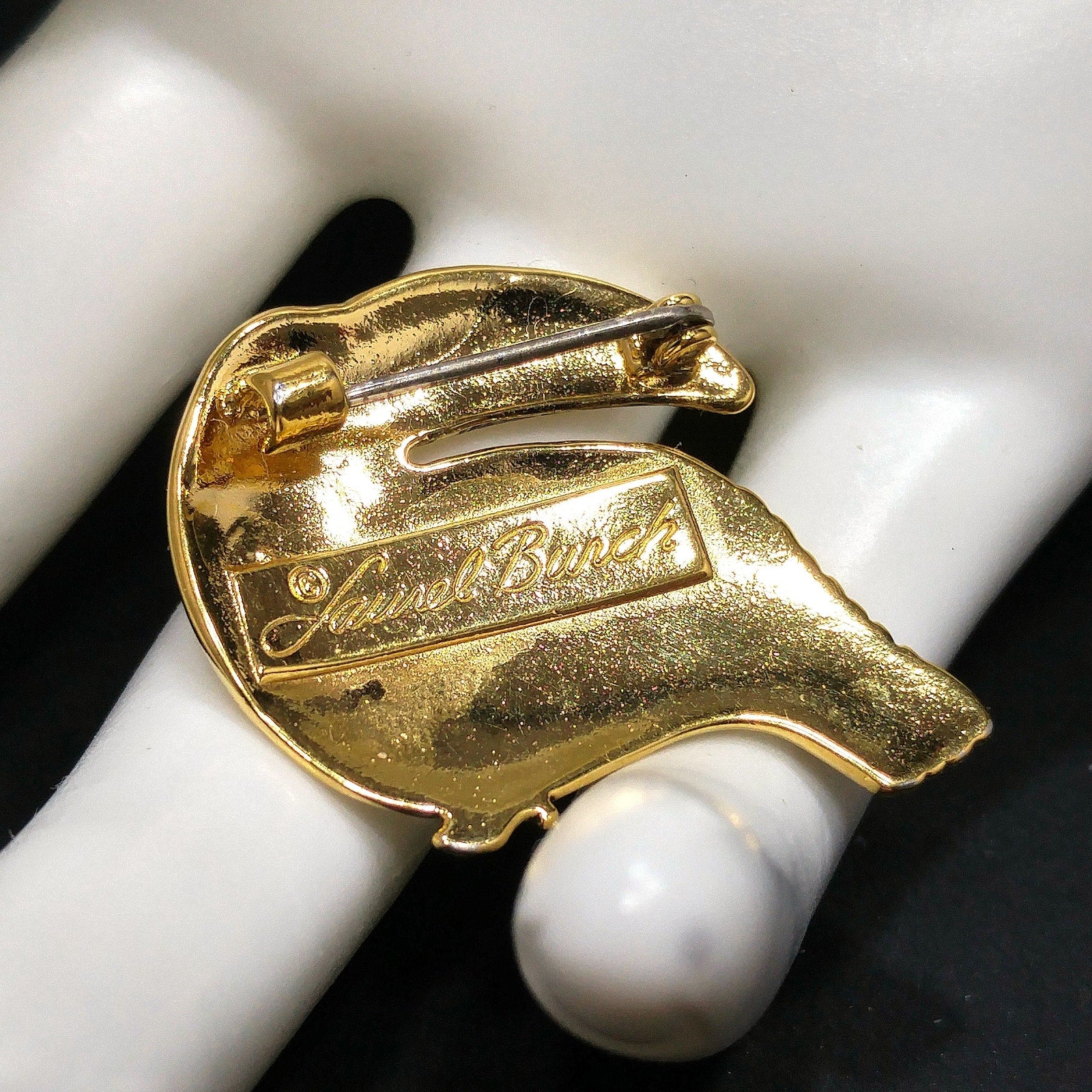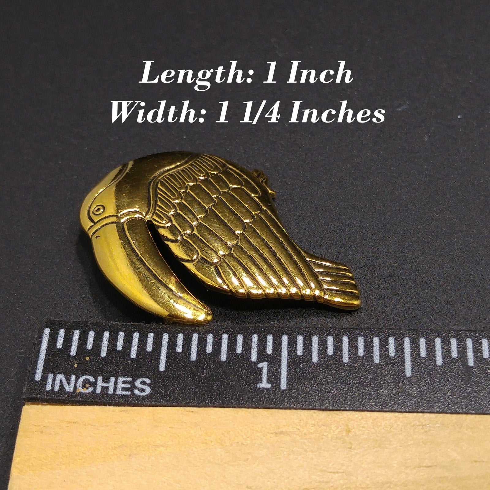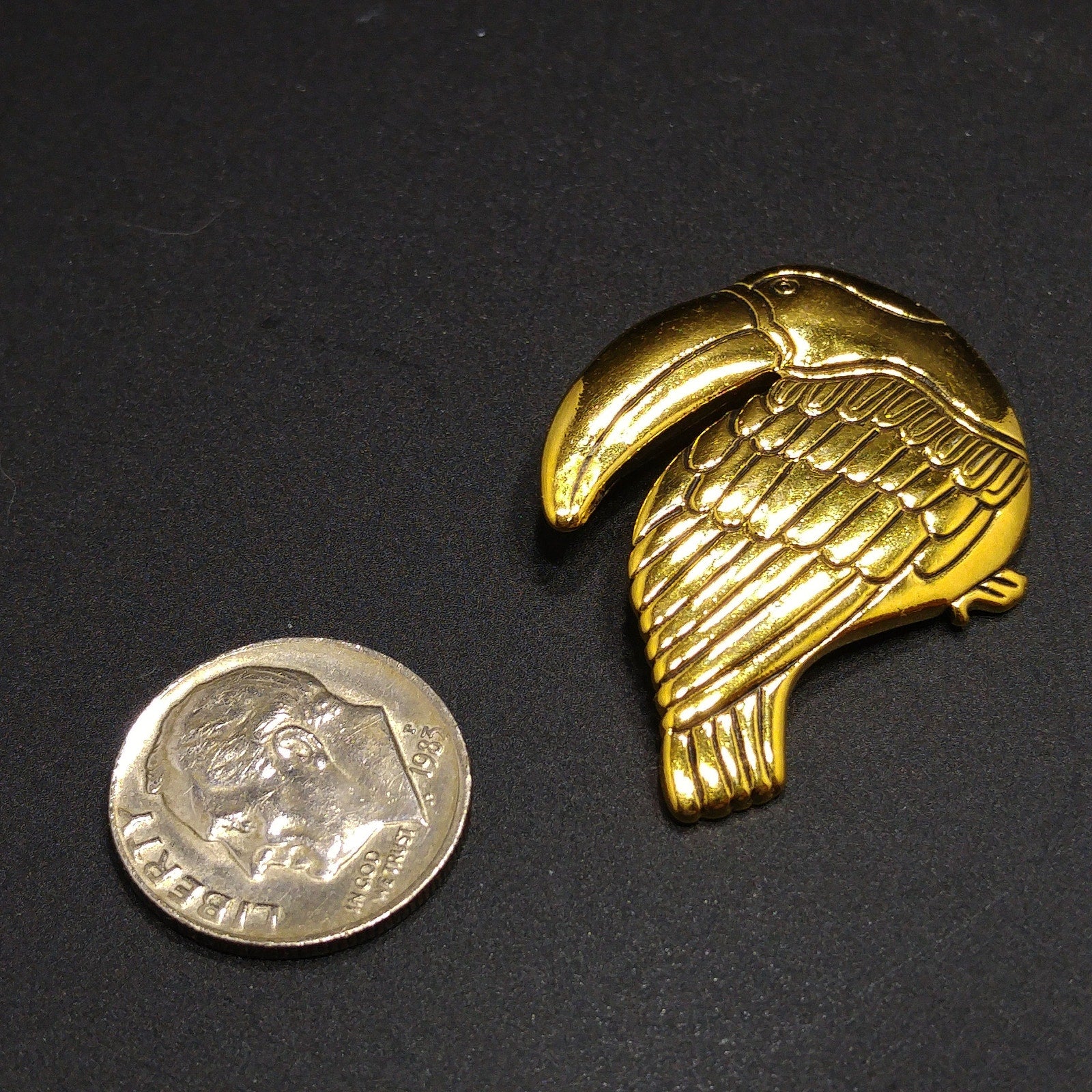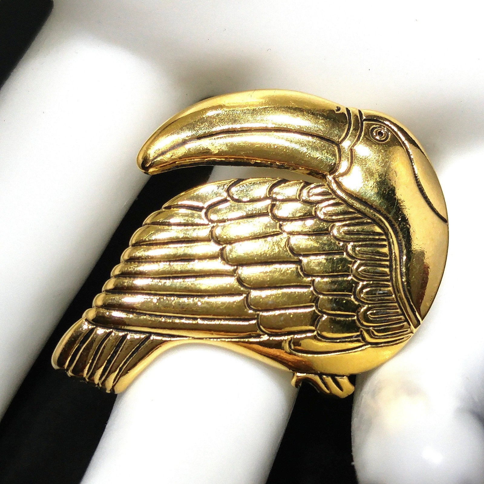 *Description: This is an beautiful Laurel Burch toucan brooch pin with black enamel within the creases of the design on the gold plated metal from the 1980s. This particular toucan brooch pin by Laurel Burch is facing to our left. Laurel Burch had toucan designs facing right and left. This is a great brooch to add to your collection or give as a gift to any animal or bird lover. This would be a great addition to your vintage jewelry collection or make a great vintage gift!