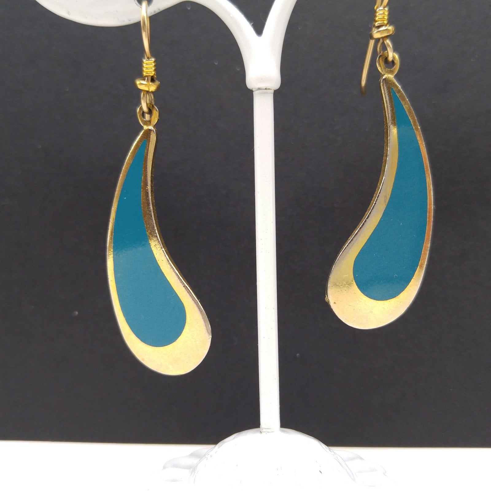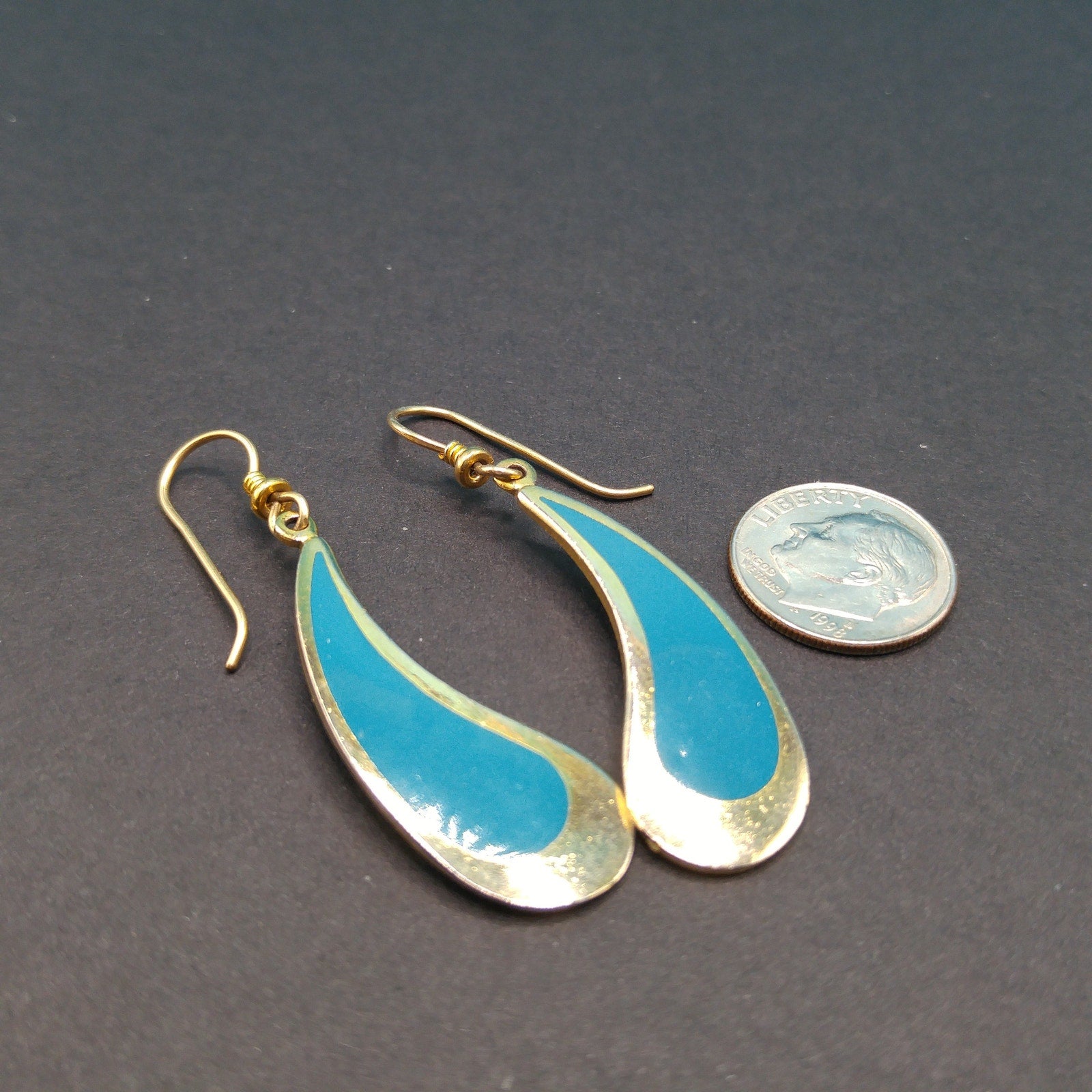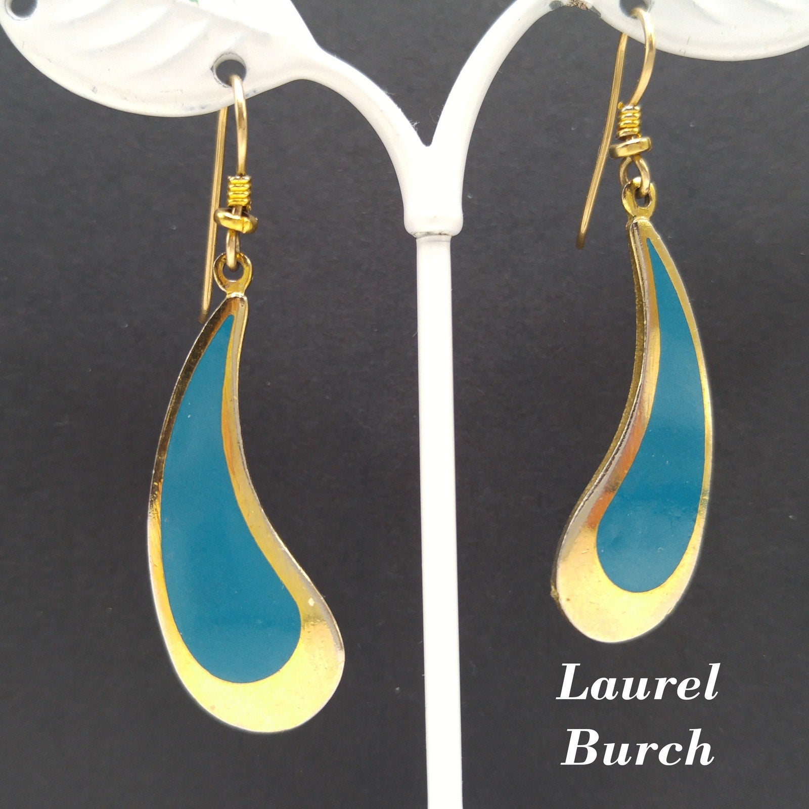 *Description: This is a beautiful pair of Laurel Burch curved teardrop cloisonne turquoise enamel earrings with gold plated backing and gold filled ear wires from the 1980s. This would be a great addition to your vintage jewelry collection or make a great vintage gift!