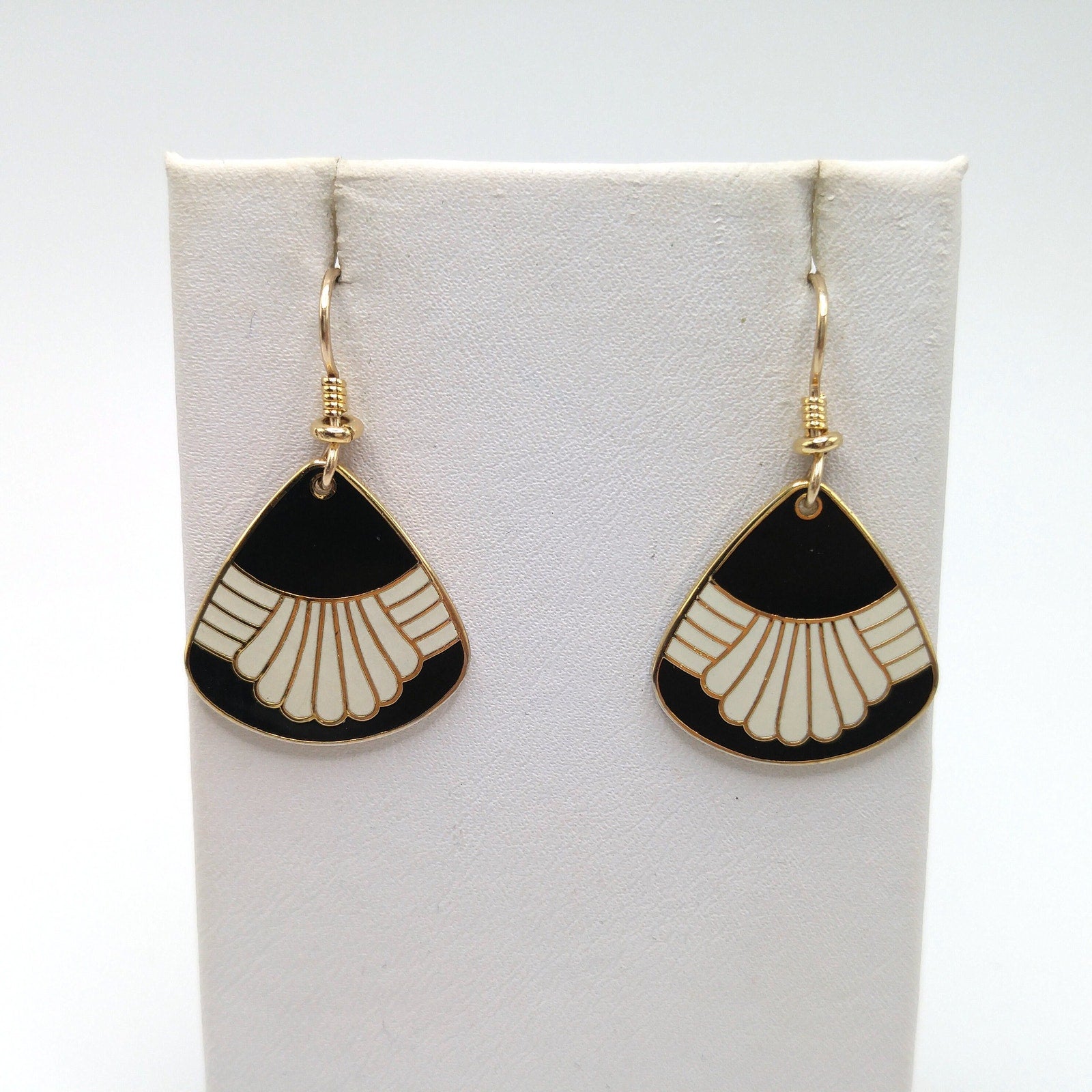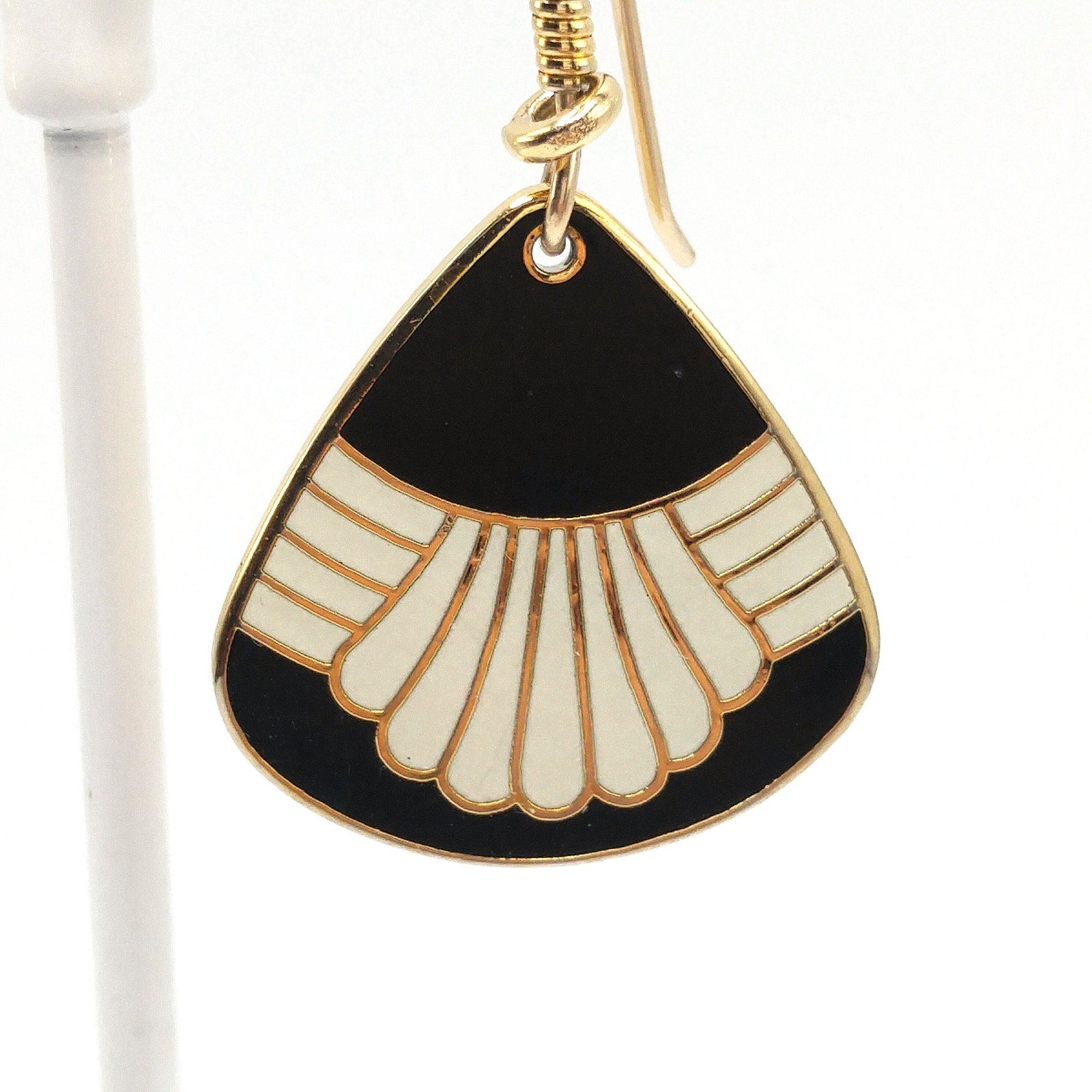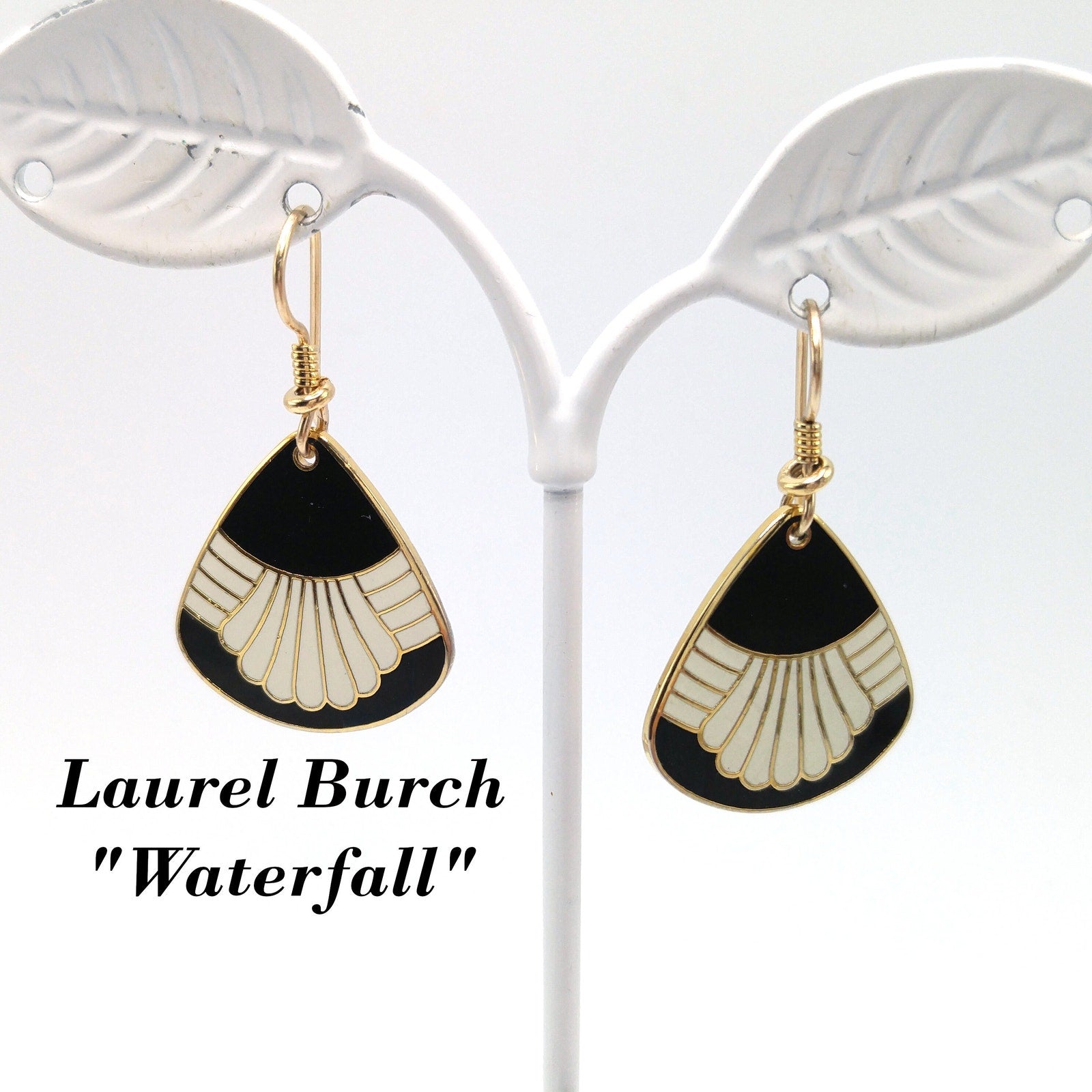 *Description: This is a beautiful pair of Laurel Burch black and white enamel, gold plated waterfall design earrings on a teardrop shaped earring from the 1980s. There are cloisonné gold plated backing and outlines on each earring. These earrings are perfect for someone who loves the beach as they remind you of a shell. These earrings are signed on the back of each with the designer's name, Laurel Burch and "Waterfall".