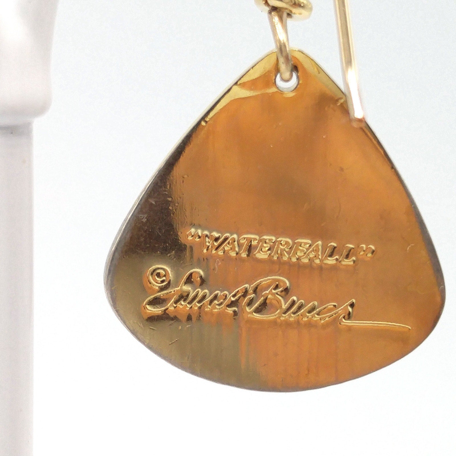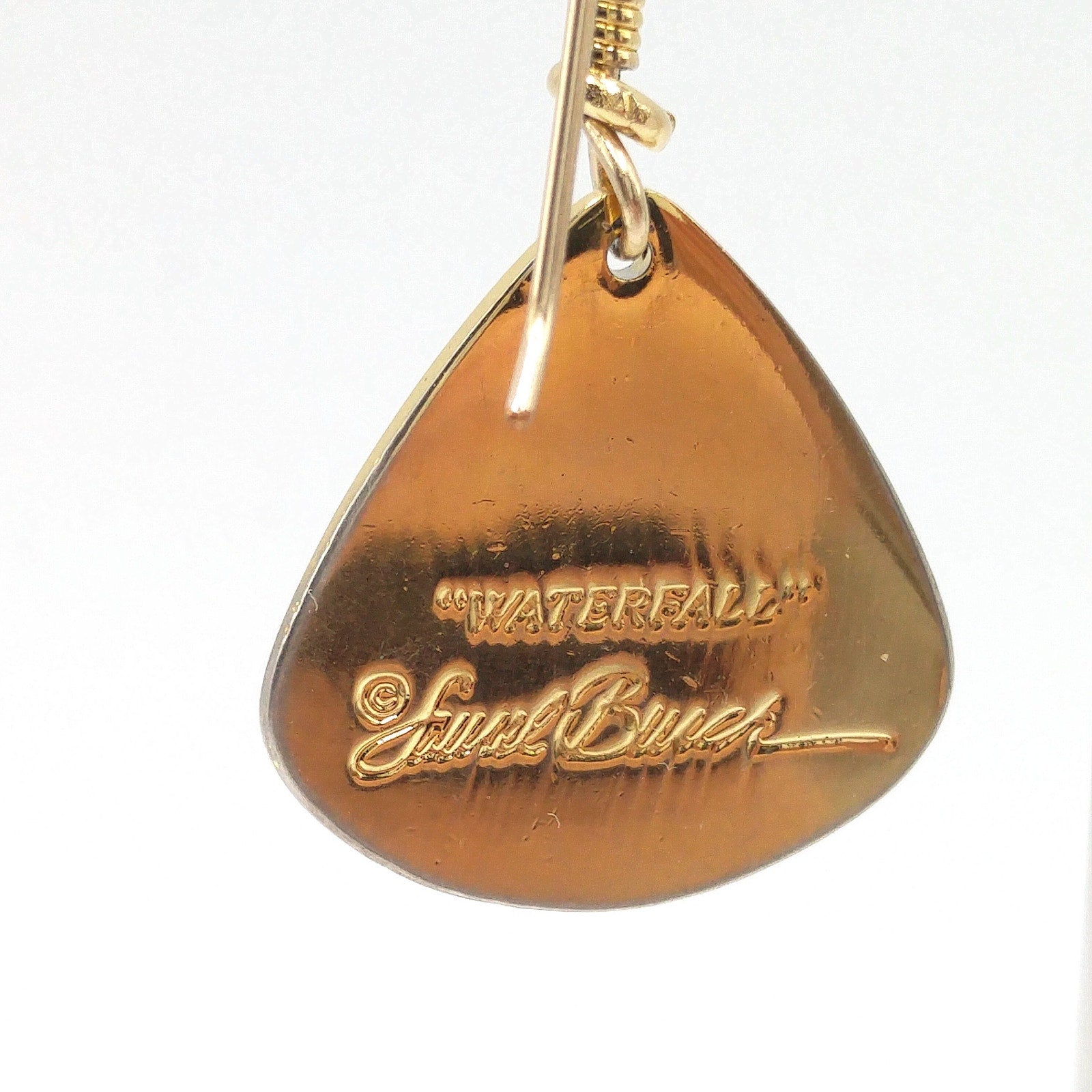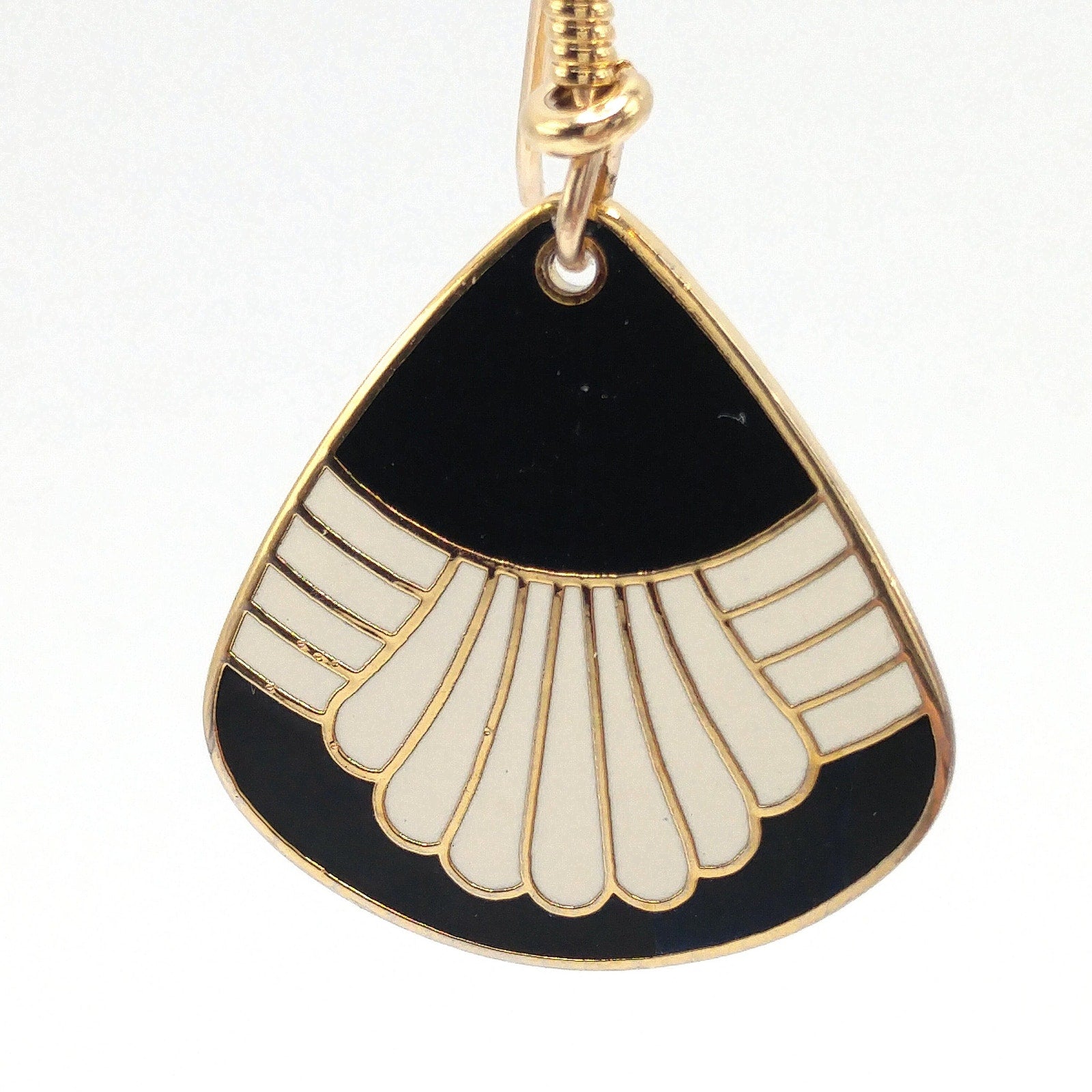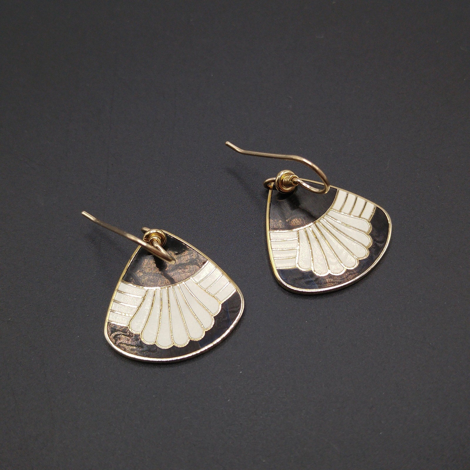 *Description: This is a beautiful pair of Laurel Burch black and white enamel, gold plated waterfall design earrings on a teardrop shaped earring from the 1980s. There are cloisonné gold plated backing and outlines on each earring. These earrings are perfect for someone who loves the beach as they remind you of a shell. These earrings are signed on the back of each with the designer's name, Laurel Burch and "Waterfall".