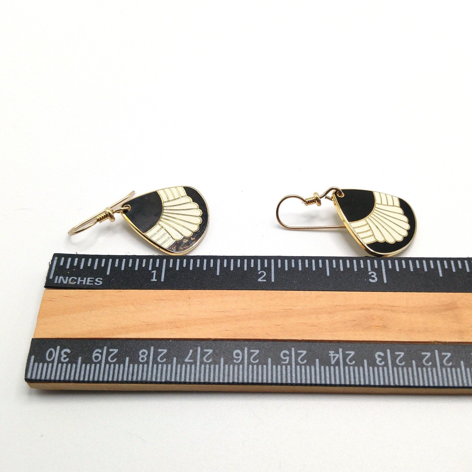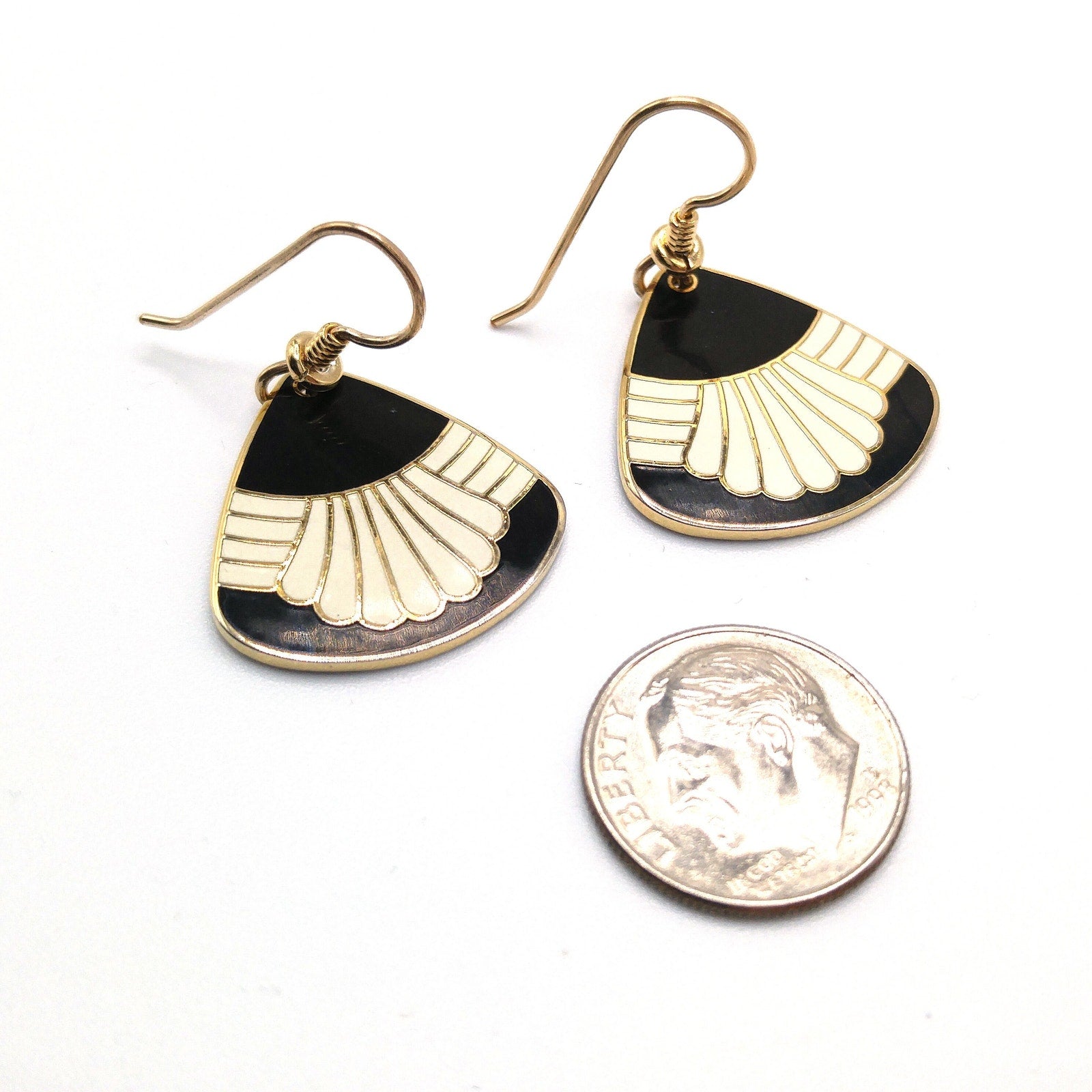 Vintage Laurel Burch "Waterfall" Drop Earrings, Black White Enamel, Gold Plated