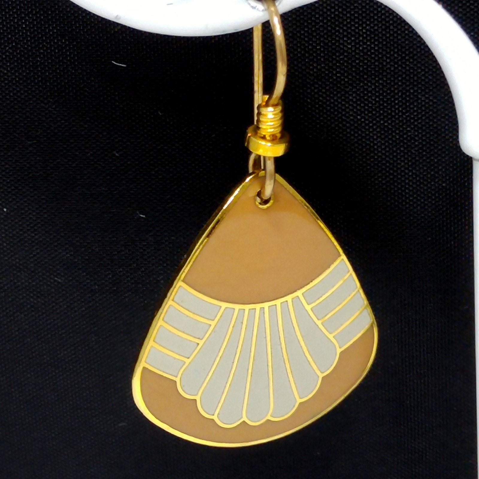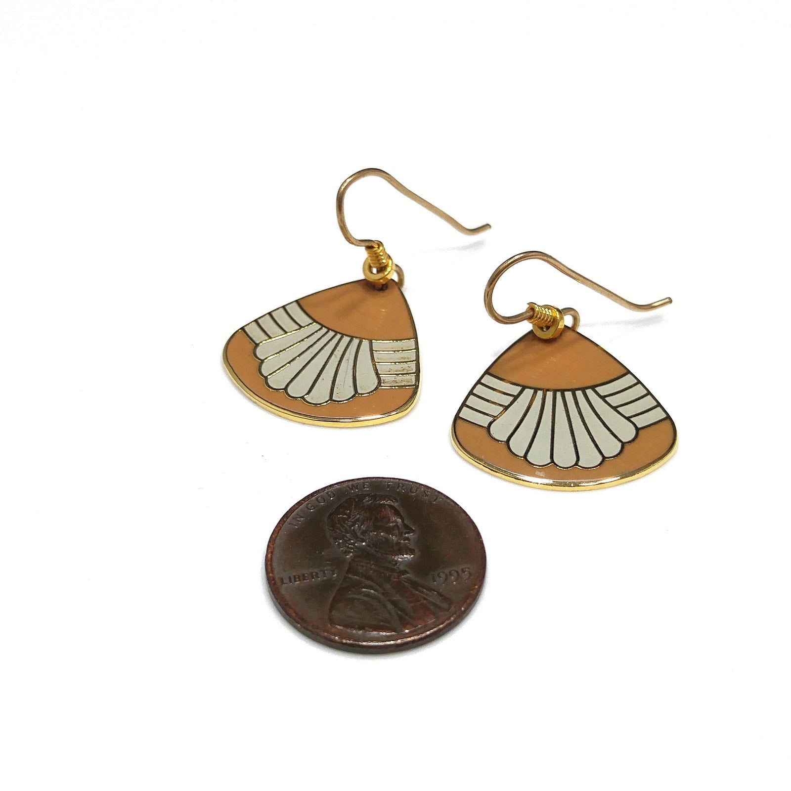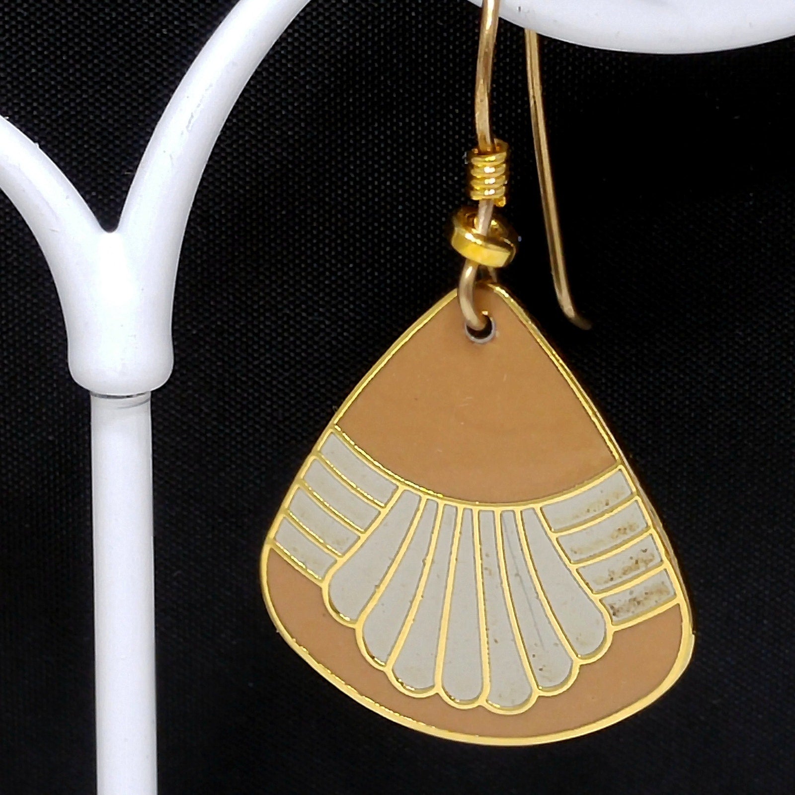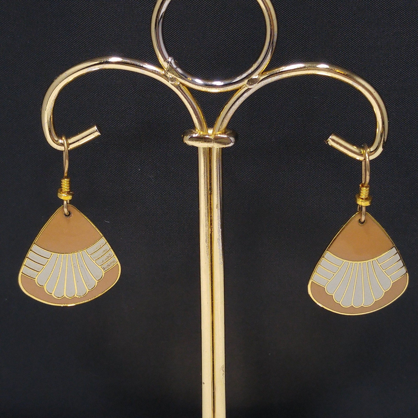 *Description: This is a beautiful pair of Laurel Burch gold plated waterfall design earrings on a fan shaped earring from the 1980s. The cloisonné gold plated backing and outlines are highlighted with beige enamel and a very light gray enamel. The designer earrings are signed on the back of each. The ear wires are gold filled. This would be a great addition to your vintage jewelry collection or make a great vintage gift!