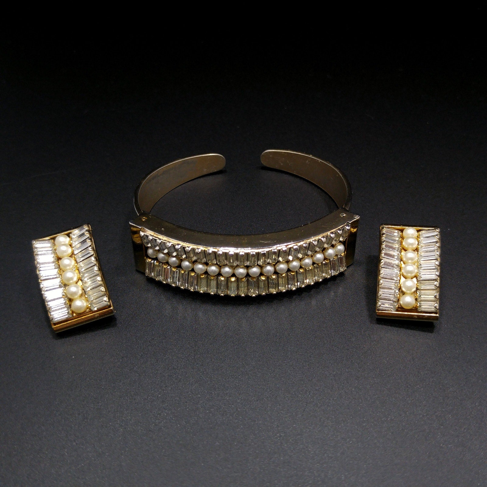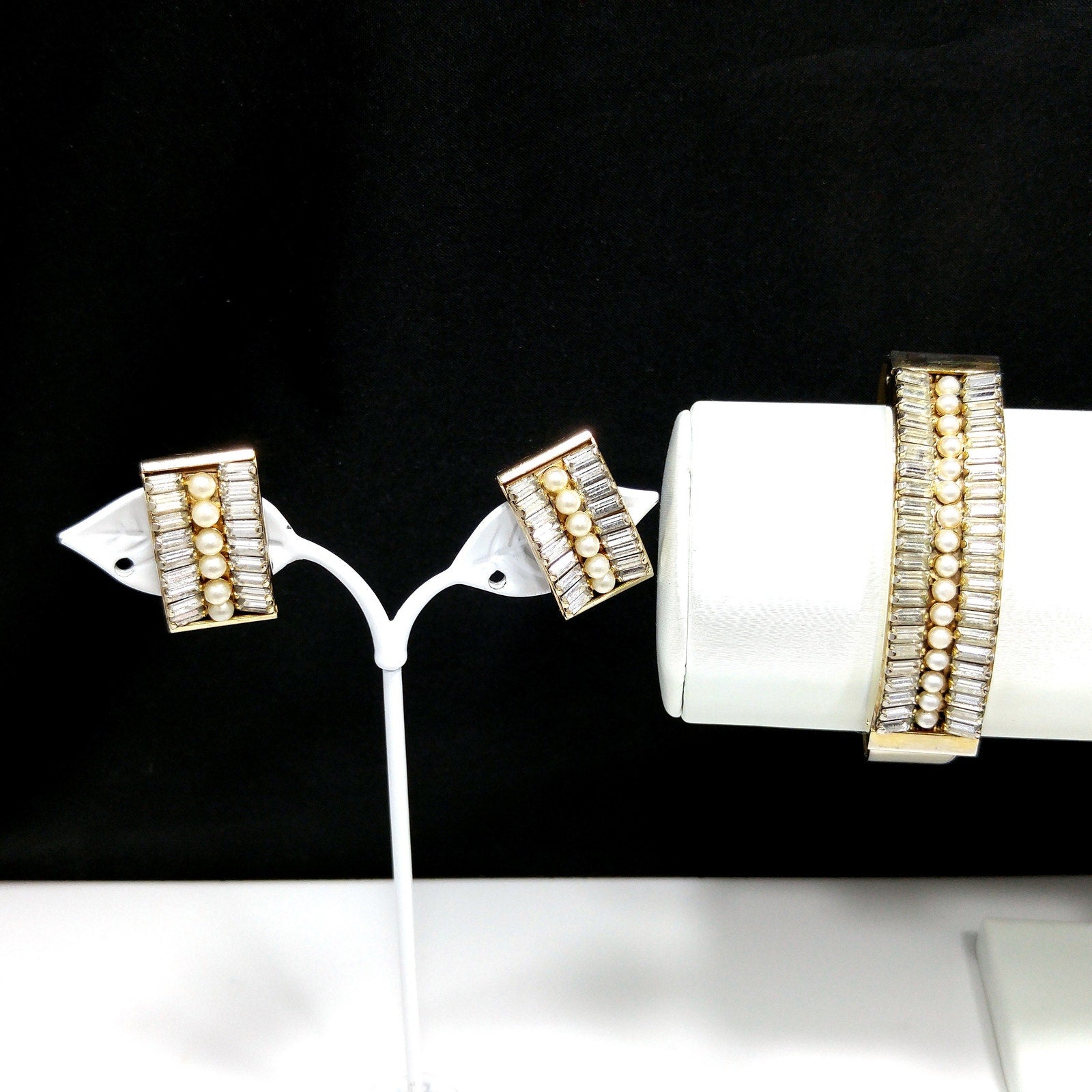 Vintage Leru Baguette Rhinestone & Pearl Cuff Bracelet & Clip Earrings Set 1950s