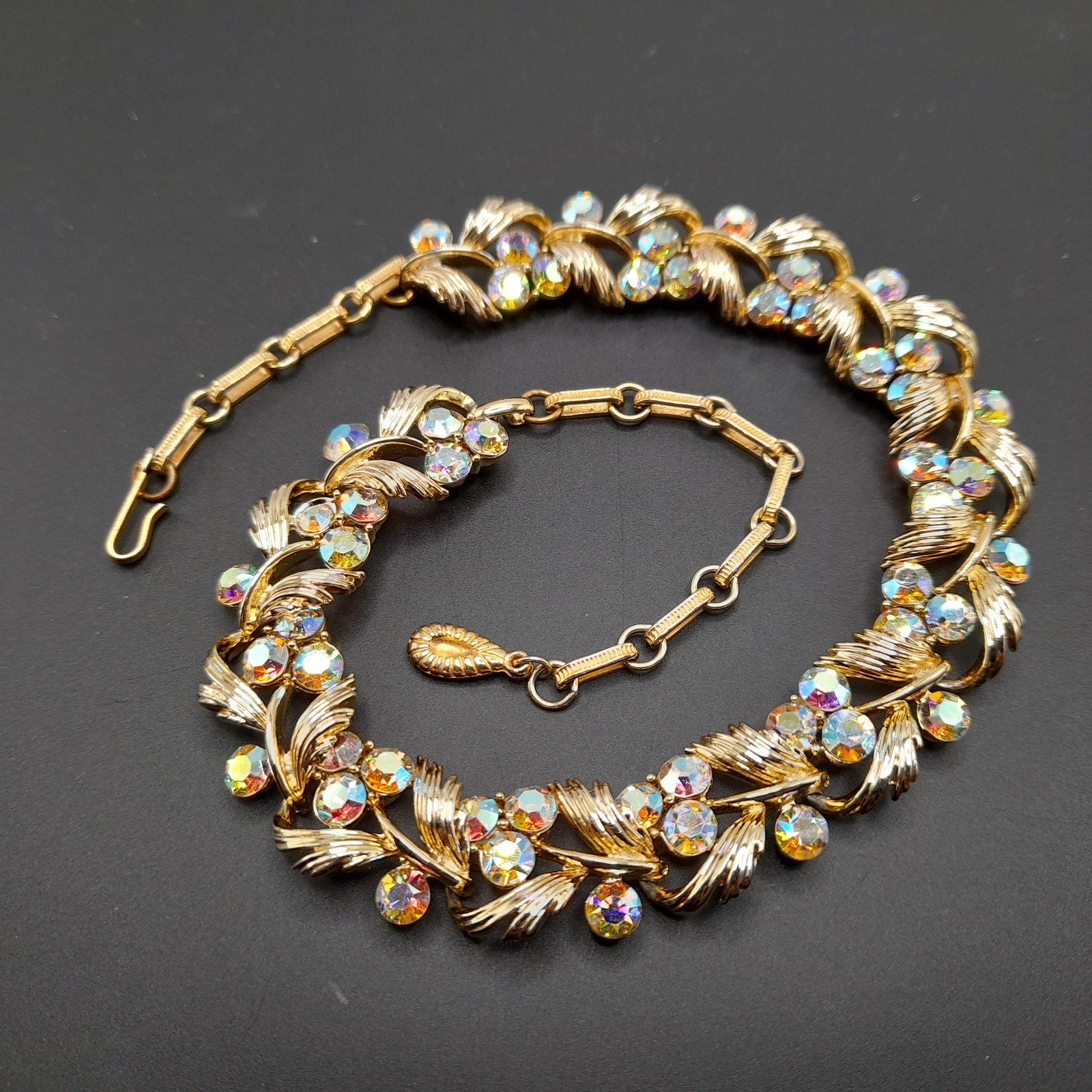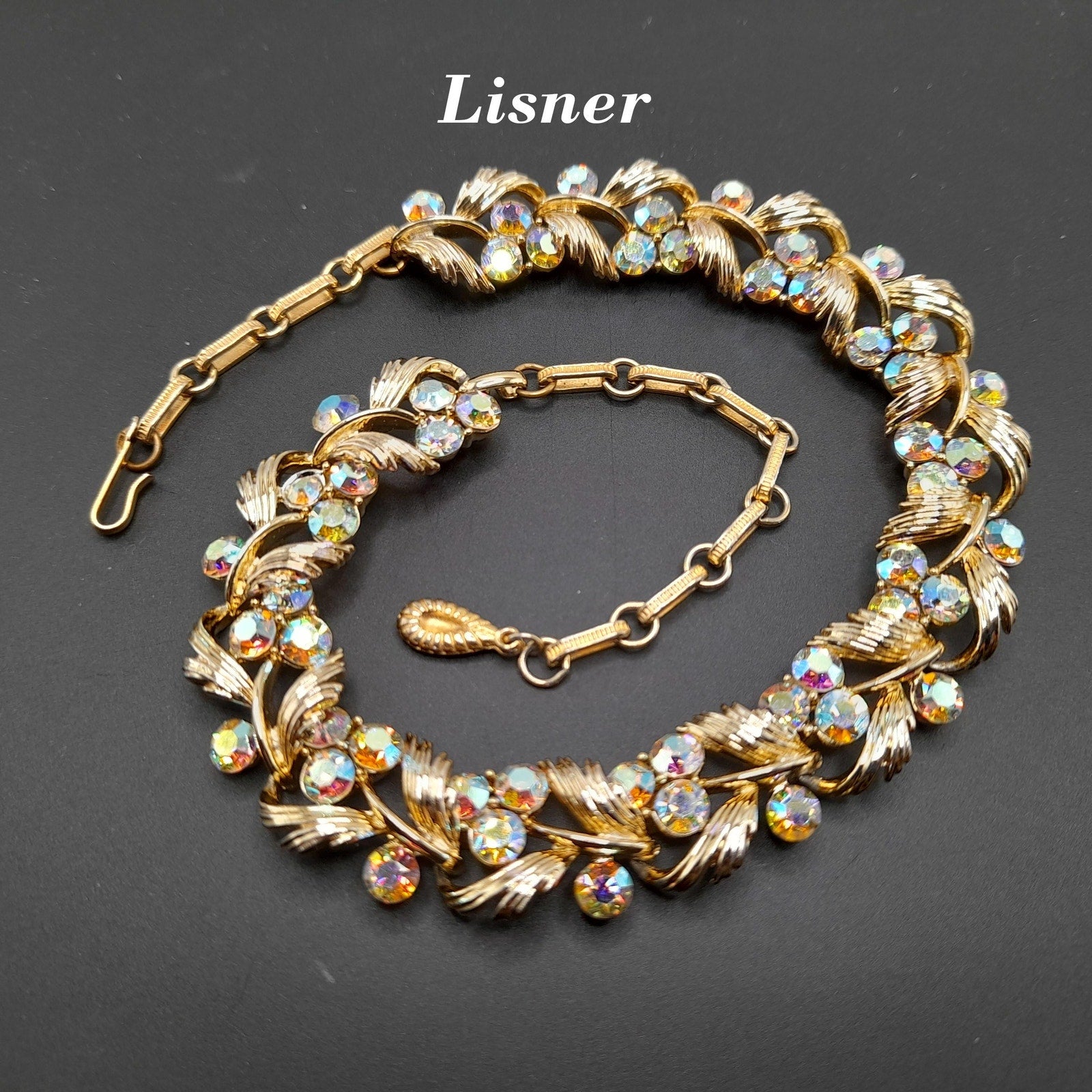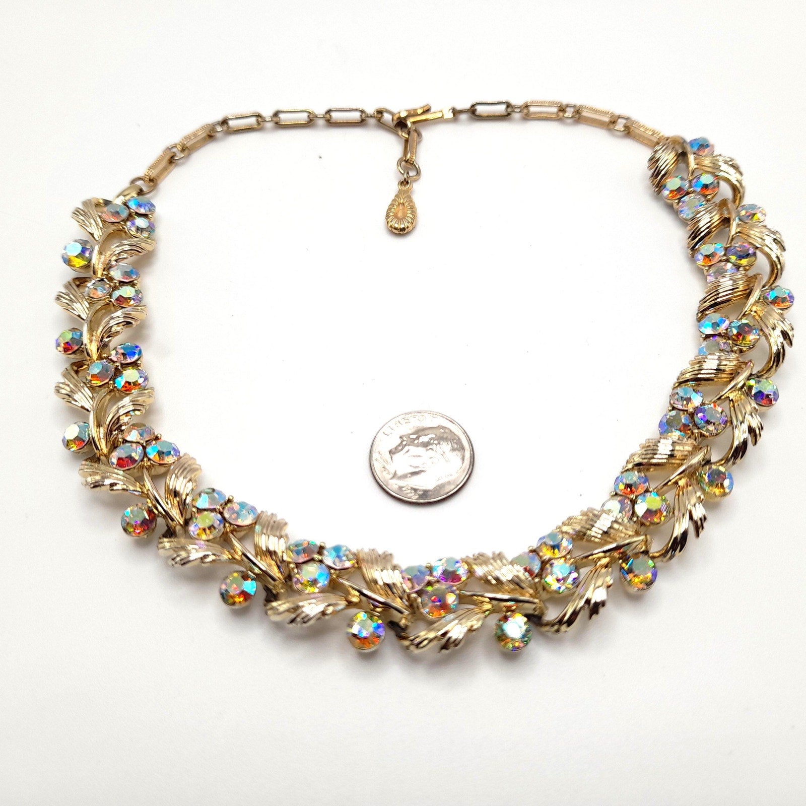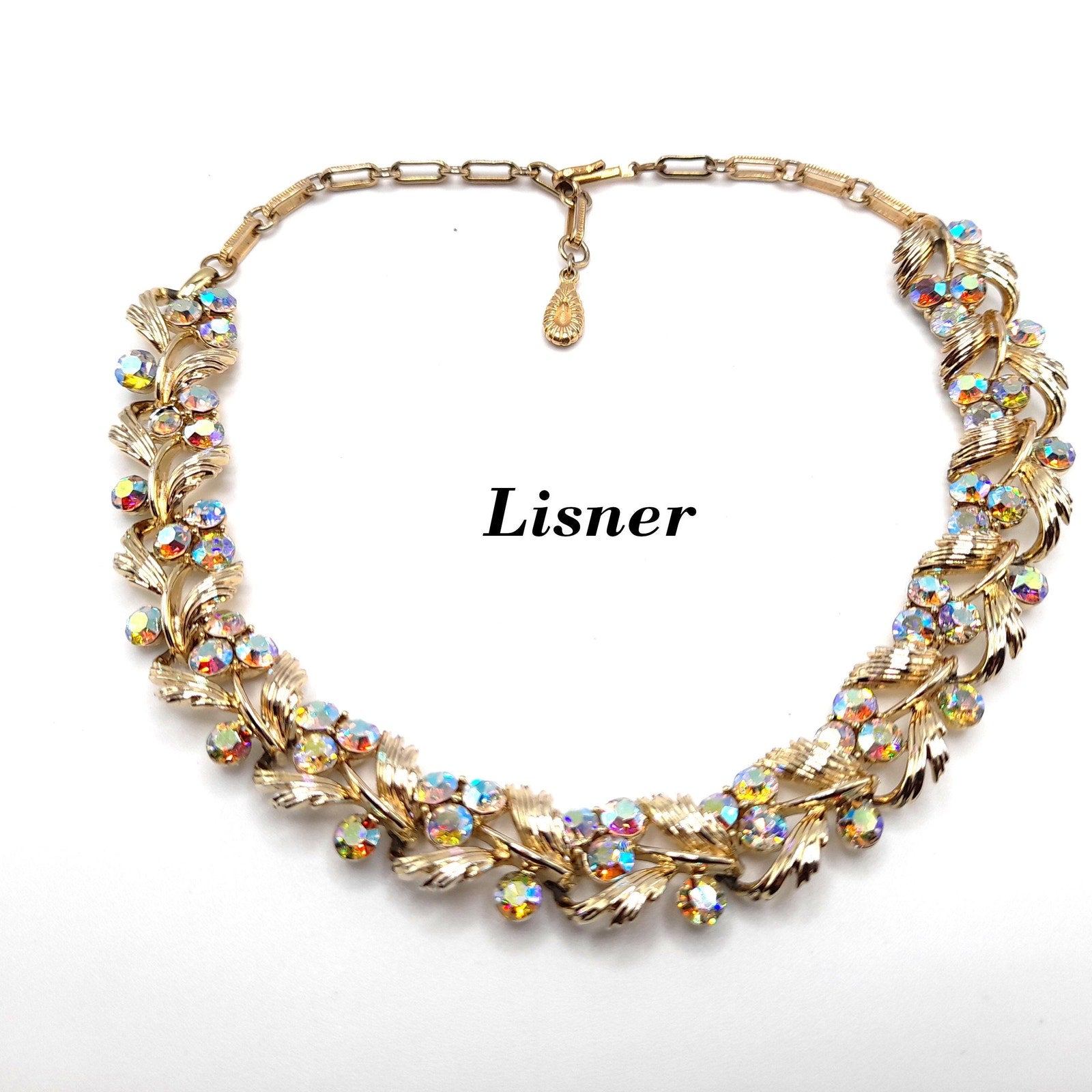 *Description: This is a beautiful vintage Lisner choker necklace with aurora borealis rhinestones on a gold tone finish from the 1950s. This would make a gorgeous wedding necklace or worn on any special occasion. It has four rhinestones on each link which are full of sparkle and color. This would be a great addition to your vintage jewelry collection or make a great vintage gift!