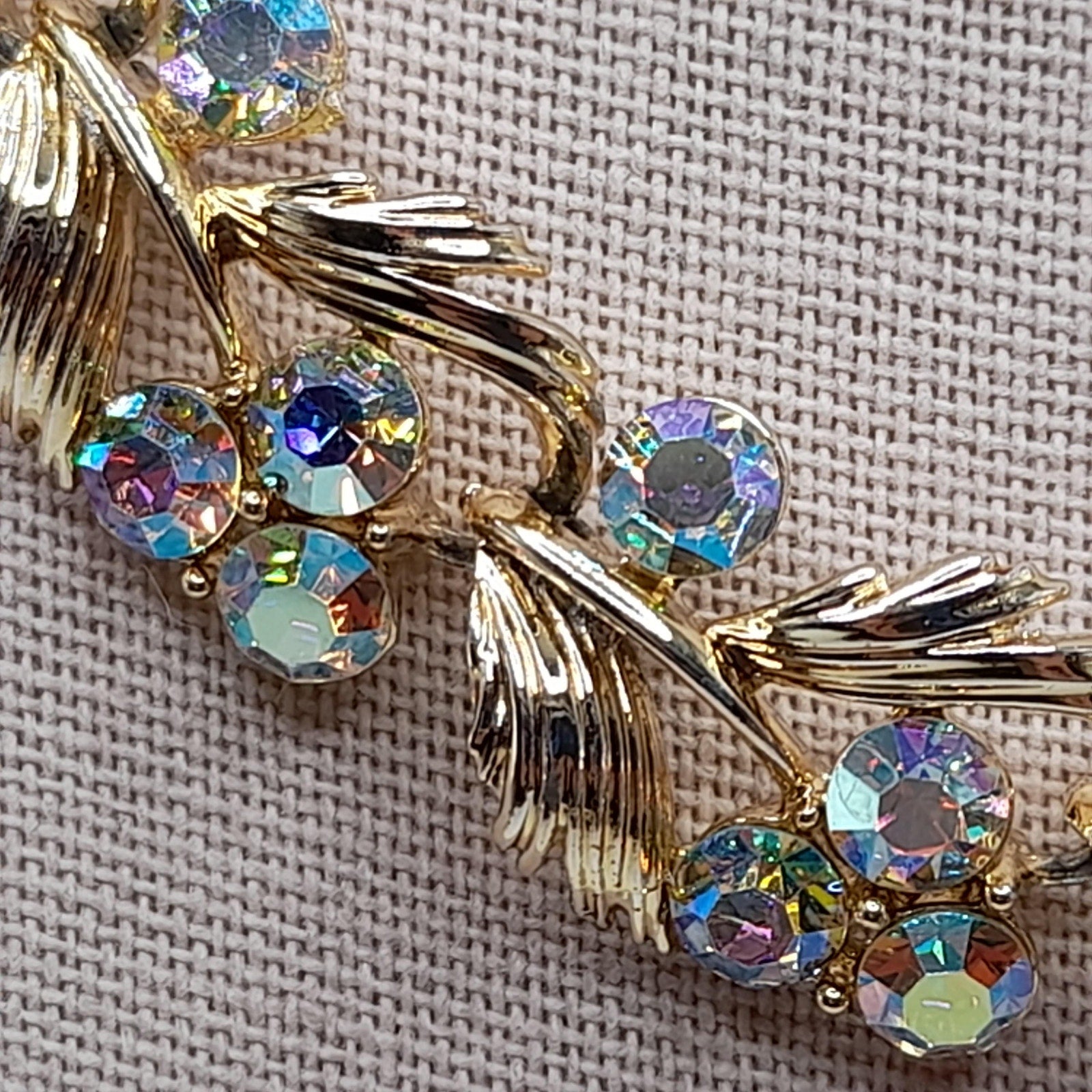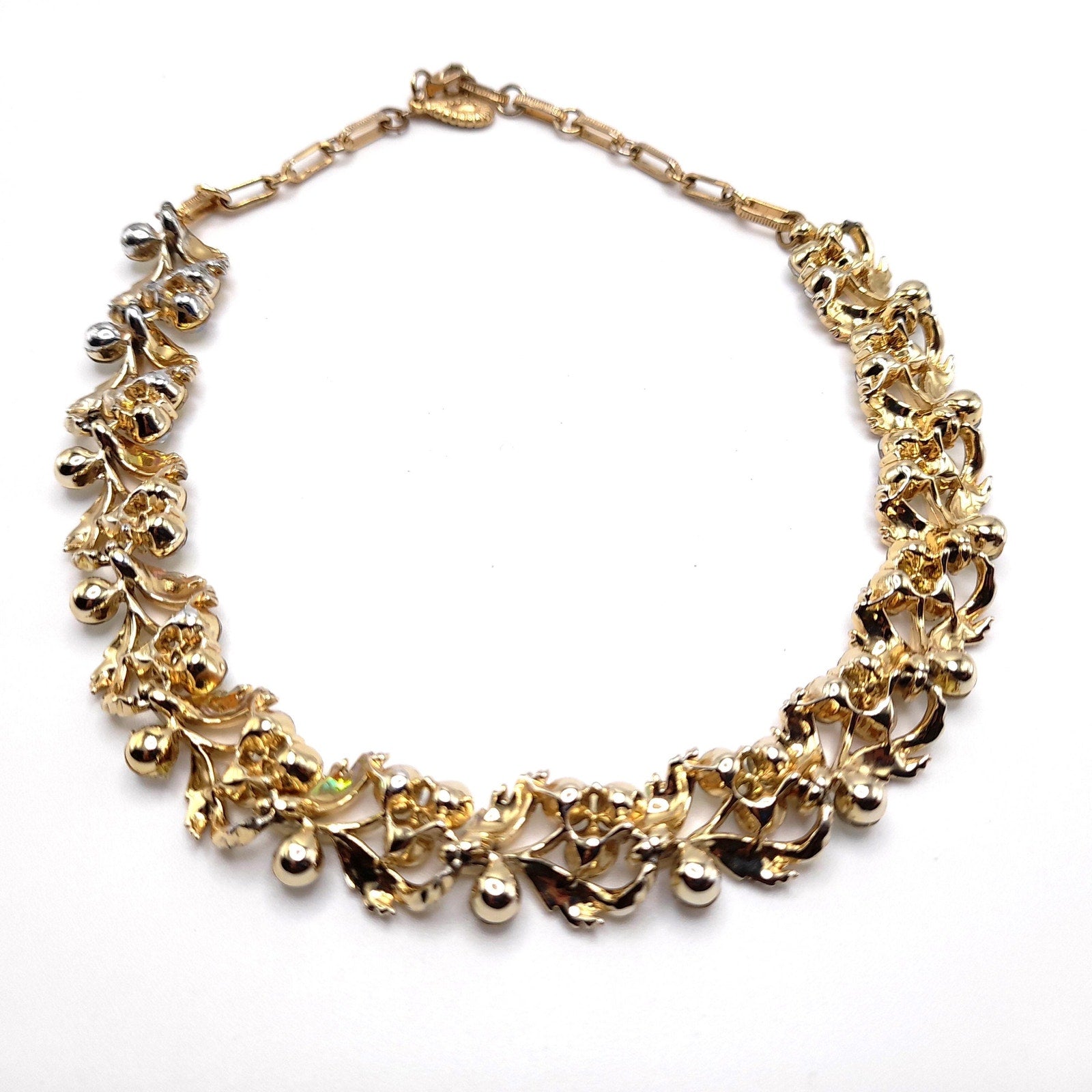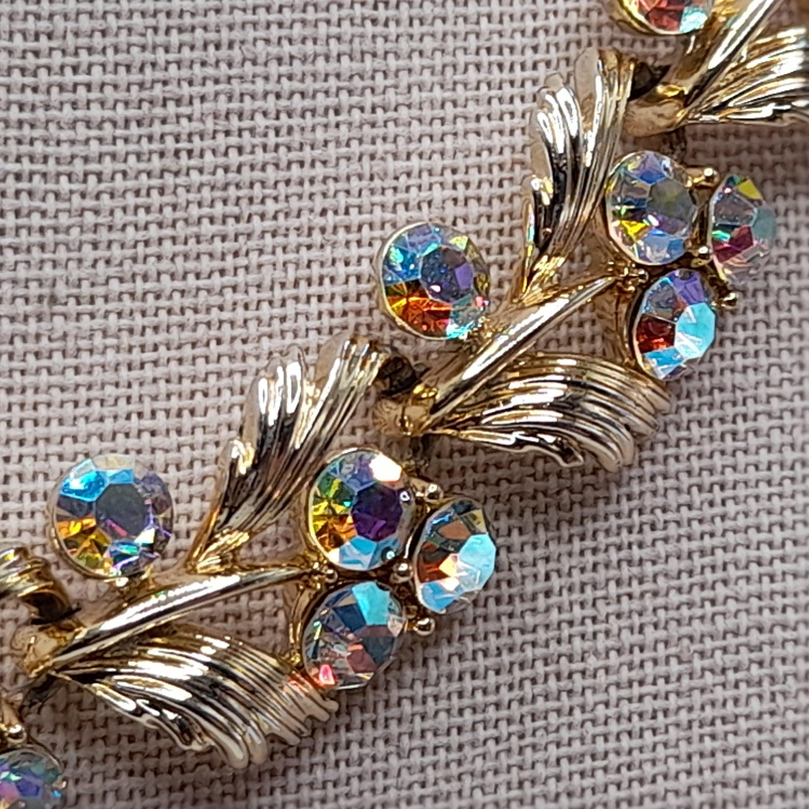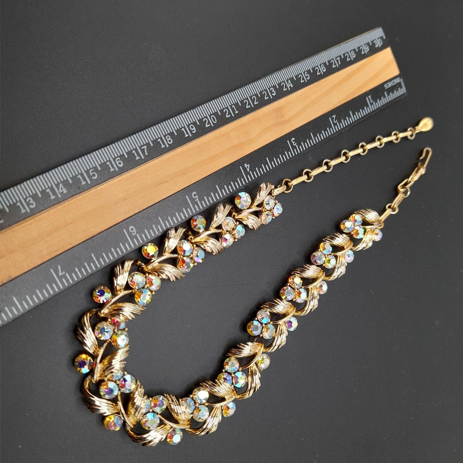 *Description: This is a beautiful vintage Lisner choker necklace with aurora borealis rhinestones on a gold tone finish from the 1950s. This would make a gorgeous wedding necklace or worn on any special occasion. It has four rhinestones on each link which are full of sparkle and color. This would be a great addition to your vintage jewelry collection or make a great vintage gift!