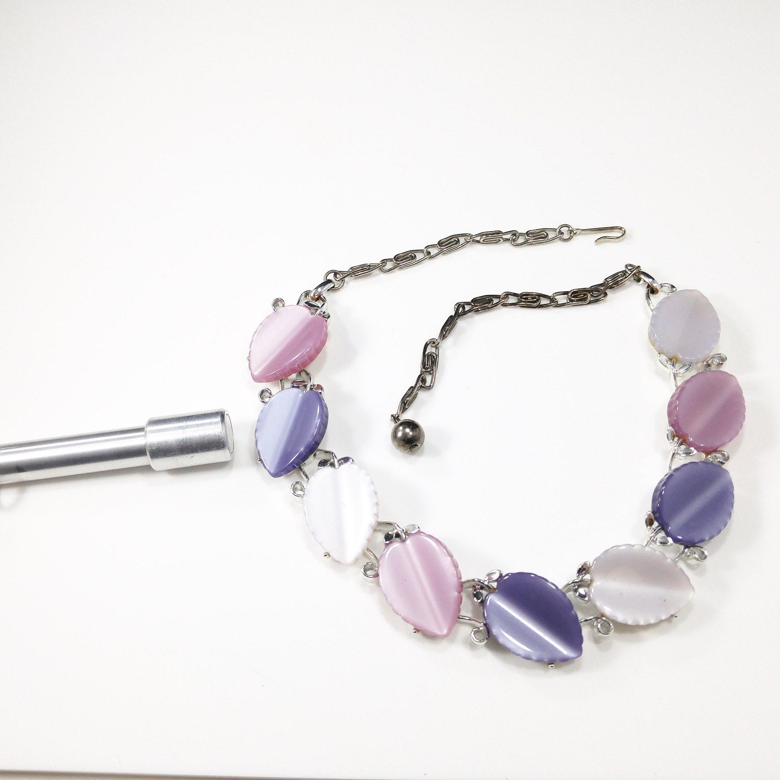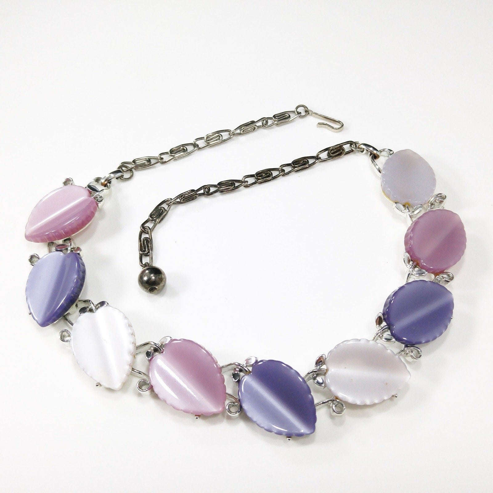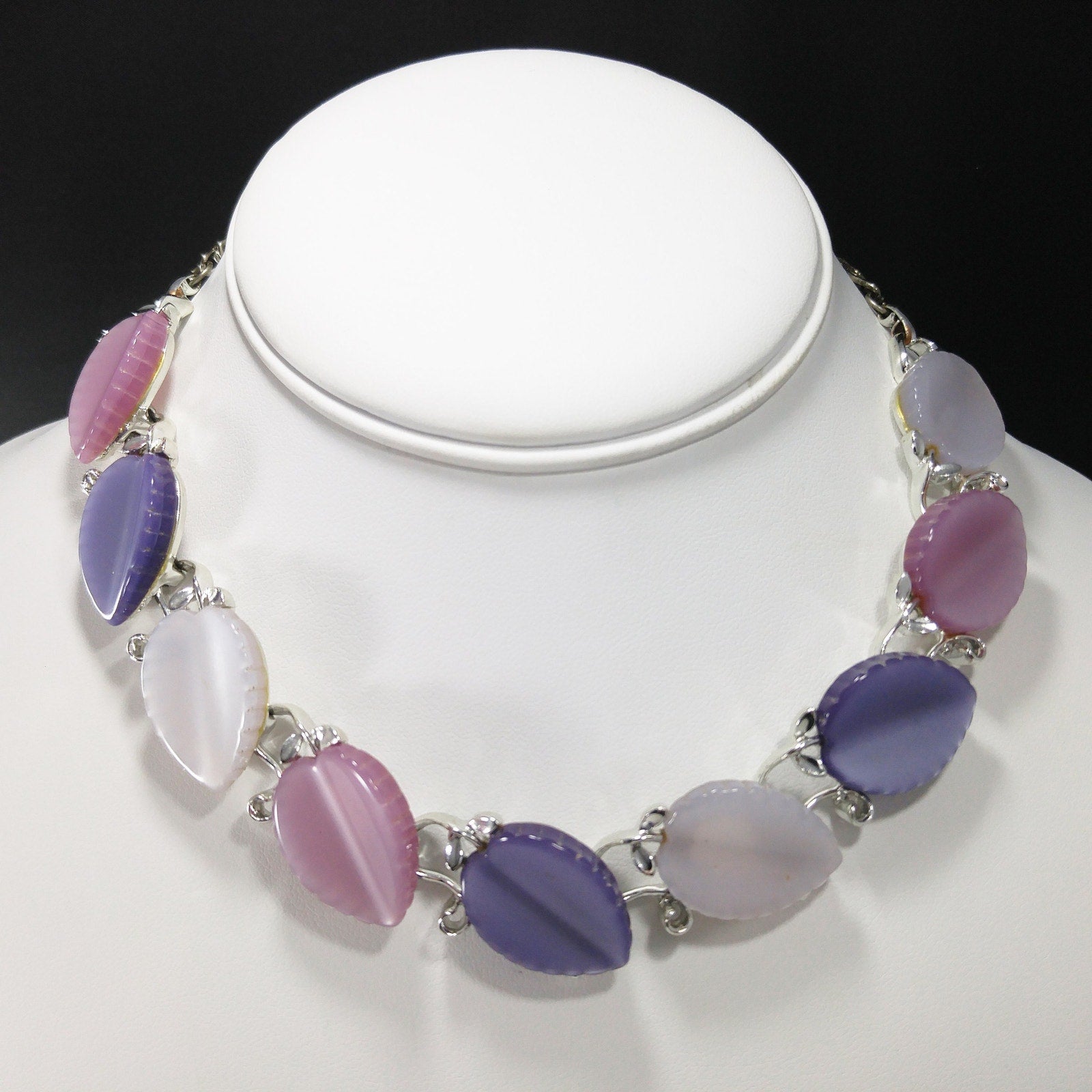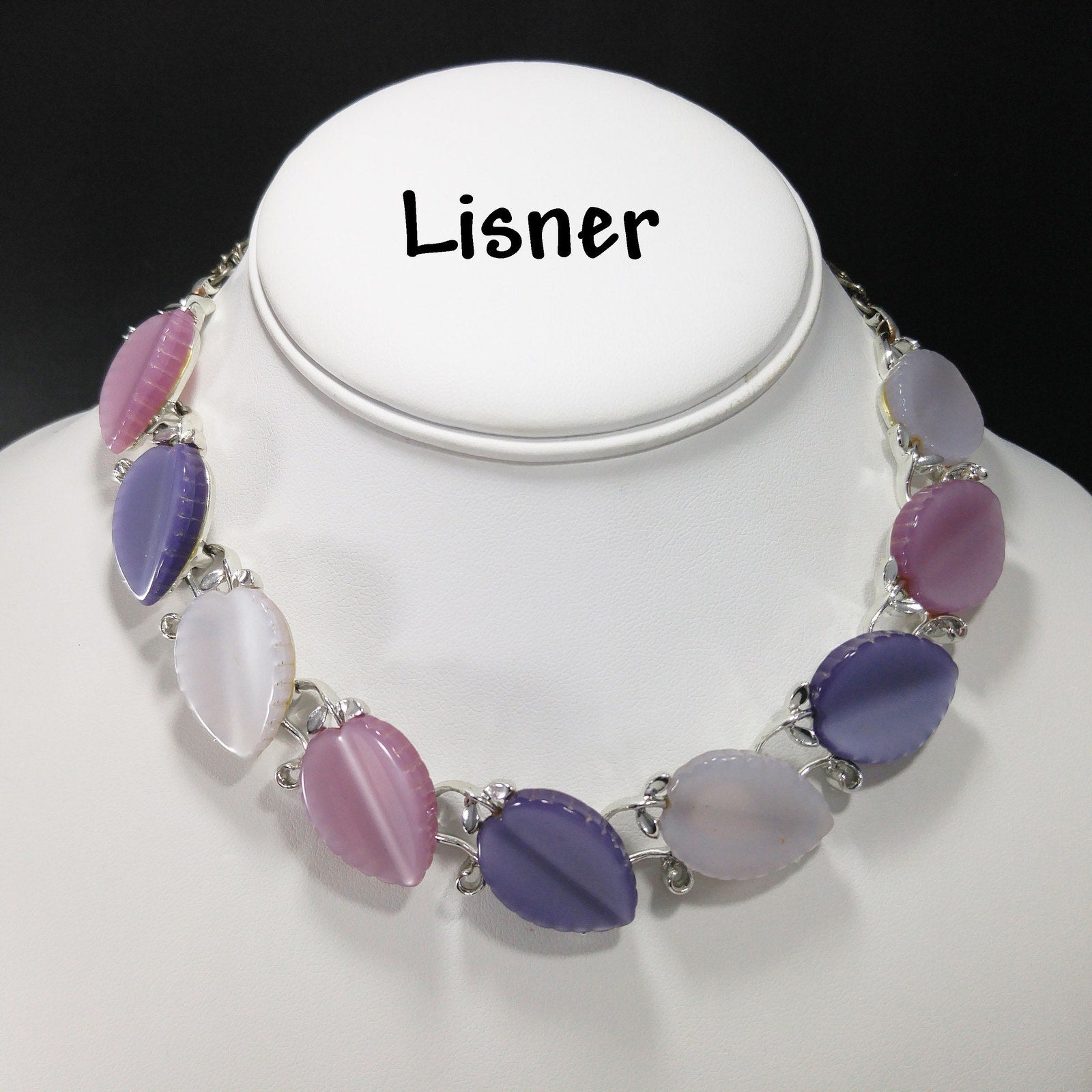 *Description: This is a beautiful Lisner necklace with Lucite leaves in lavender, pink, and white. The Lucite leaves are sitting on a rhodium plated base link. The silver tone necklace has three leaves of each color. The hook on the chain is signed Lisner. The color combination of pink, lavender, and white are beautiful and would make a great vintage gift or a wonderful addition to your vintage necklace collection.