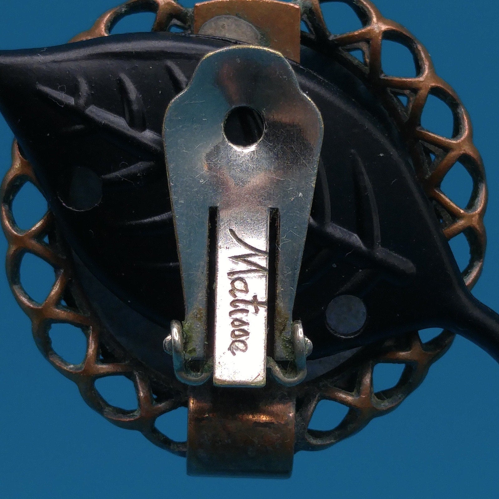 Each earring features a detailed openwork copper frame with colorful enamel centers. The Matisse script hallmark (used between 1952–1964) confirms their authenticity. Renoir, founded in 1946 by Jerry Fels, produced copper jewelry until about 1964, with Matisse reserved exclusively for their enameled pieces.