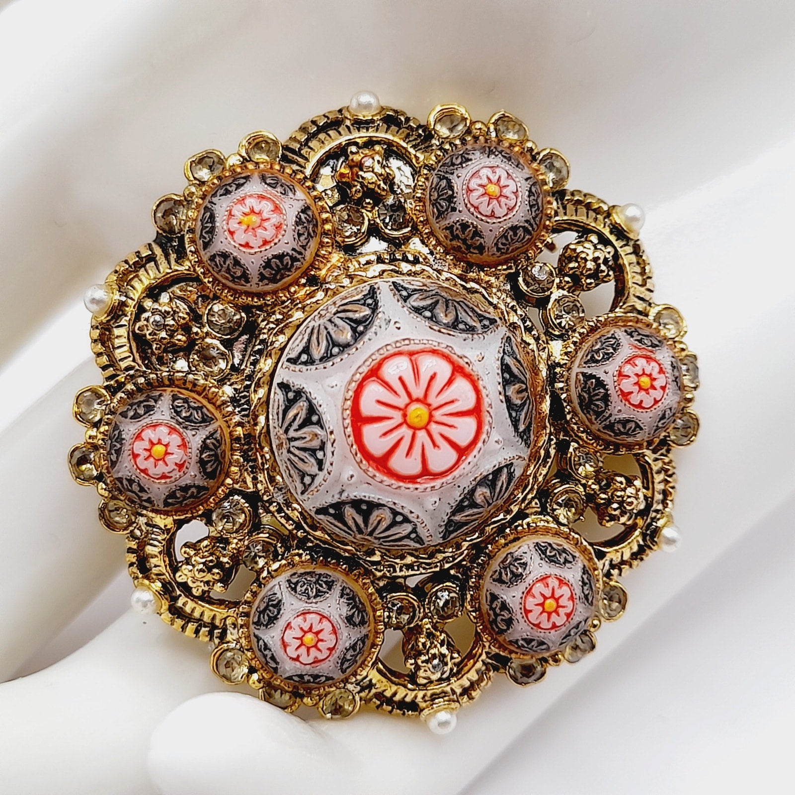This is a stunning vintage micro mosaic-style brooch featuring colorful glass floral designs set in ornate gold-tone filigree. The brooch showcases a large central floral medallion surrounded by smaller matching accents, all intricately framed with scrollwork and open filigree detailing.