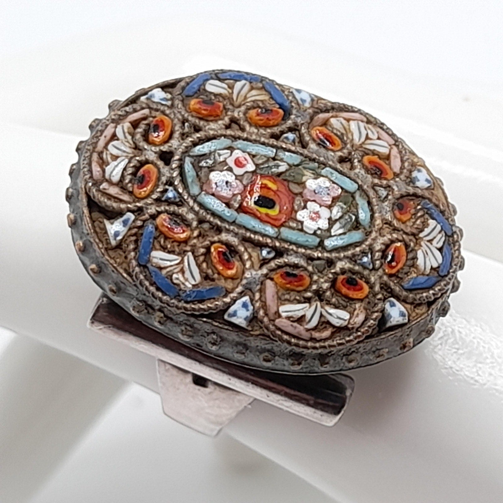 *Description: This is a very unique vintage ring which sometimes is referred to as a poison ring because of the hidden compartment under the top. There is a hinge on the side and the Micro Mosaic top lifts up on one side to reveal an inner compartment. The inside of the band is stamped Mexico and additional words which I can not read but include MPC. The ring is adjustable and for this fitting measured US size 7. The Micro Mosaic is in very good condition and the design is made using tiny pieces of glass. This would be a great addition to your vintage jewelry collection or make a great vintage gift!