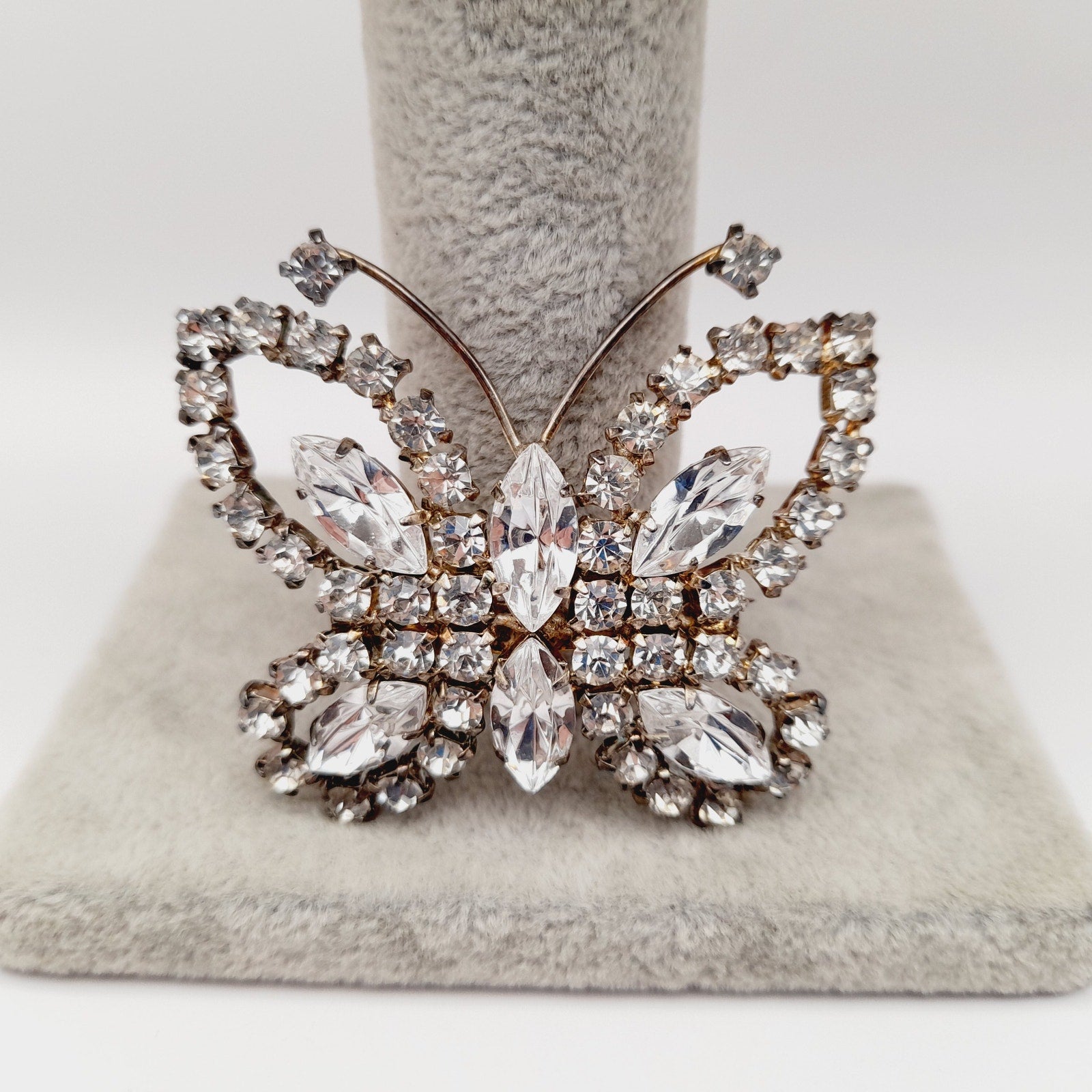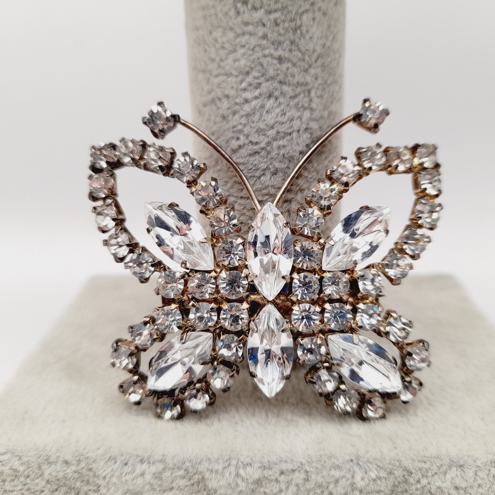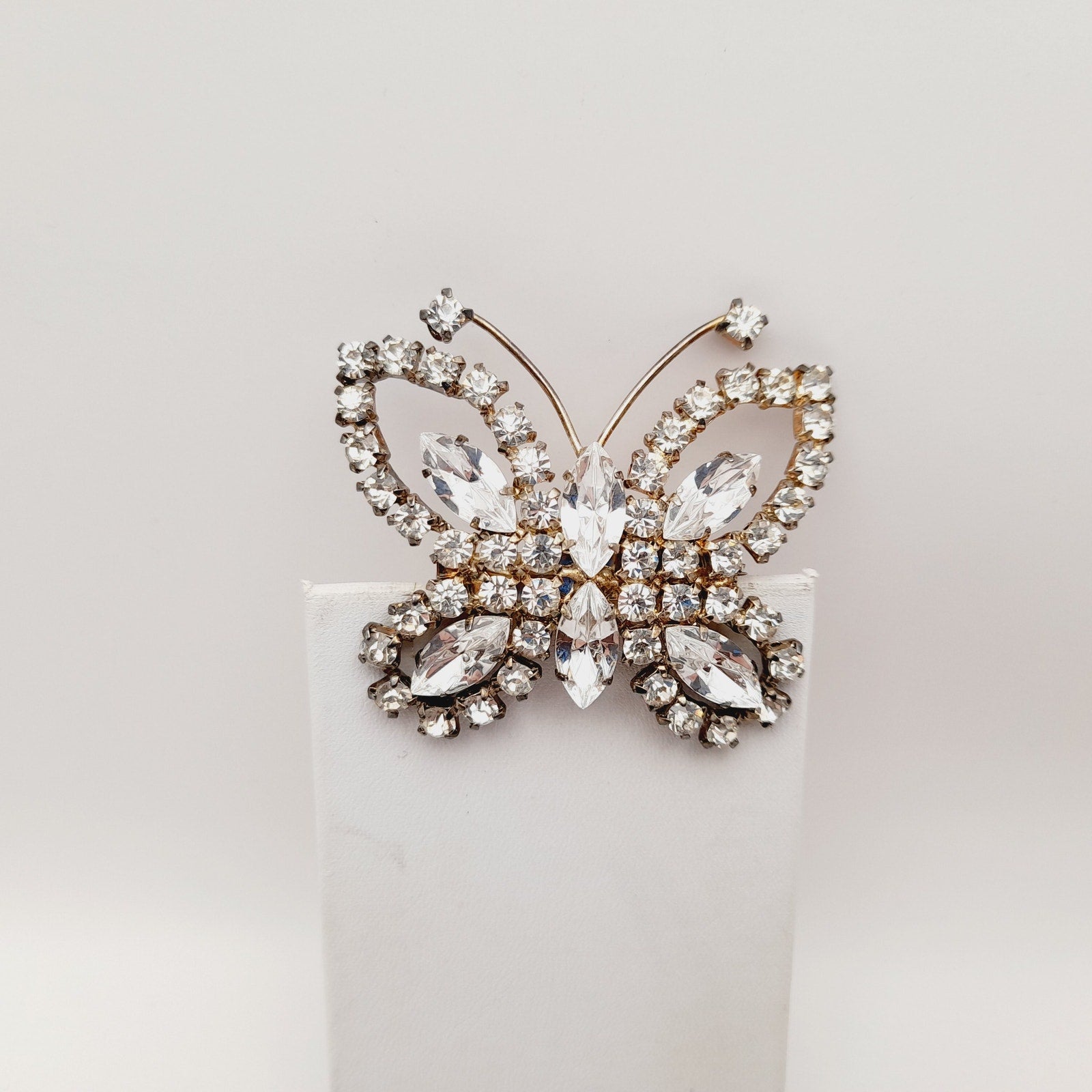 Add timeless sparkle to your collection with this vintage mid-century clear rhinestone butterfly brooch. Crafted with elegant detail, this shimmering butterfly features brilliant clear rhinestones set in silver tone metal, capturing the light beautifully with every movement. A classic symbol of transformation and grace, this brooch makes a wonderful statement on a lapel, dress, scarf, or handbag. Perfect for collectors of vintage jewelry, mid-century costume pieces, or anyone who loves butterflies, this brooch is both wearable art and a touch of nostalgia. A charming gift for birthdays, anniversaries, or special occasions.