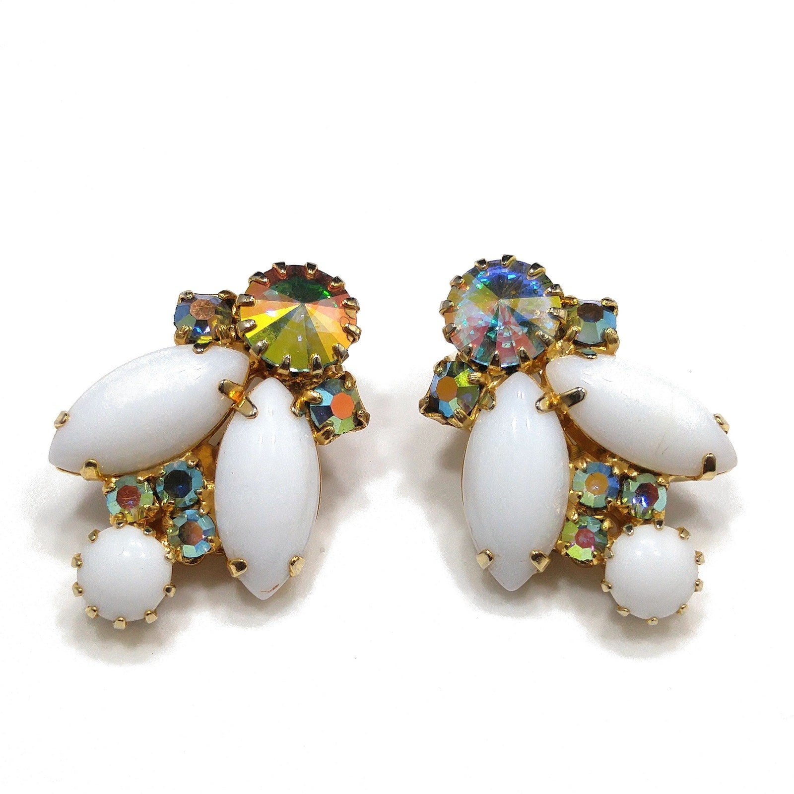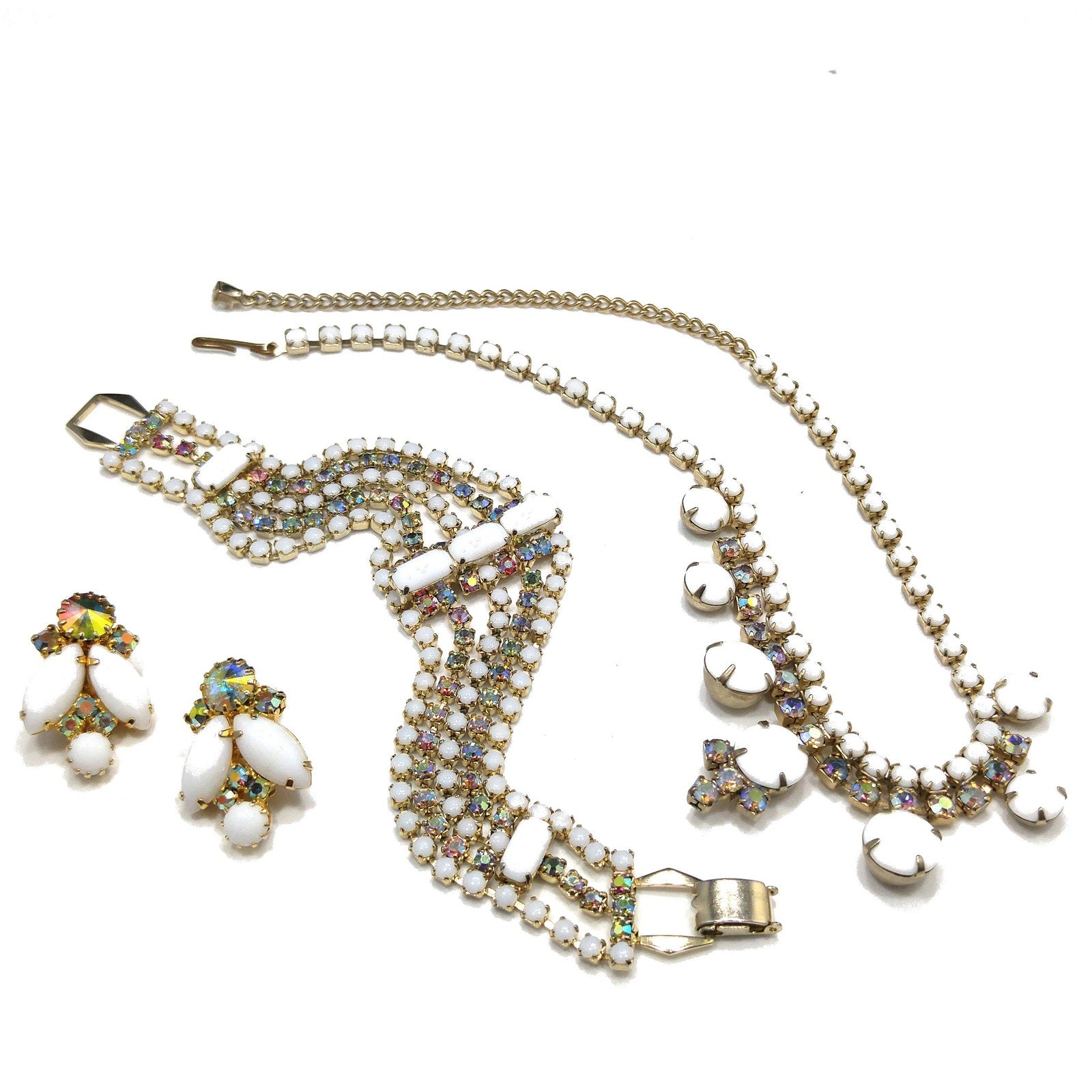 *Description: This is a beautiful white milk glass jewelry set featuring aurora borealis rhinestones on all pieces, which include a necklace, wide bracelet, and clip on earrings. The aurora borealis stones are full of color and show lots of blues and pinks. The earrings feature rivoli AB rhinestones with the white milk glass stones and show very little wear. The necklace and bracelet were well loved and do show wear on the back. Each stone is prong set and all in place. This would be a great addition to your vintage jewelry collection or make a great vintage gift!
