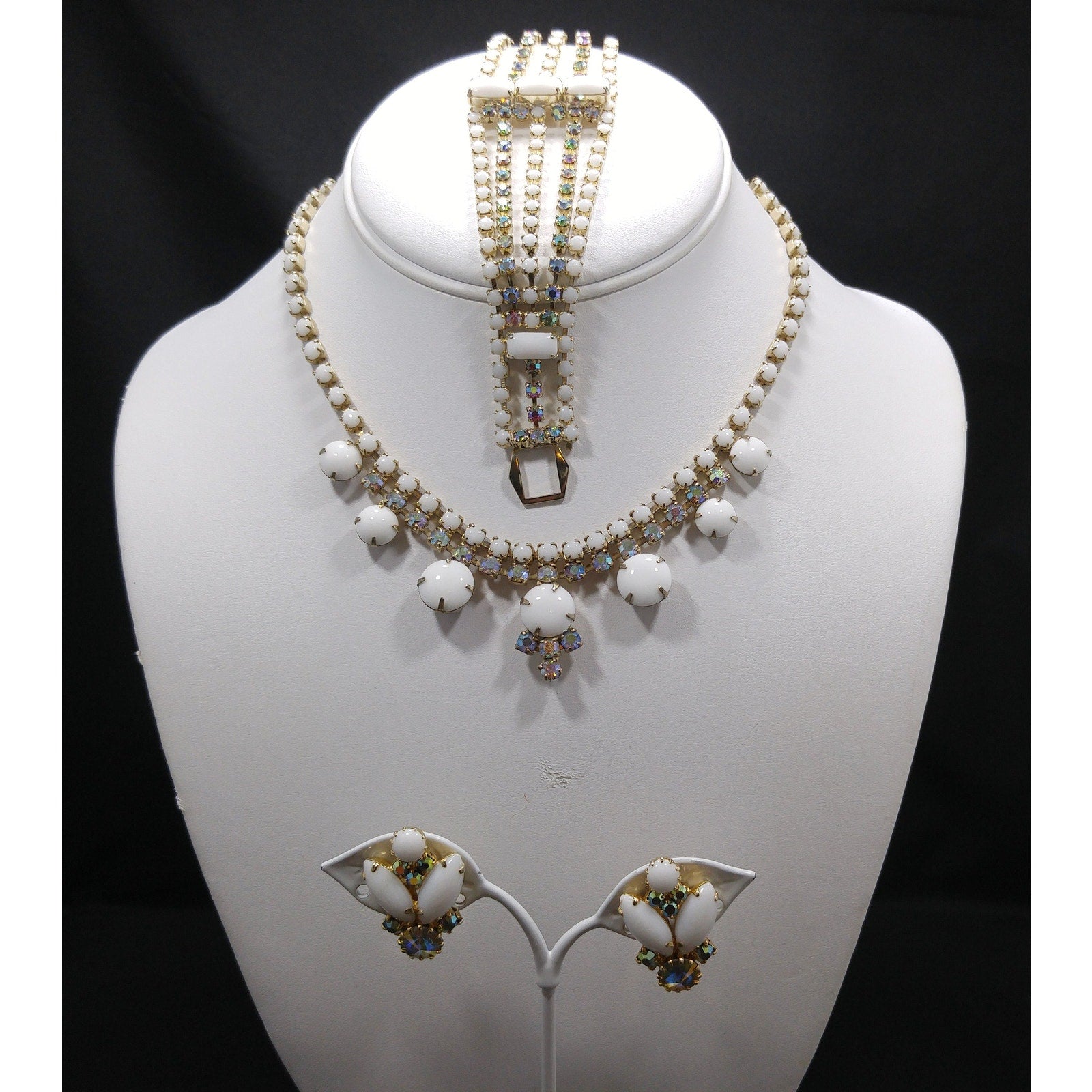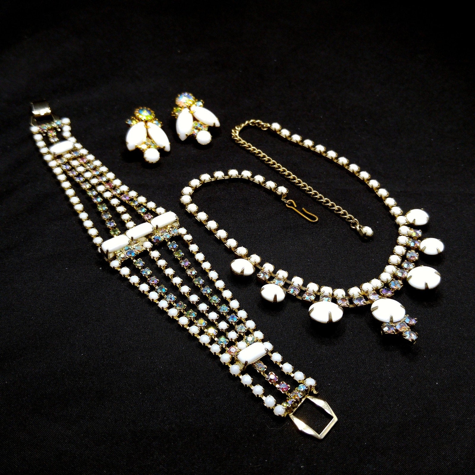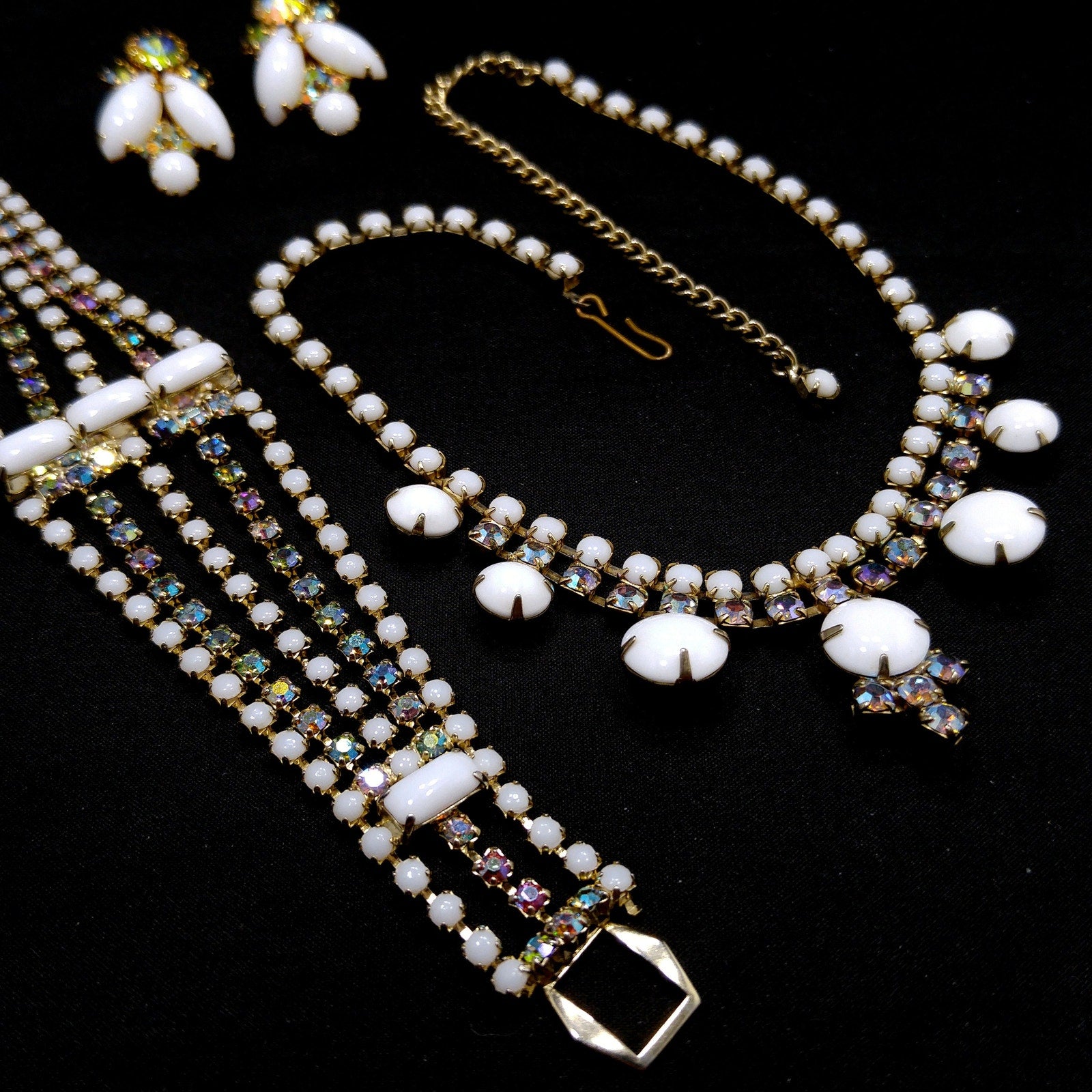 Vintage Milk Glass Jewelry Set, Necklace Bracelet Clip Earrings, Aurora Borealis, 1960s Vintage Jewelry
