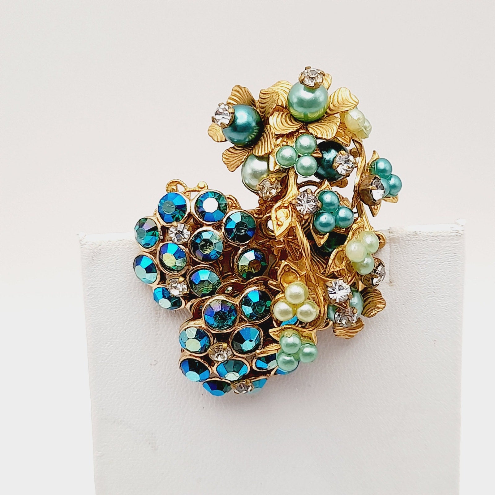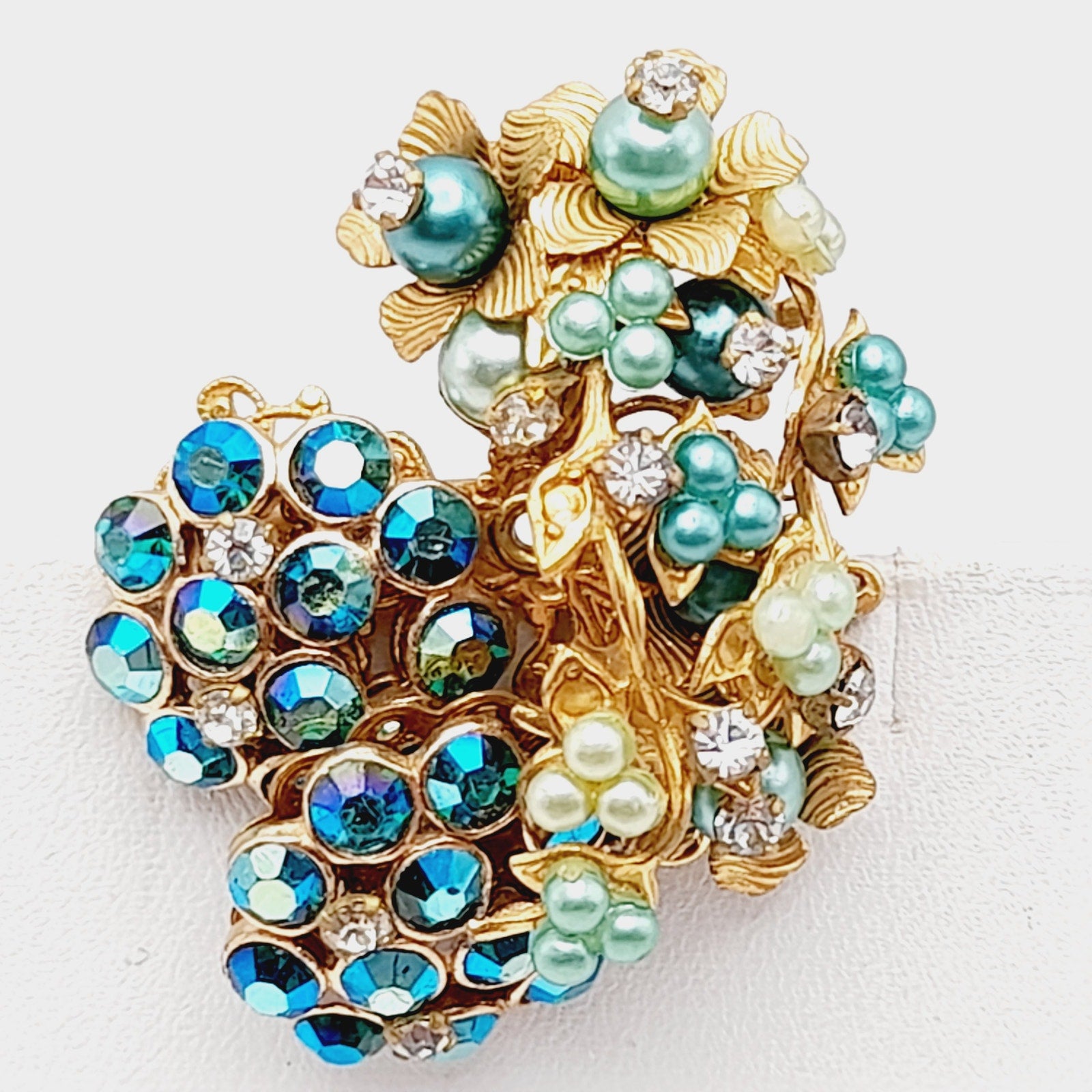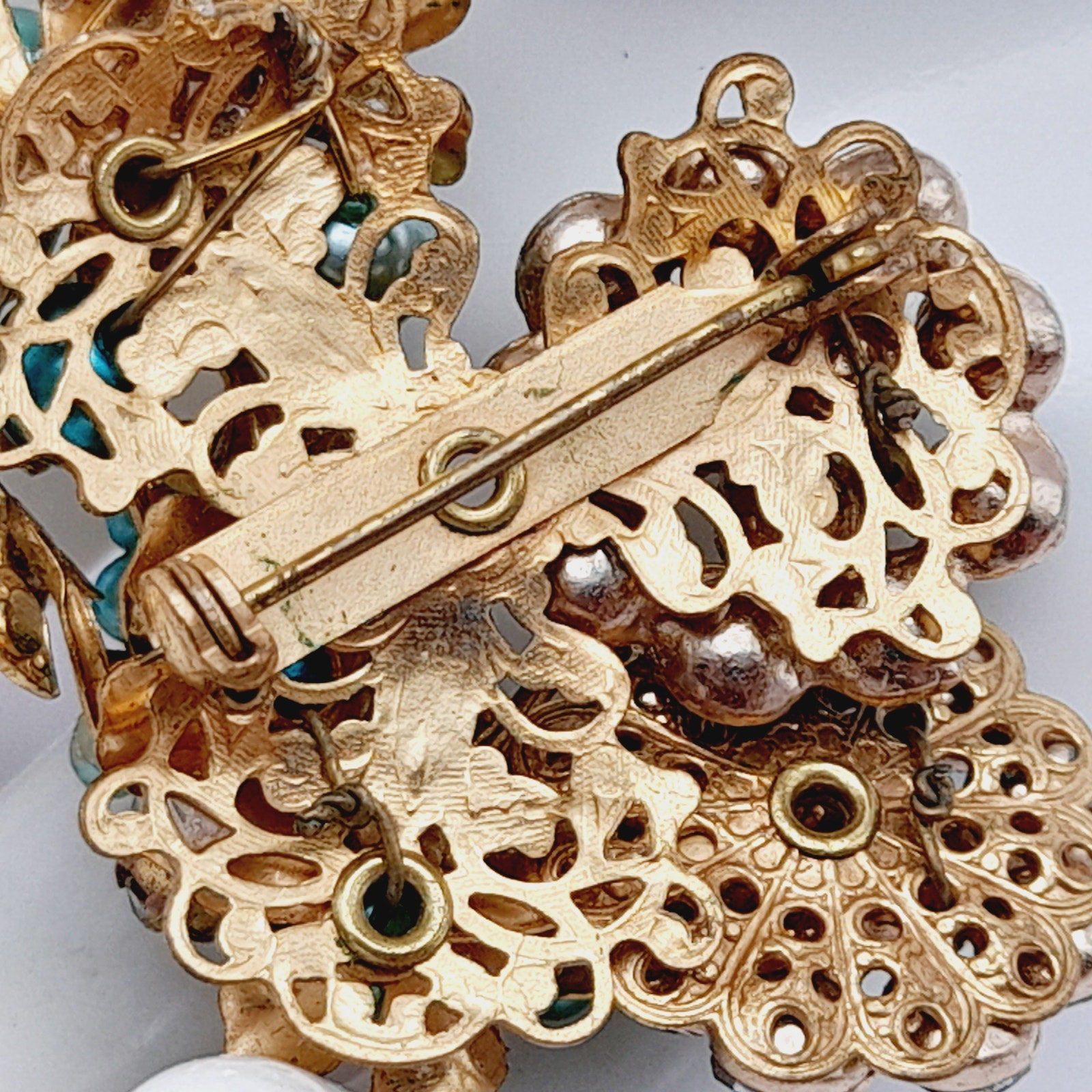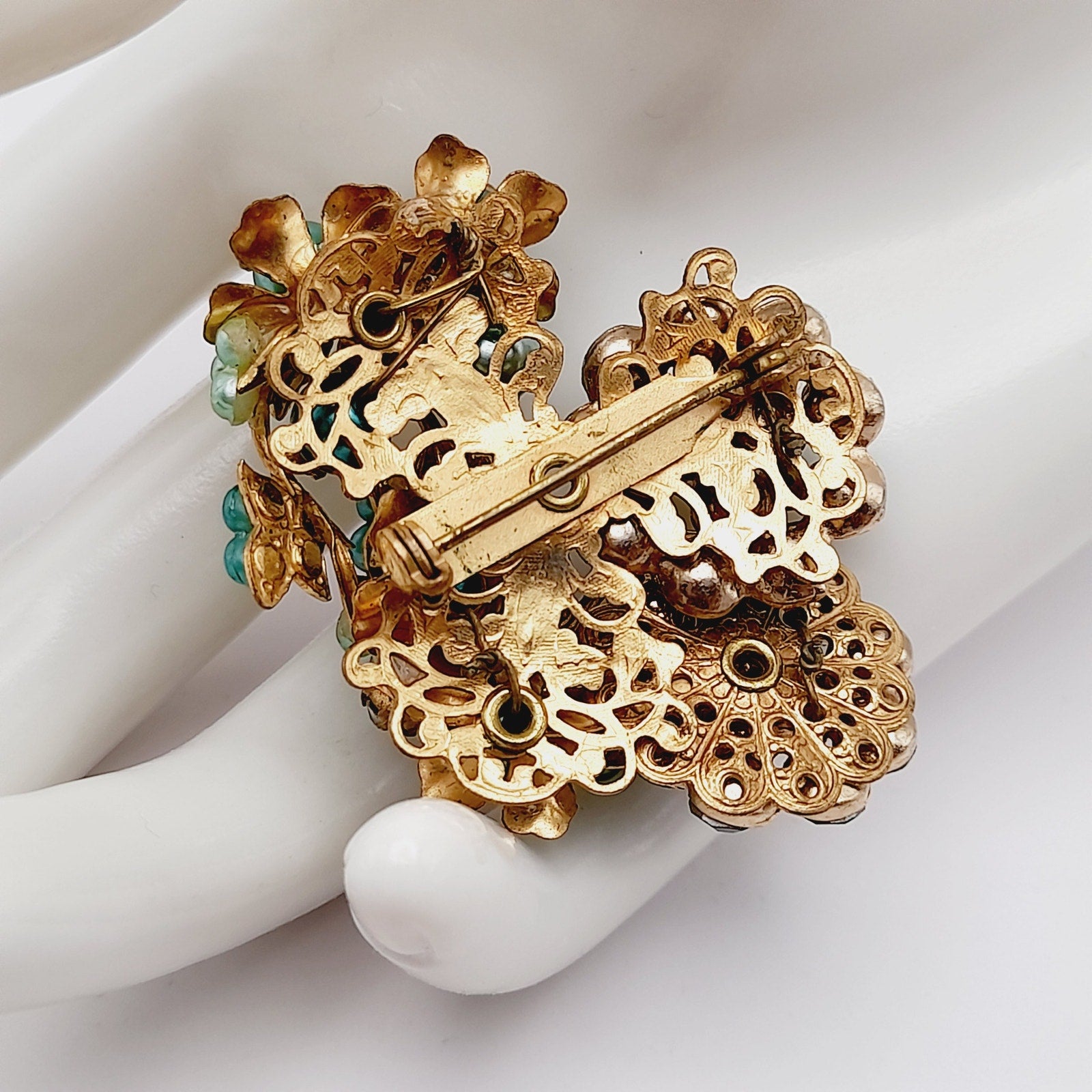 Add a touch of vintage charm to your collection with this stunning Miriam Haskell style brooch! This beautiful piece evokes the elegance of the 1940s and 1950s, featuring intricate floral designs and dazzling rhinestones. Perfect for adding a touch of sparkle to any outfit or as a cherished addition to your vintage jewelry collection.