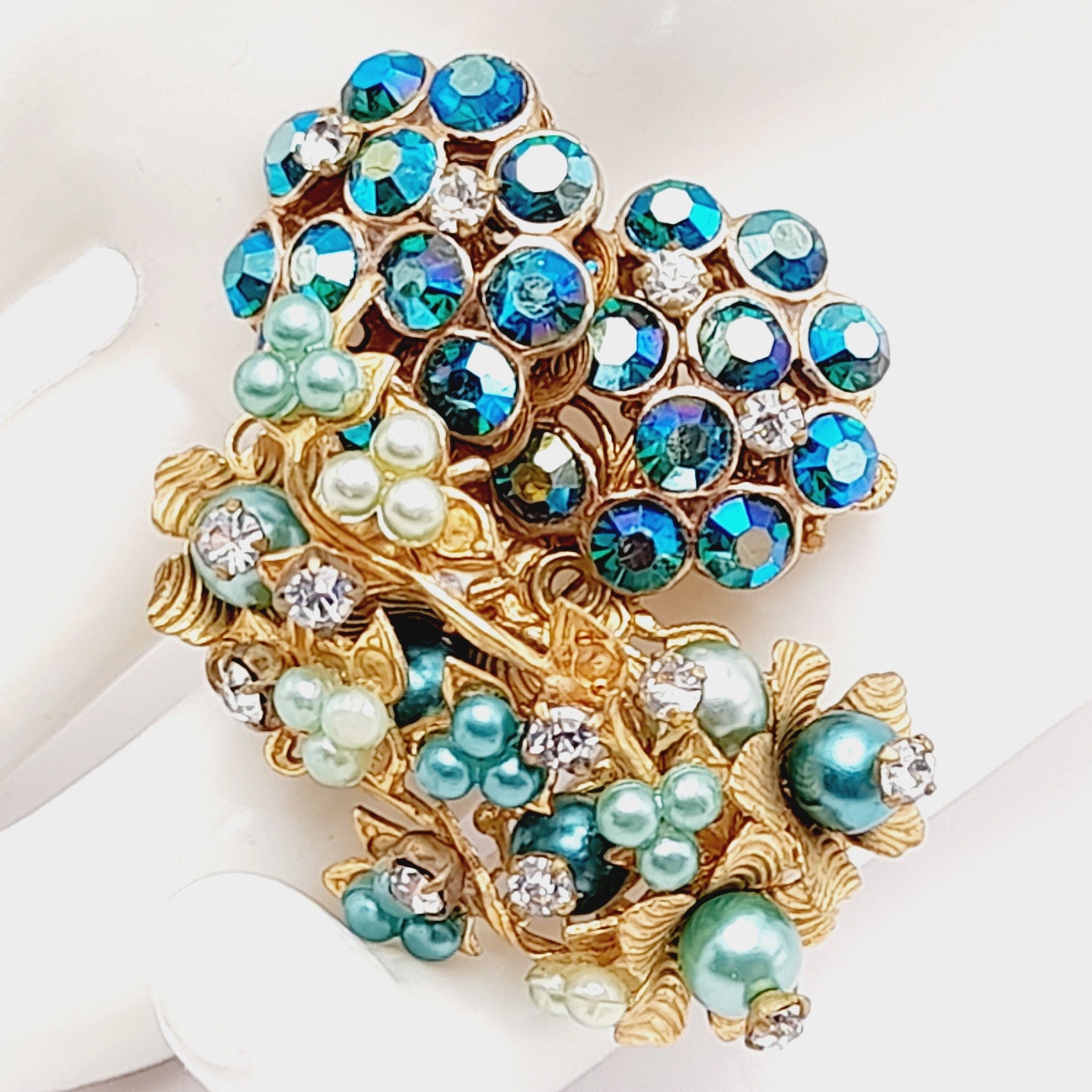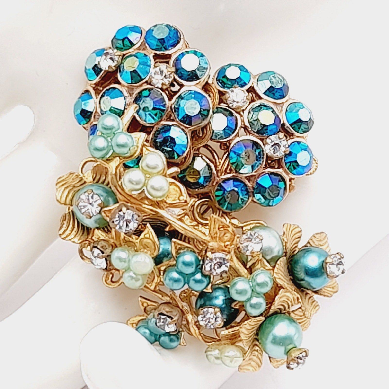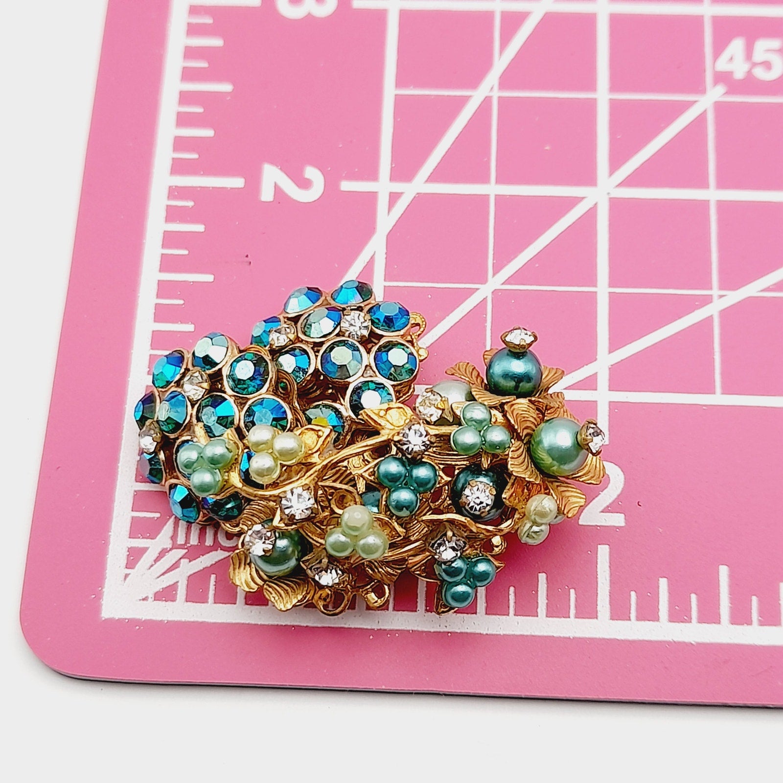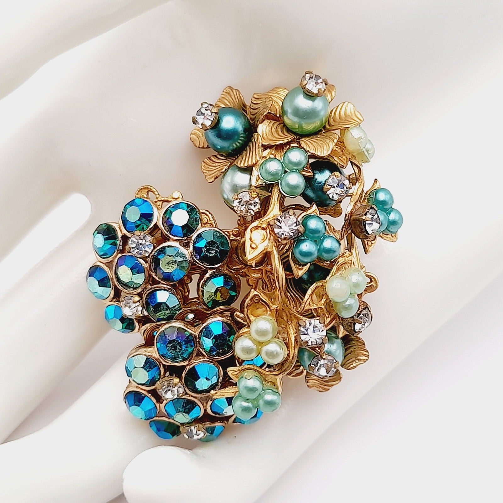 Add a touch of vintage charm to your collection with this stunning Miriam Haskell style brooch! This beautiful piece evokes the elegance of the 1940s and 1950s, featuring intricate floral designs and dazzling rhinestones. Perfect for adding a touch of sparkle to any outfit or as a cherished addition to your vintage jewelry collection.