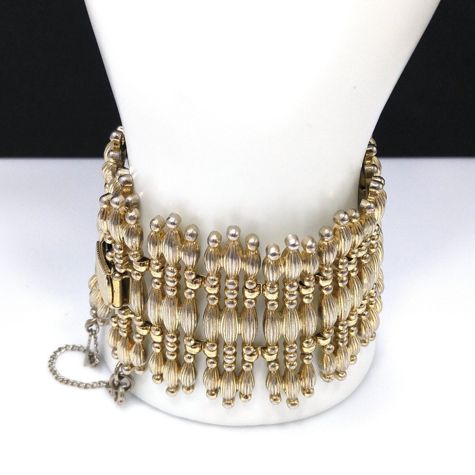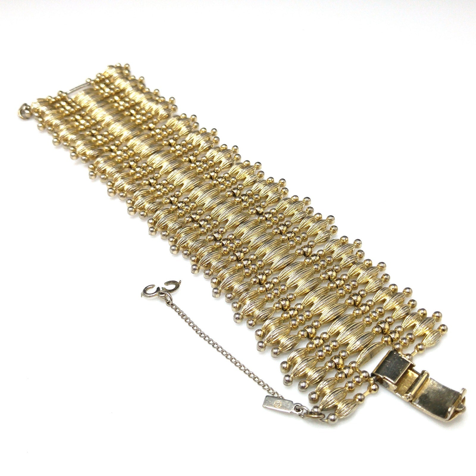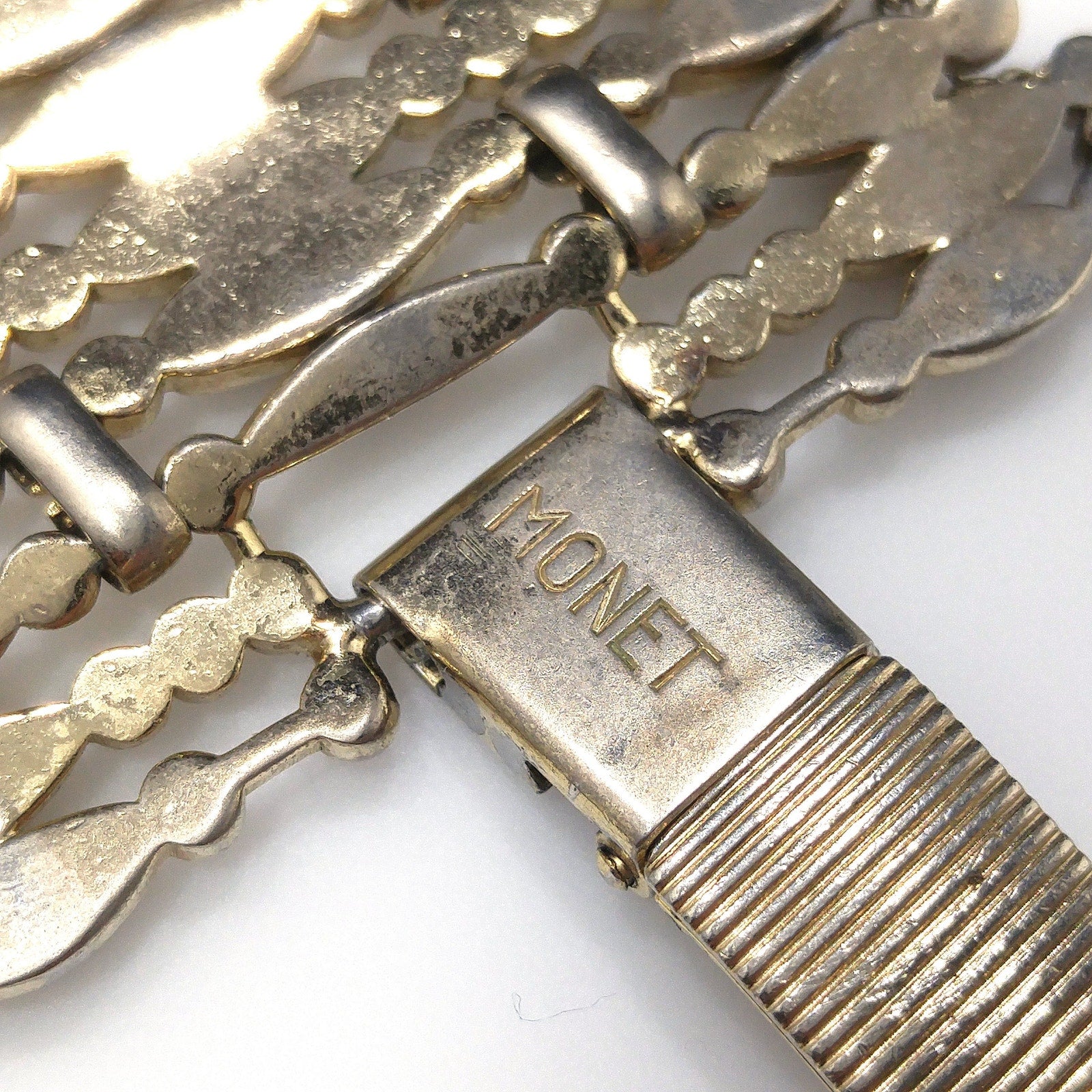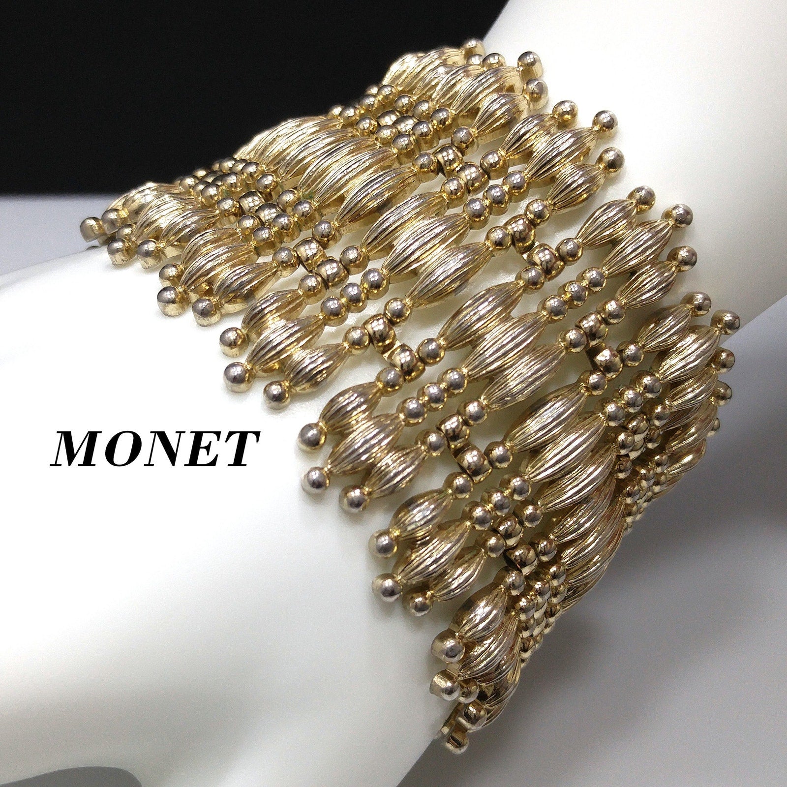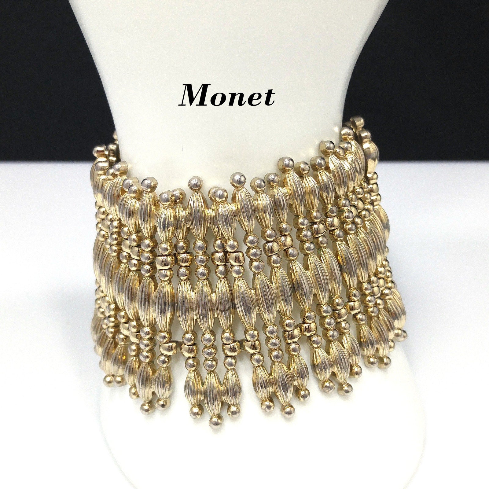 *Description: This is a beautiful MONET 1950s "Minaret" bracelet in gold tone which is feature in Monet The Master's Jewelers by Alice Vega on page 139. This runway piece is a classic and was described as a beautiful design which, although made out of metal, looks light and airy, like lace cast metal. The bracelet is signed on the back of the clasp in all caps and then also has a hangtag and safety chain with a sister clasp to keep your bracelet safely on your arm. This is a heavier bracelet at 4.5 ounces and tested at 10K gold plate surface metal. This bracelet is a great heirloom piece and would be a great addition to your vintage jewelry collection or make a great vintage gift!
