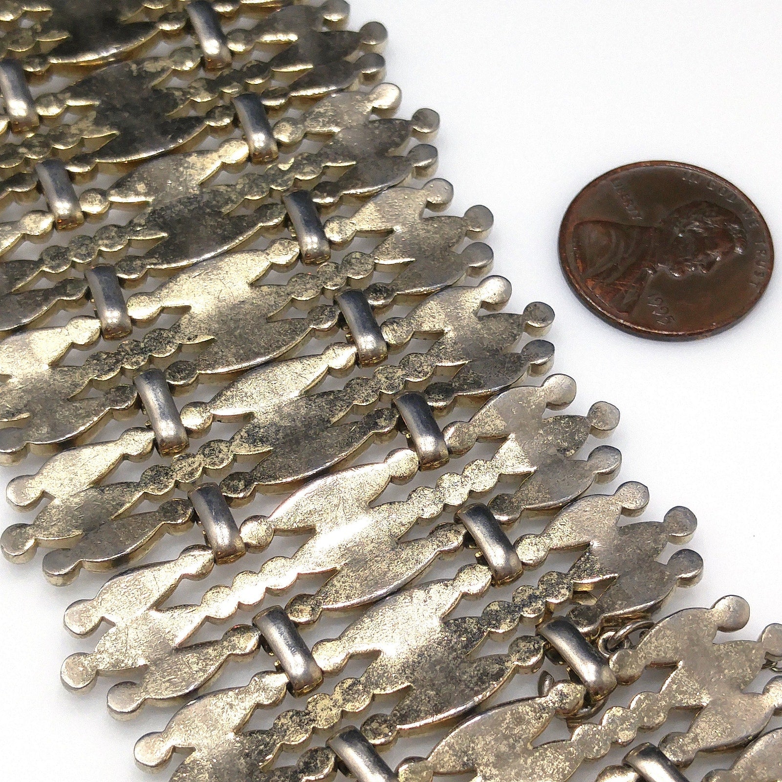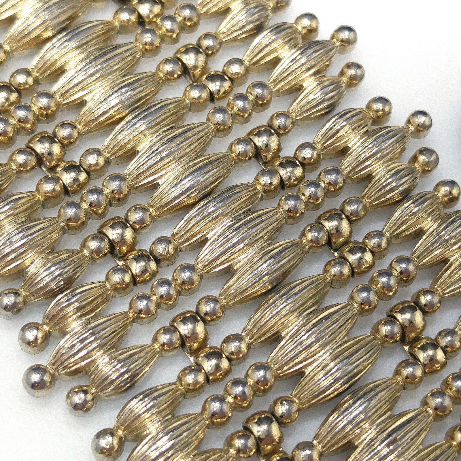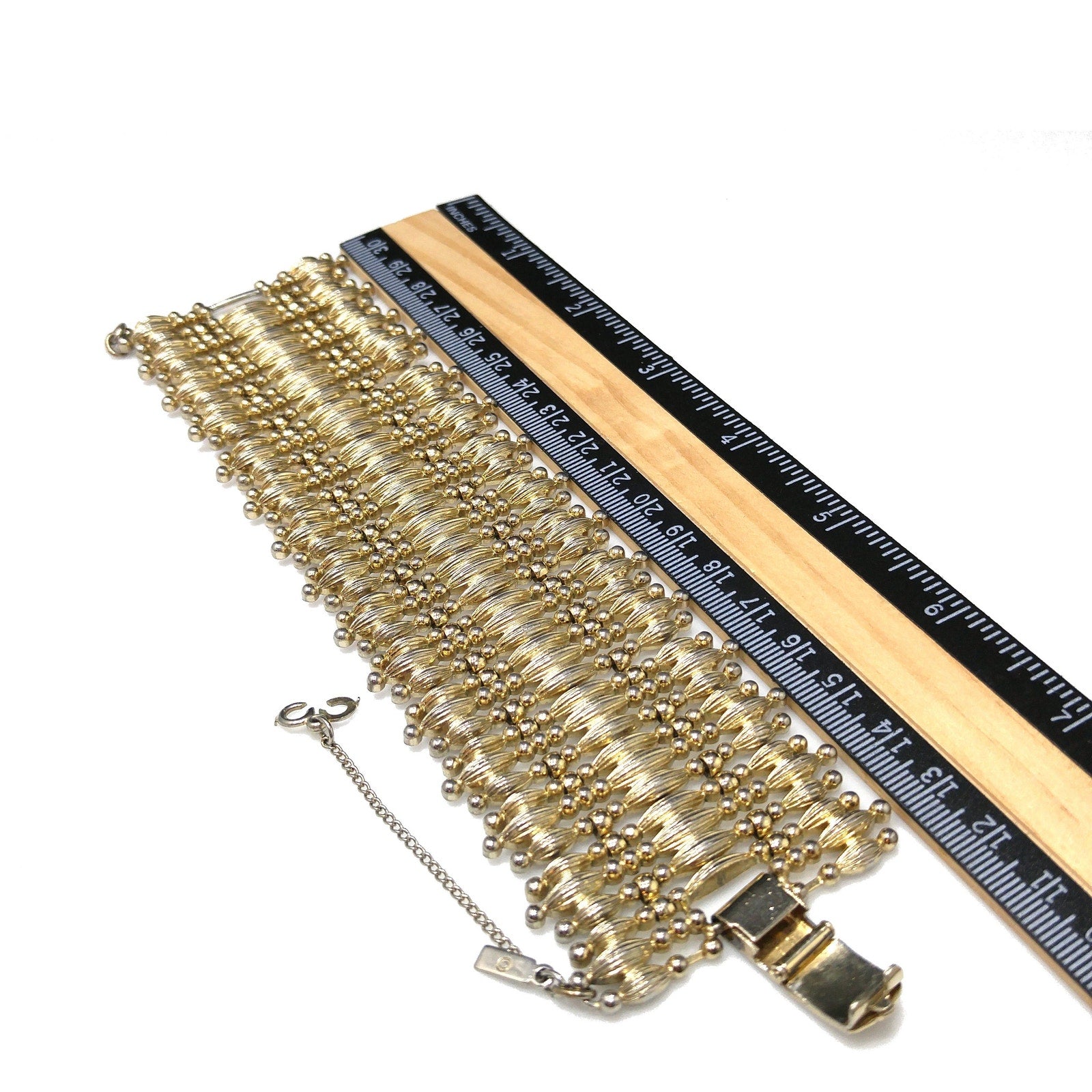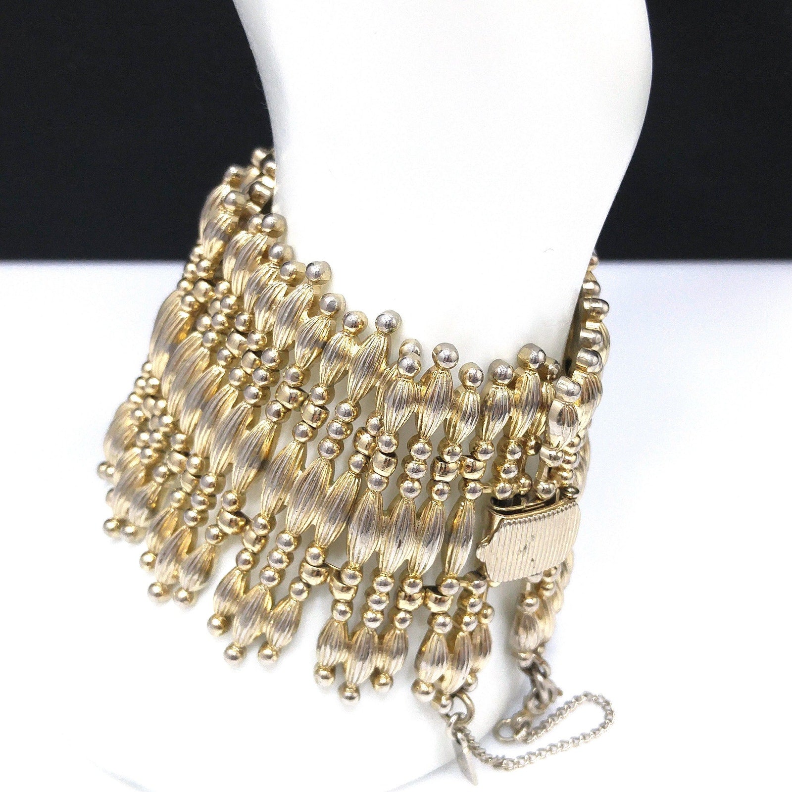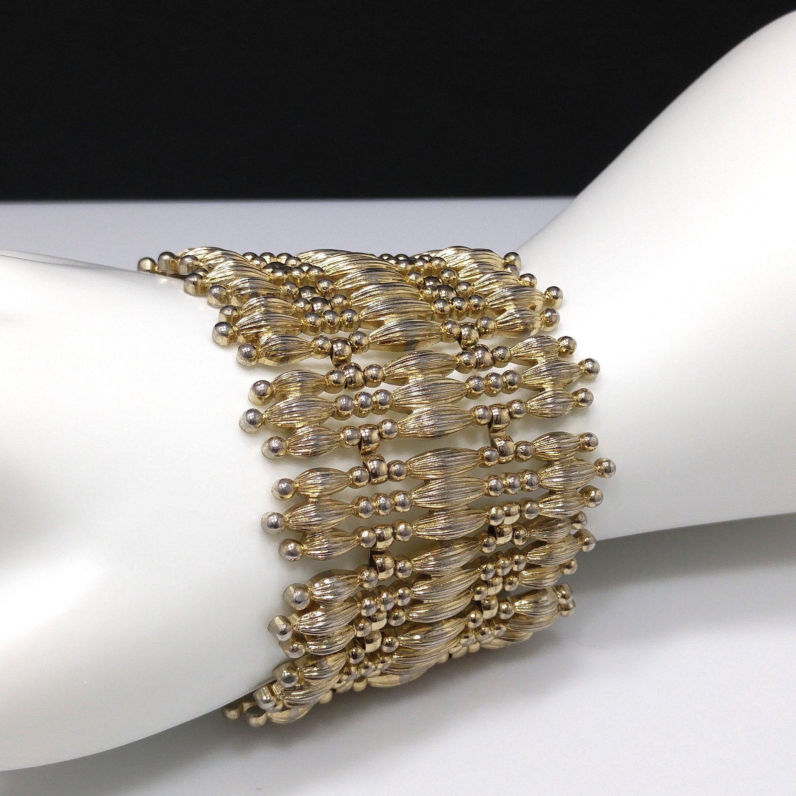 *Description: This is a beautiful MONET 1950s "Minaret" bracelet in gold tone which is feature in Monet The Master's Jewelers by Alice Vega on page 139. This runway piece is a classic and was described as a beautiful design which, although made out of metal, looks light and airy, like lace cast metal. The bracelet is signed on the back of the clasp in all caps and then also has a hangtag and safety chain with a sister clasp to keep your bracelet safely on your arm. This is a heavier bracelet at 4.5 ounces and tested at 10K gold plate surface metal. This bracelet is a great heirloom piece and would be a great addition to your vintage jewelry collection or make a great vintage gift!