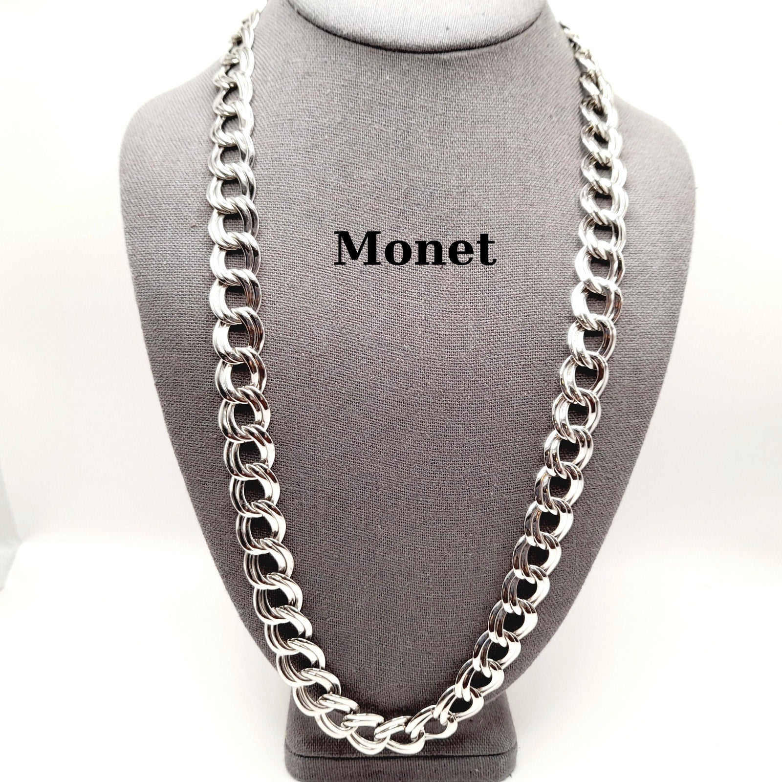 Crafted with durable rhodium plating, this necklace resists tarnishing and retains its bright silvery shine for decades. The secure fold-over clasp is signed “Monet,” a mark of quality and elegance. Ideal for vintage fashion lovers, collectors, or anyone seeking a bold retro accessory with modern flair.