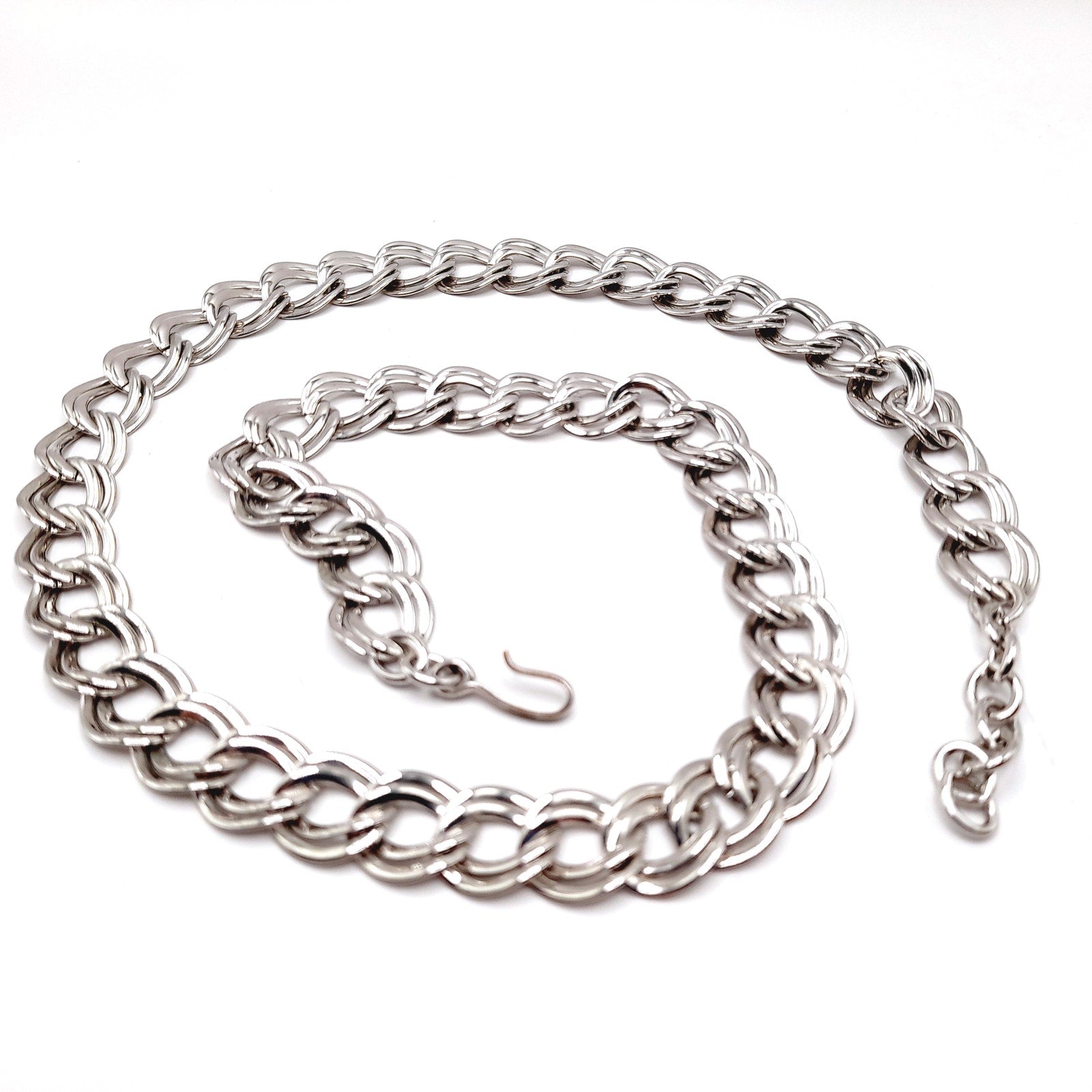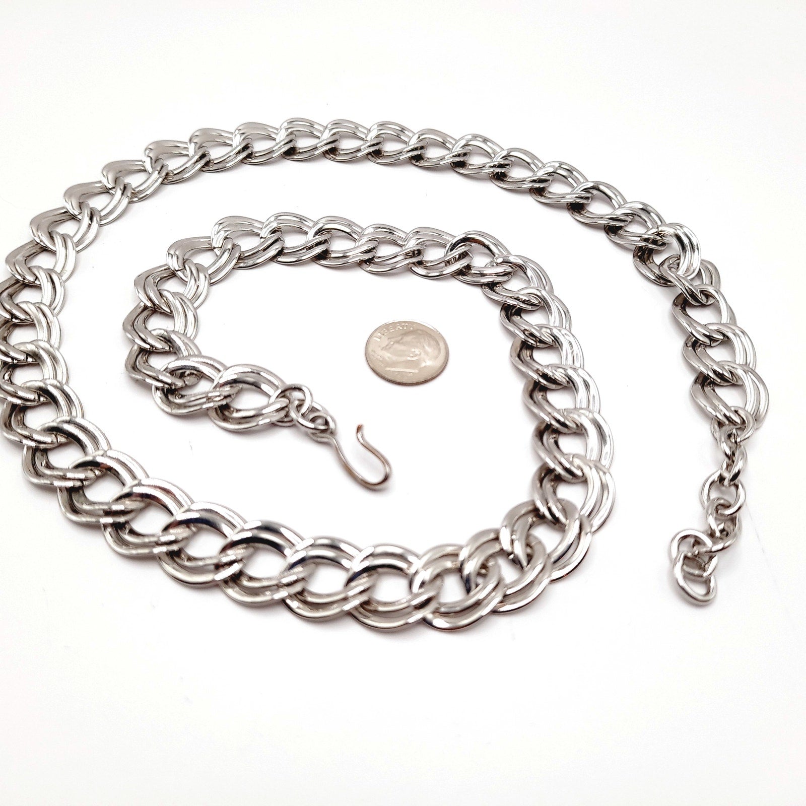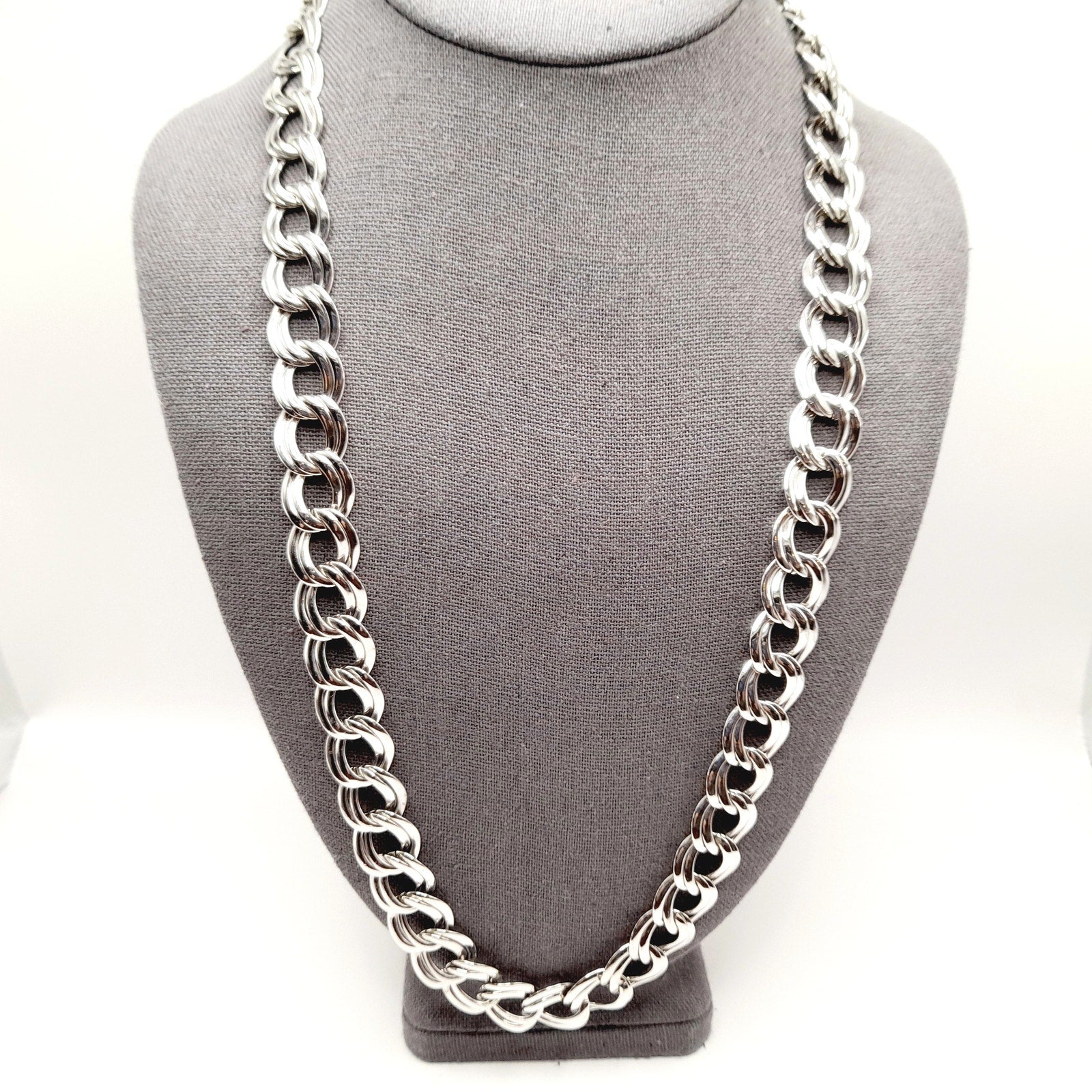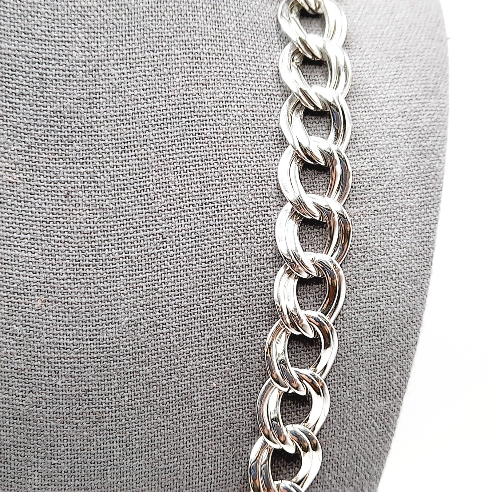 Step into timeless sophistication with this bold vintage Monet necklace featuring a gleaming rhodium-plated chunky chain design. Measuring 26 inches long and 5/8 inches wide, this statement piece exudes high-end 1980s glamor with a polished, mirror-like finish and substantial weight. The heavy curb chain links and signature Monet craftsmanship make this necklace a versatile standout—perfect for layering or wearing solo.