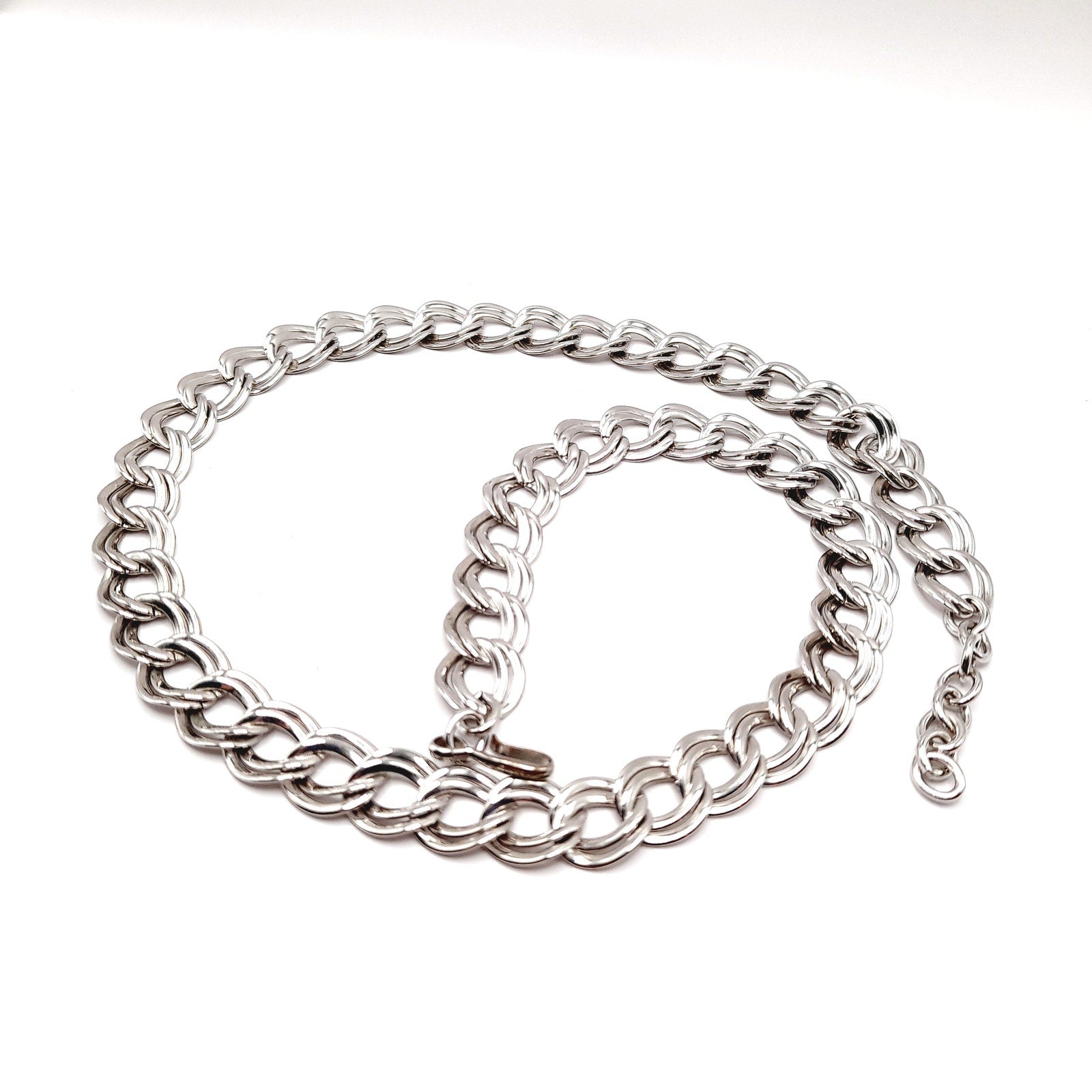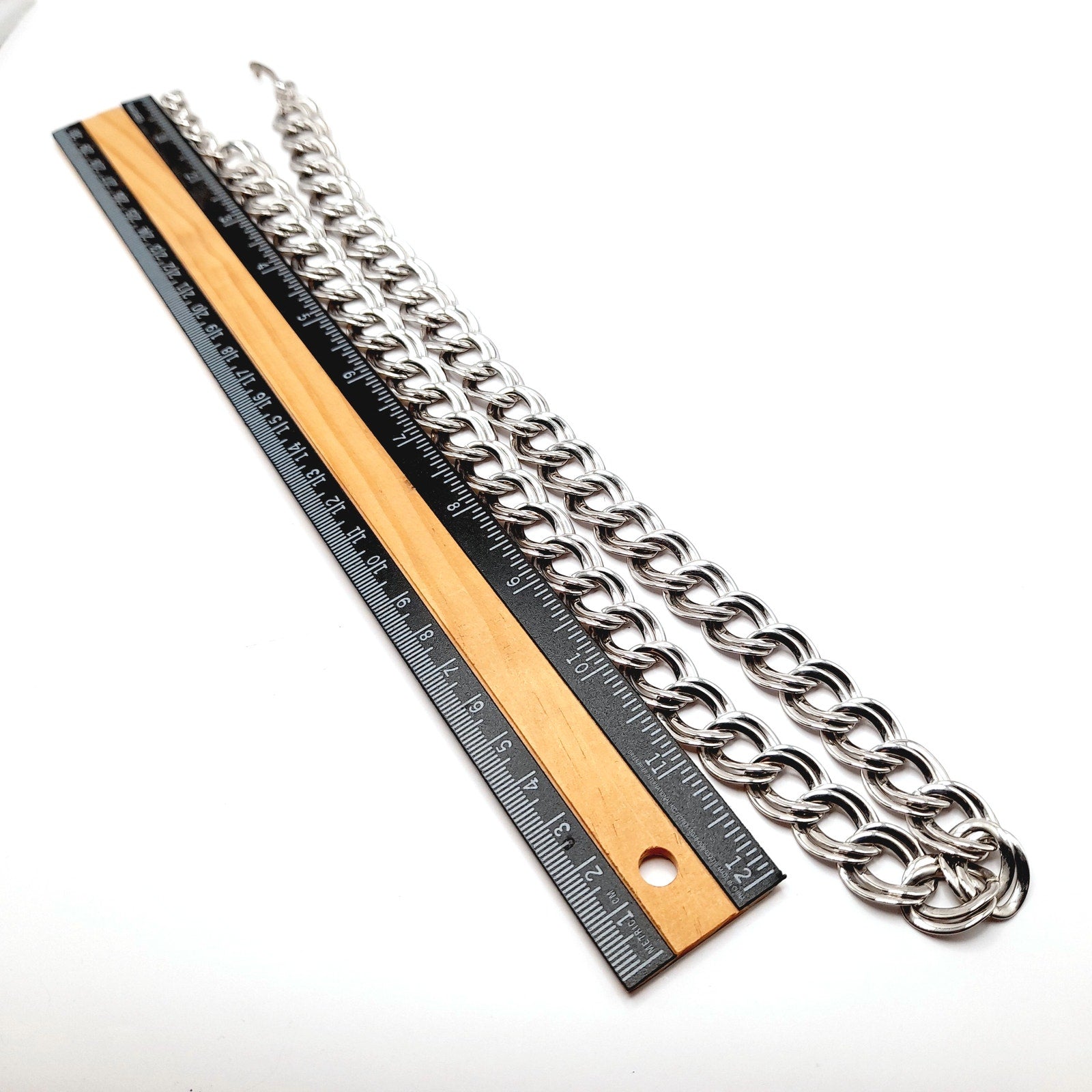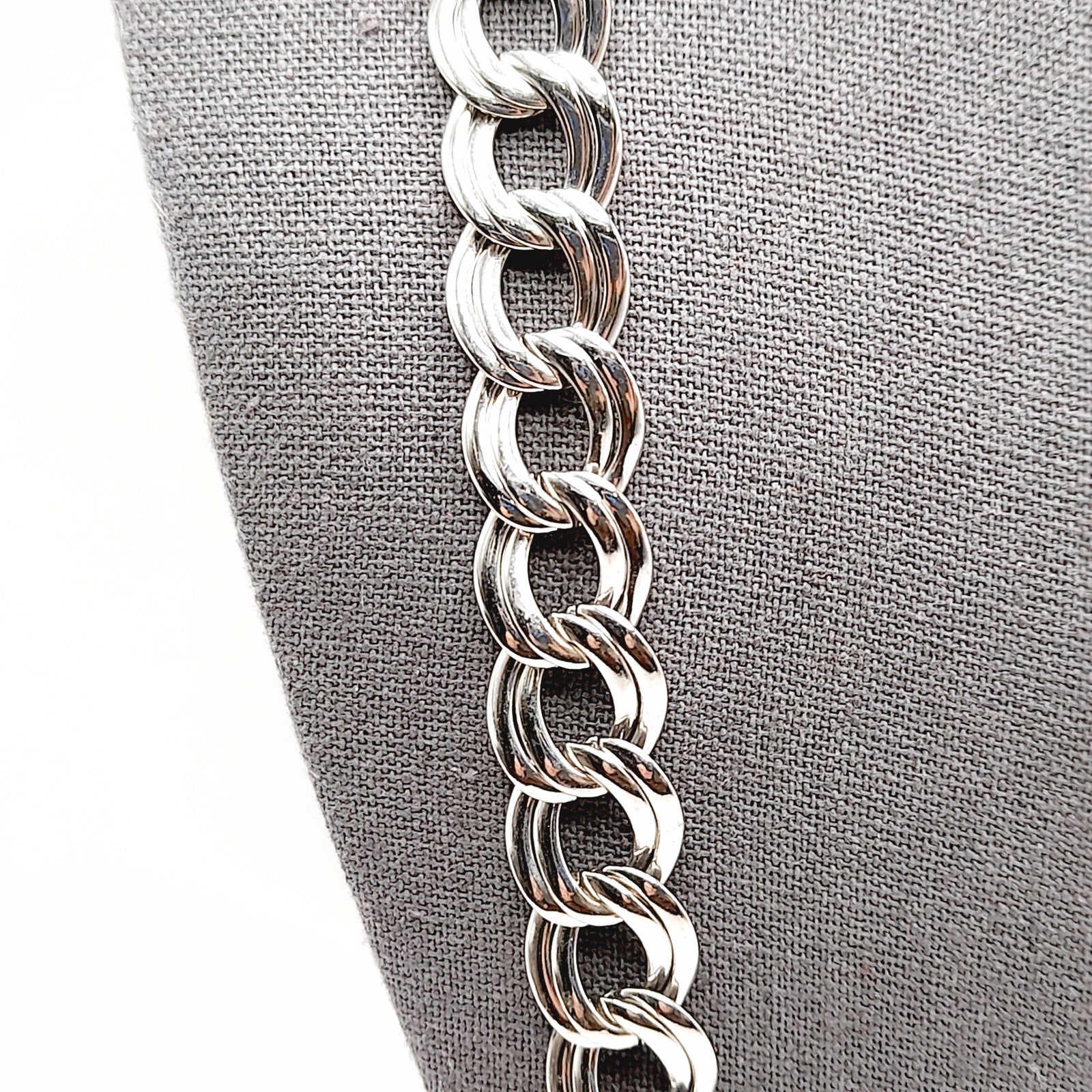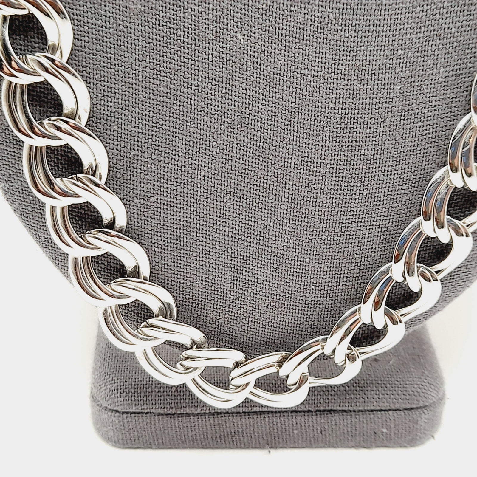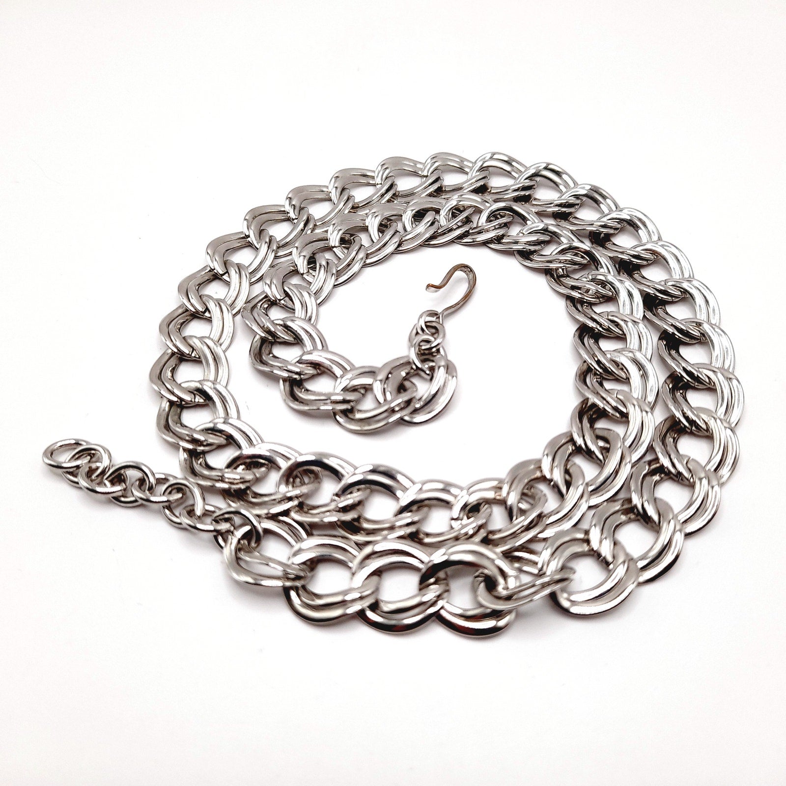Step into timeless sophistication with this bold vintage Monet necklace featuring a gleaming rhodium-plated chunky chain design. Measuring 26 inches long and 5/8 inches wide, this statement piece exudes high-end 1980s glamor with a polished, mirror-like finish and substantial weight. The heavy curb chain links and signature Monet craftsmanship make this necklace a versatile standout—perfect for layering or wearing solo.