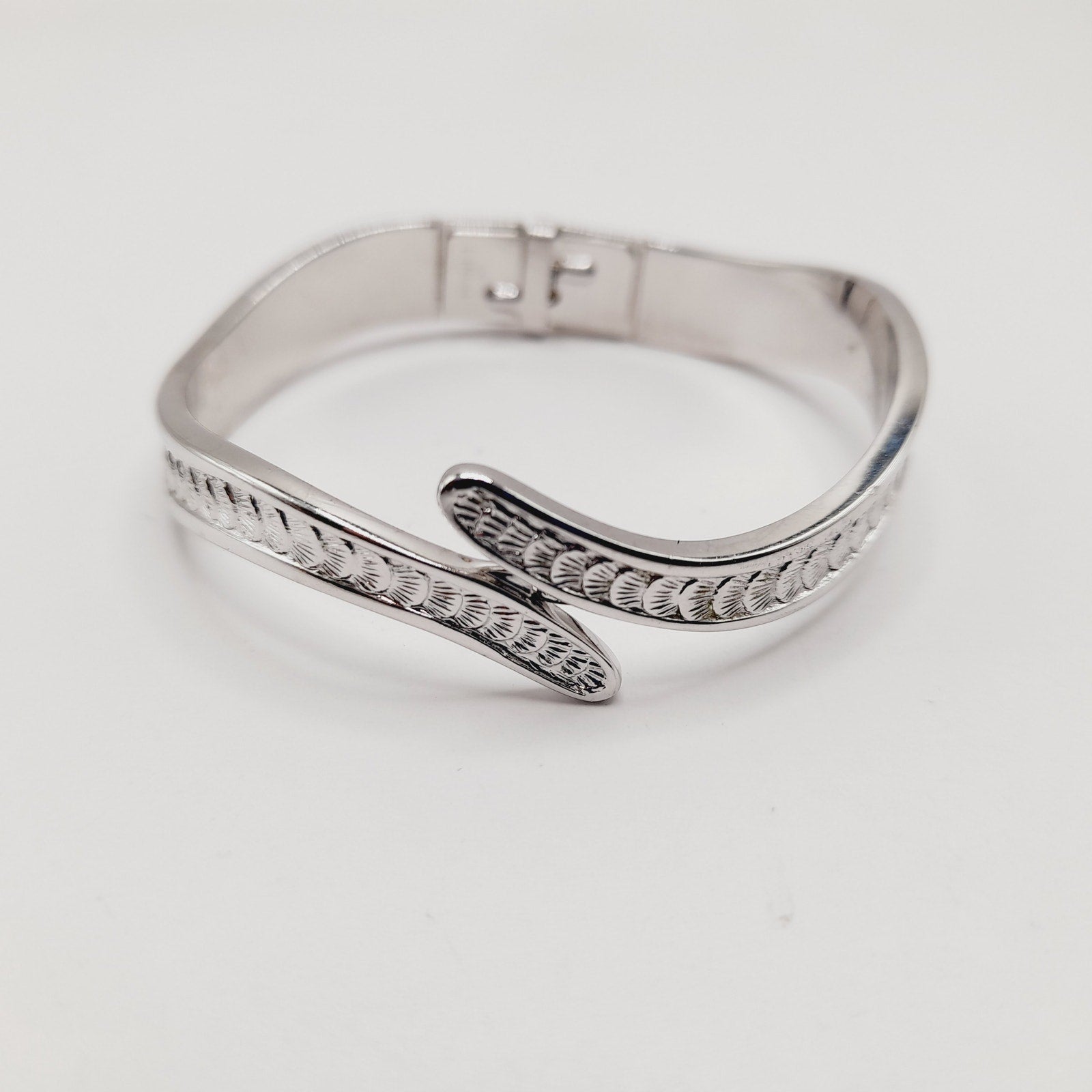The bracelet measures 6 inches on the inside when closed, and opens up to about 2 inches—the hinge then automatically returns it to its original shape. Strong, secure, and easy to wear, this is a classic piece that complements any style!