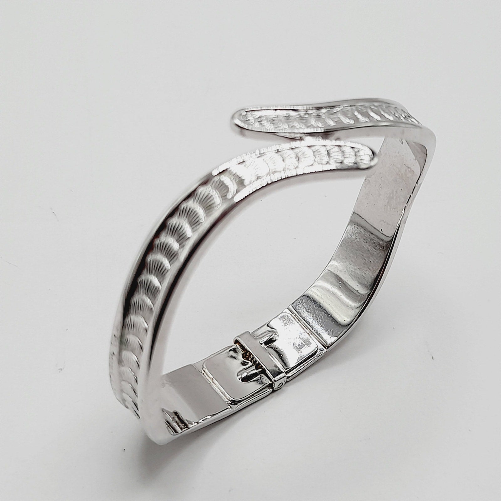 This beautiful vintage Monet hinged bracelet features a sleek rhodium-plated finish with a textured scalloped design along the exterior. The inside is stamped MONET, confirming its quality craftsmanship.