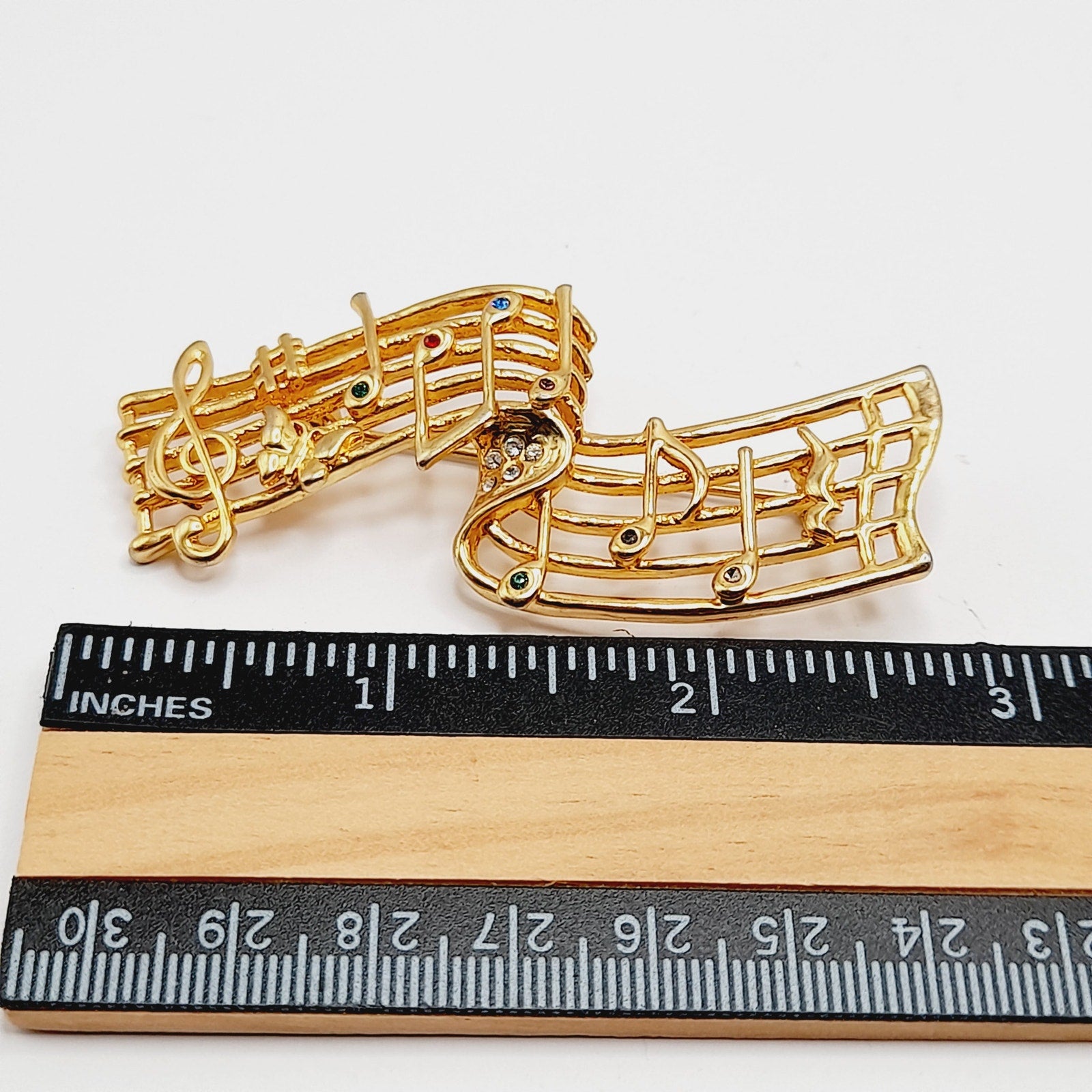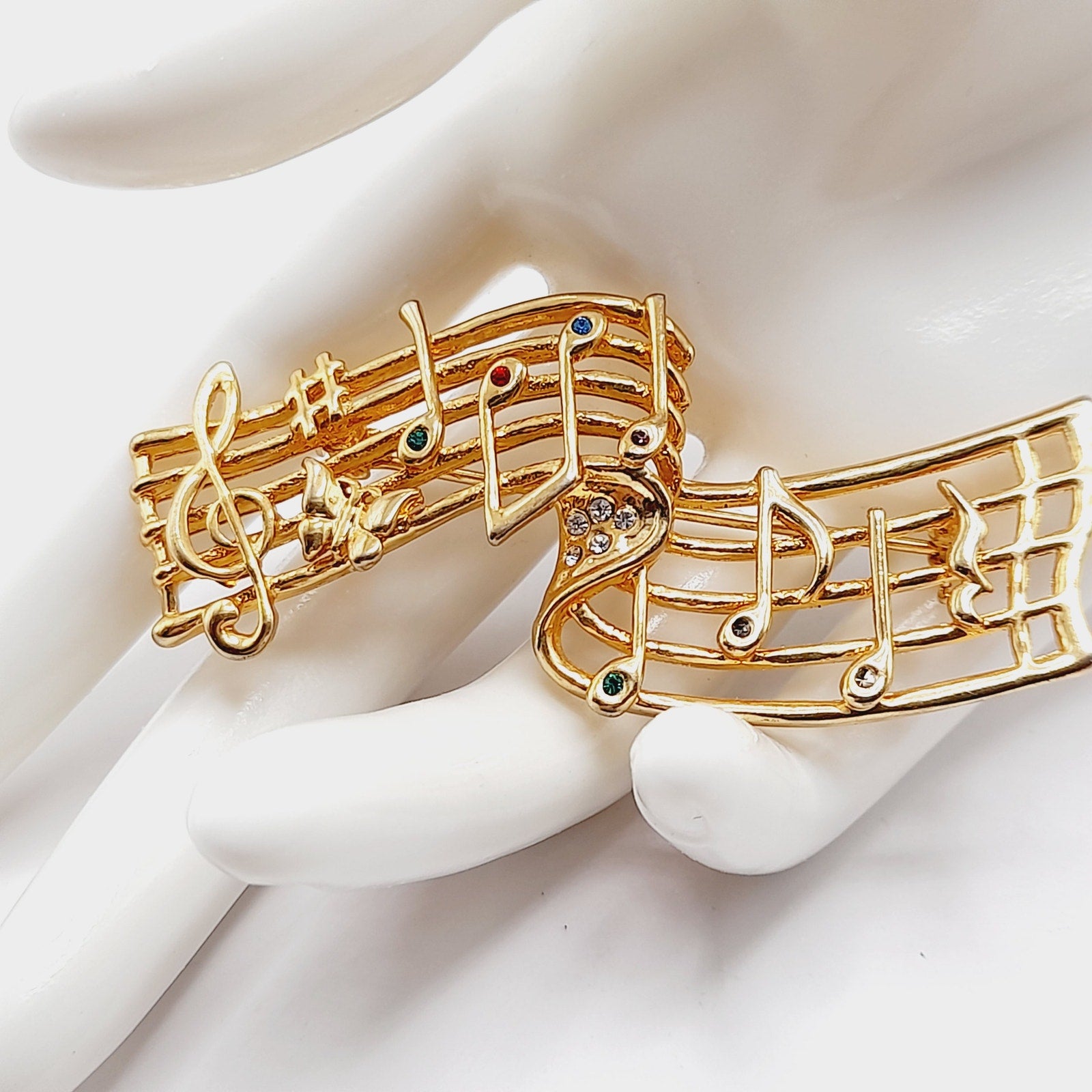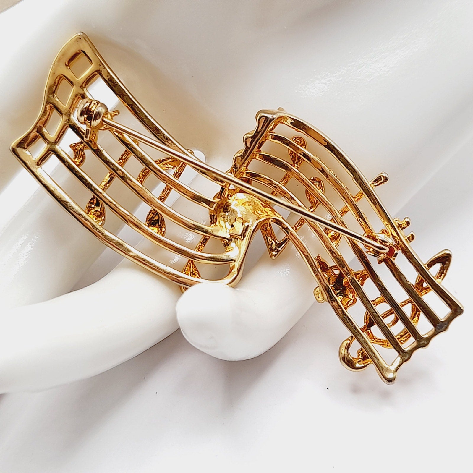 Vintage Musical Notes Brooch Gold Tone Music Staff Pin with Rhinestones – 2.75”