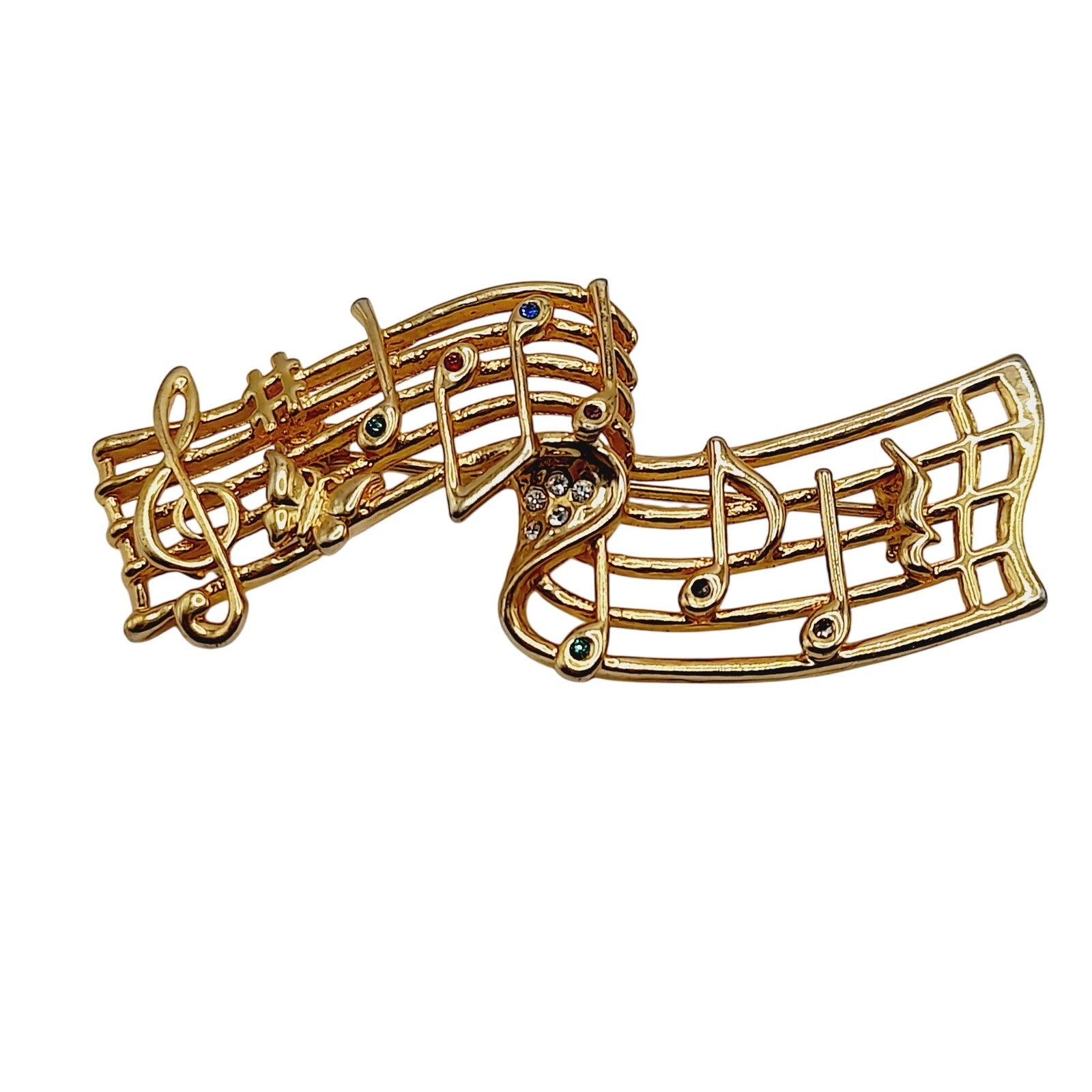 This beautiful vintage brooch celebrates the love of music with an elegant design featuring a flowing music staff and raised musical notes accented by sparkling rhinestones. Crafted in a rich gold-tone finish, this statement pin measures approximately 2 3/4 inches wide and features vibrant multi-colored accents for an eye-catching look.