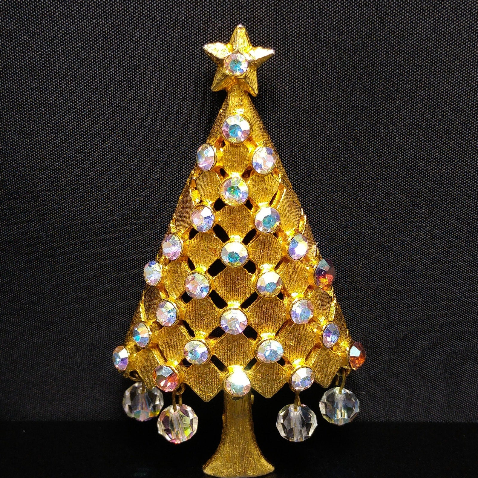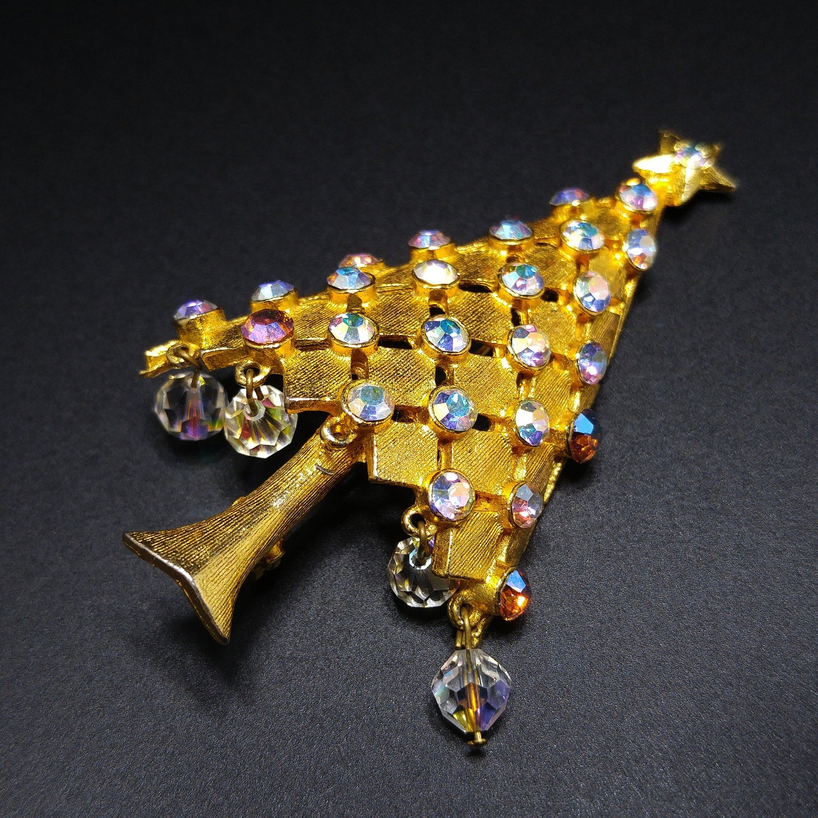 Vintage MYLU Christmas Tree Brooch – AB Rhinestones, Dangling Crystals, 1960s