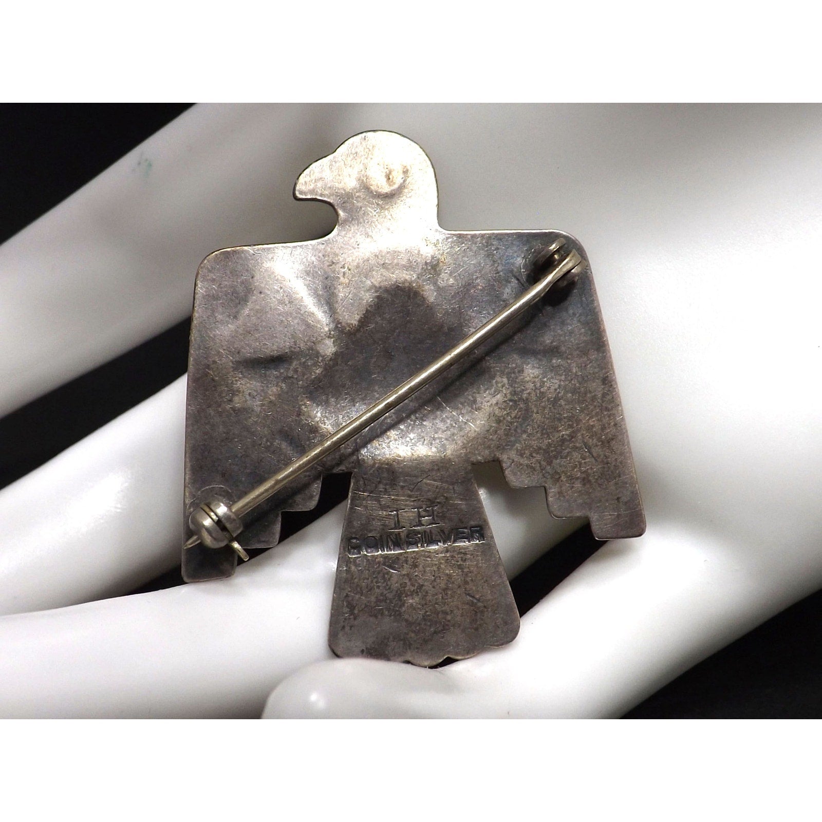 This is a stunning vintage Native American coin silver thunderbird brooch, hand-crafted and stamped IH COINSILVER on the reverse. The piece is made of 900 silver (coin silver), slightly less pure than sterling, giving it a distinct warm patina and aged character.