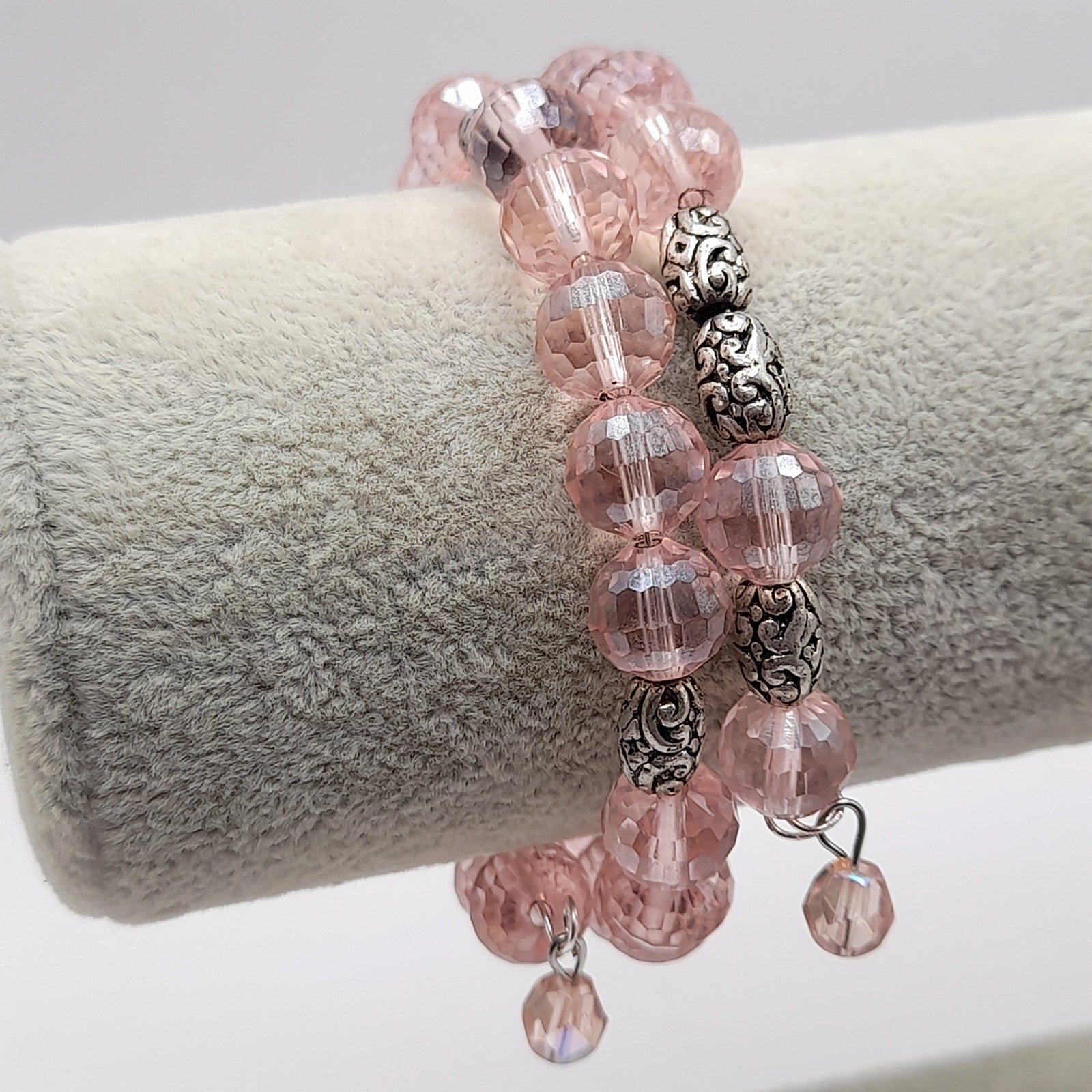 This vintage pink crystal memory wire bracelet or choker necklace is a versatile and sparkling piece of mid-century jewelry. Designed with faceted pink crystal beads in a chess-cut style, it beautifully catches the light from every angle. The memory wire construction allows it to comfortably wrap around the wrist as a bracelet or be worn as a 15-inch choker-style necklace, making it a unique convertible accessory.