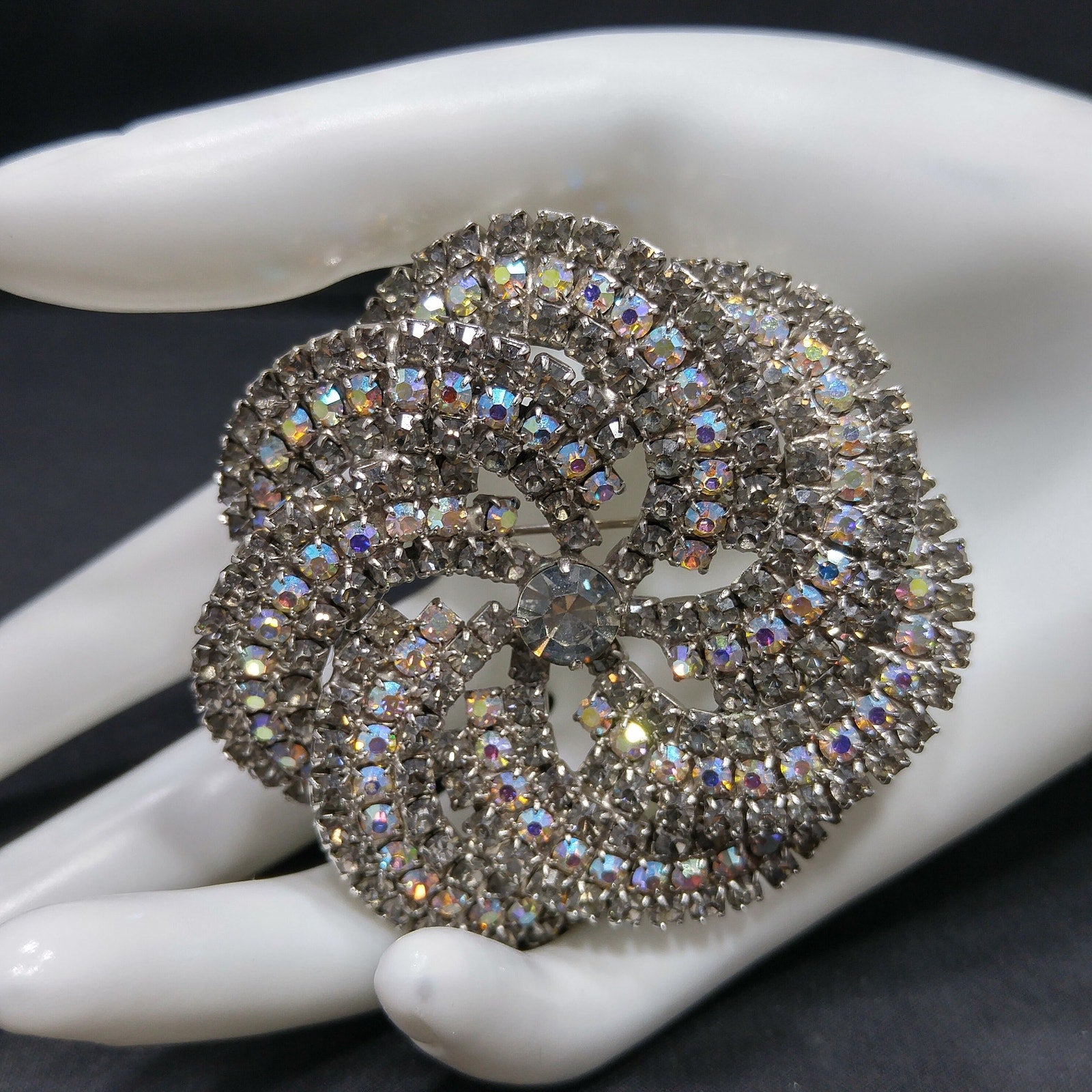 Vintage Pinwheel Rhinestones Brooch, AB Rhinestones, Rhodium Plated, 1960s