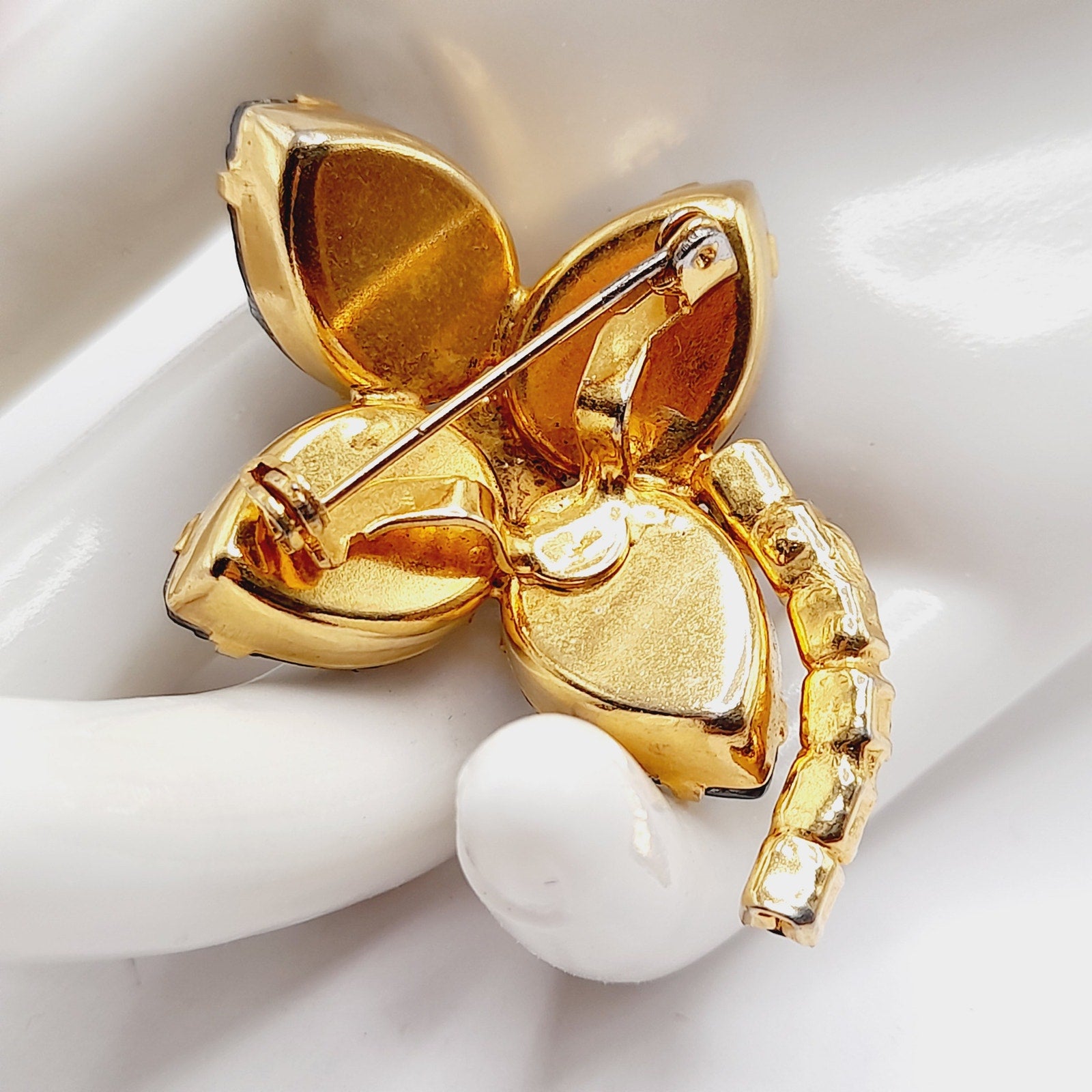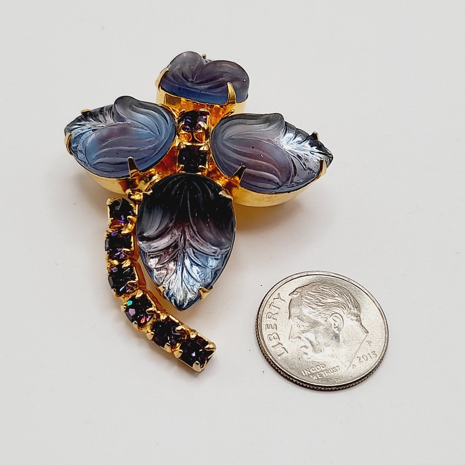 This stunning vintage purple glass leaf brooch features beautifully carved frosted glass petals in shades of lavender and amethyst. The floral design is accented with a curved row of sparkling prong-set purple rhinestones, set in rich gold-plated metal.