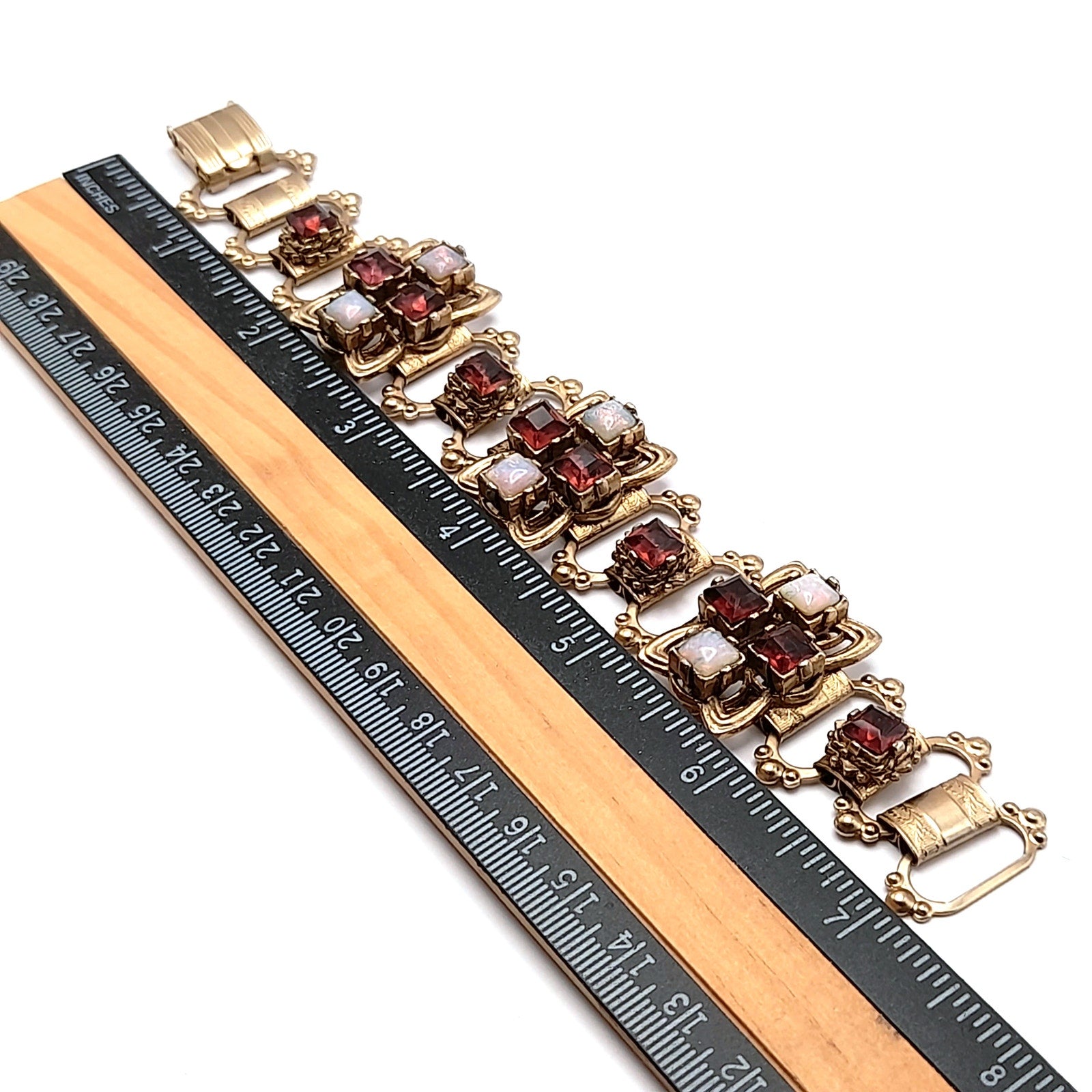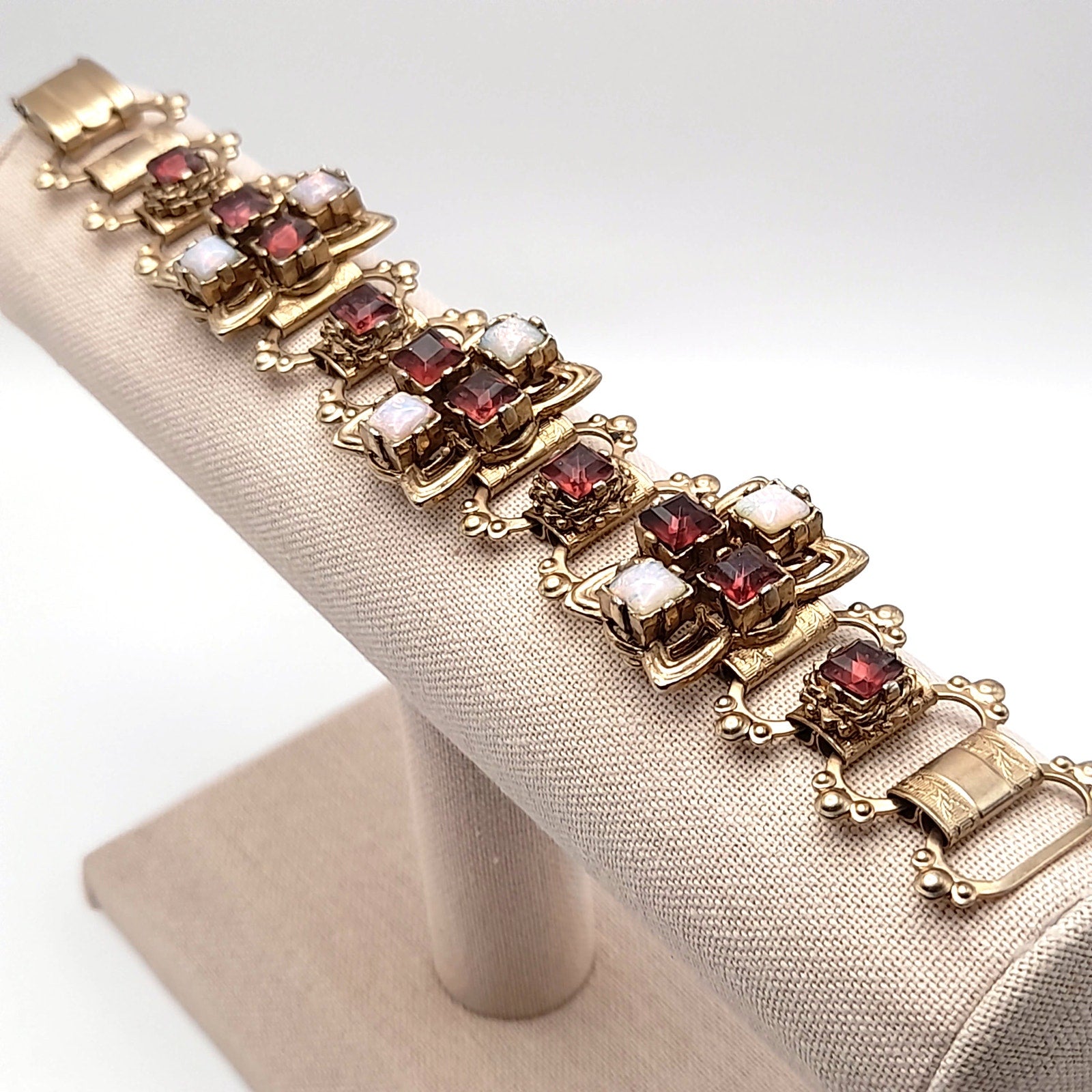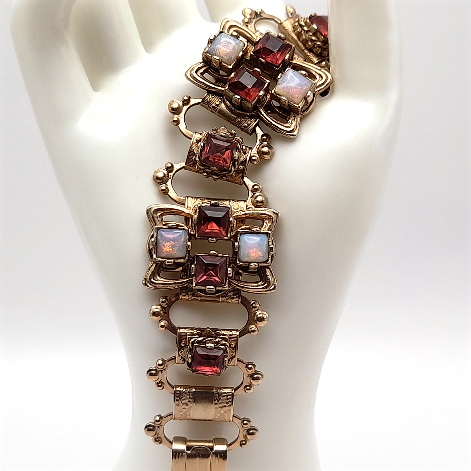 This vintage bracelet features a beautiful purple opalescent cabochon design. The book chain adds a unique and elegant touch. Perfect for adding a pop of color and vintage charm to any outfit. A stunning piece for collectors and fashion enthusiasts alike! This piece is in excellent condition and ready to wear or gift.