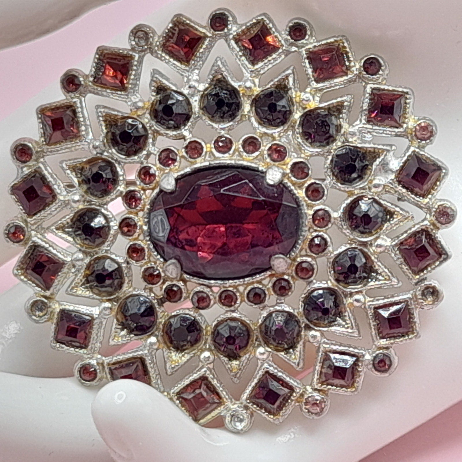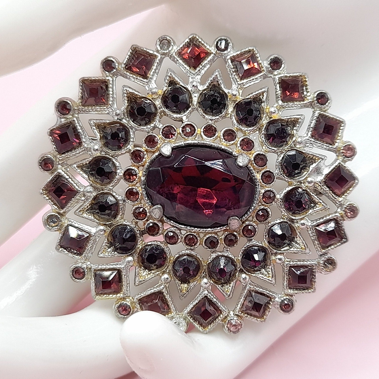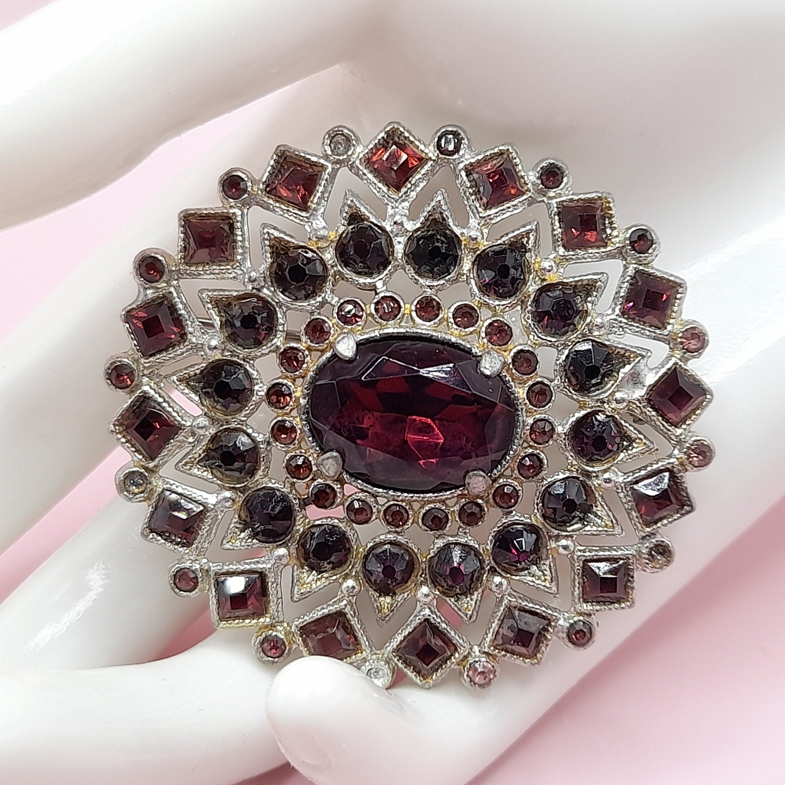 Description: This is a beautiful 1930s purple rhinestone pot metal brooch with a center purple large faceted glass stone and surrounded by hand cut purple glass rhinestones in square and round shapes. There are four tiny rhinestones missing along the edges but for almost 100 years old, it is in very good condition. The clasp is a C clasp. See photos for more clarification of details.